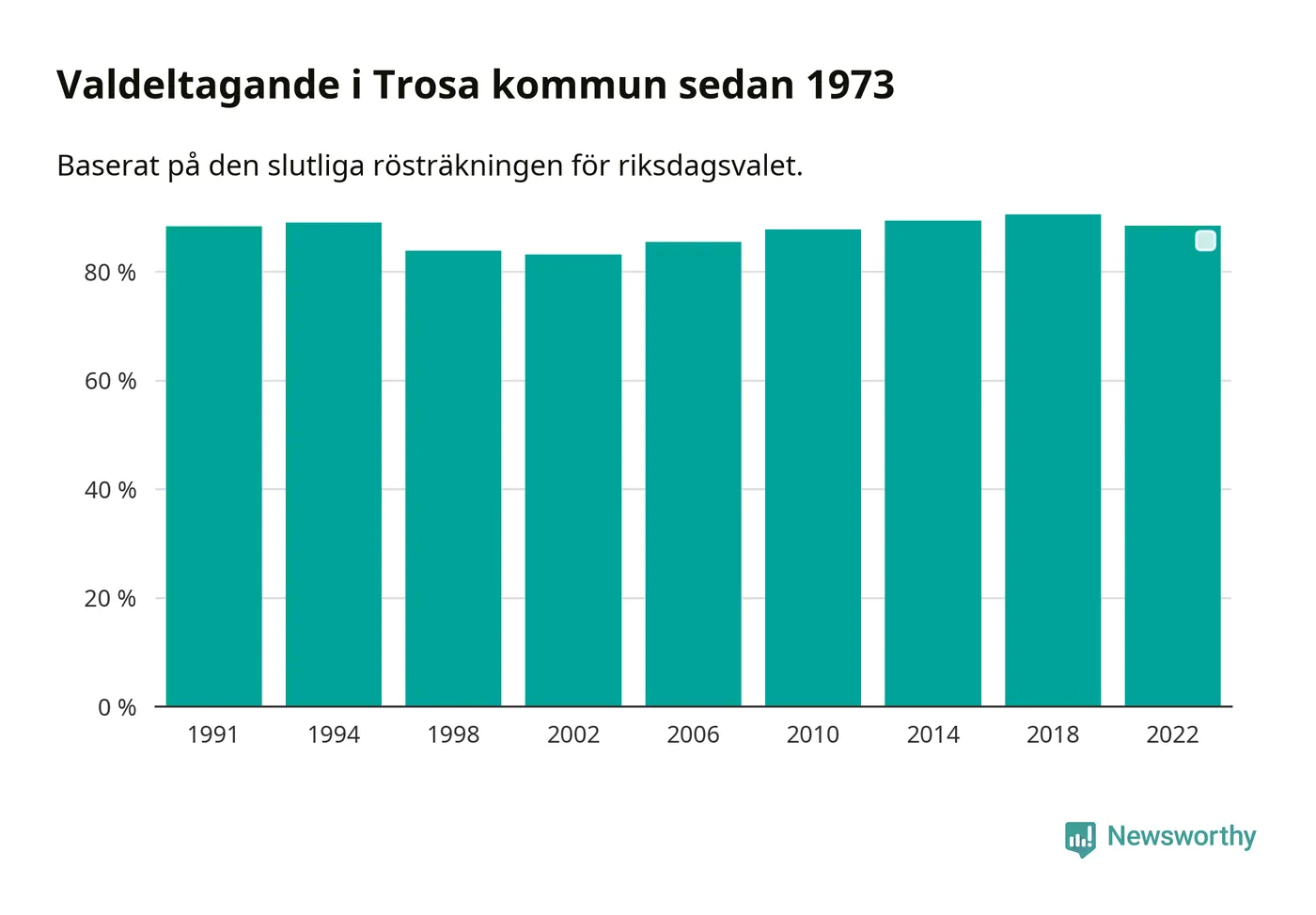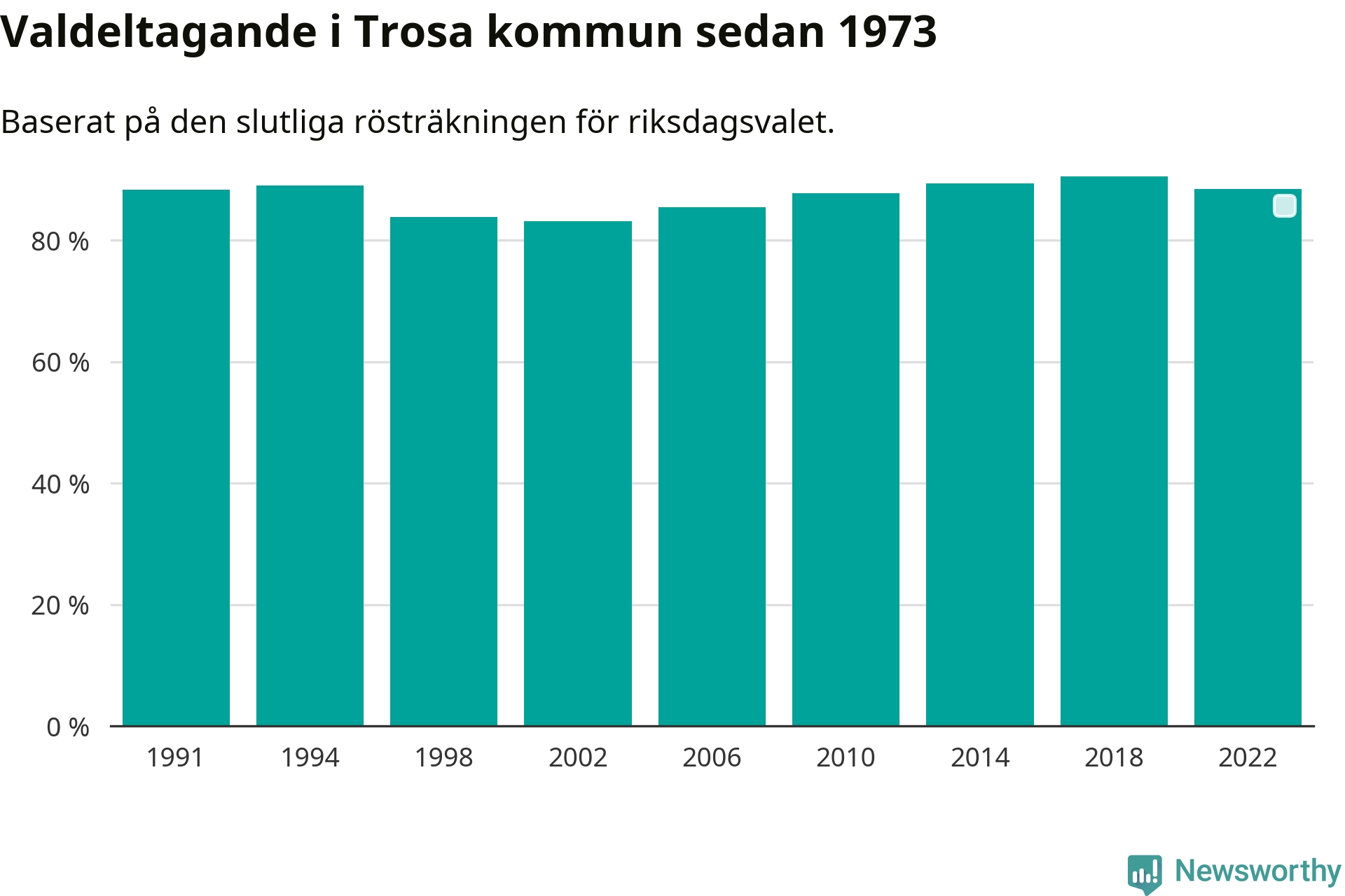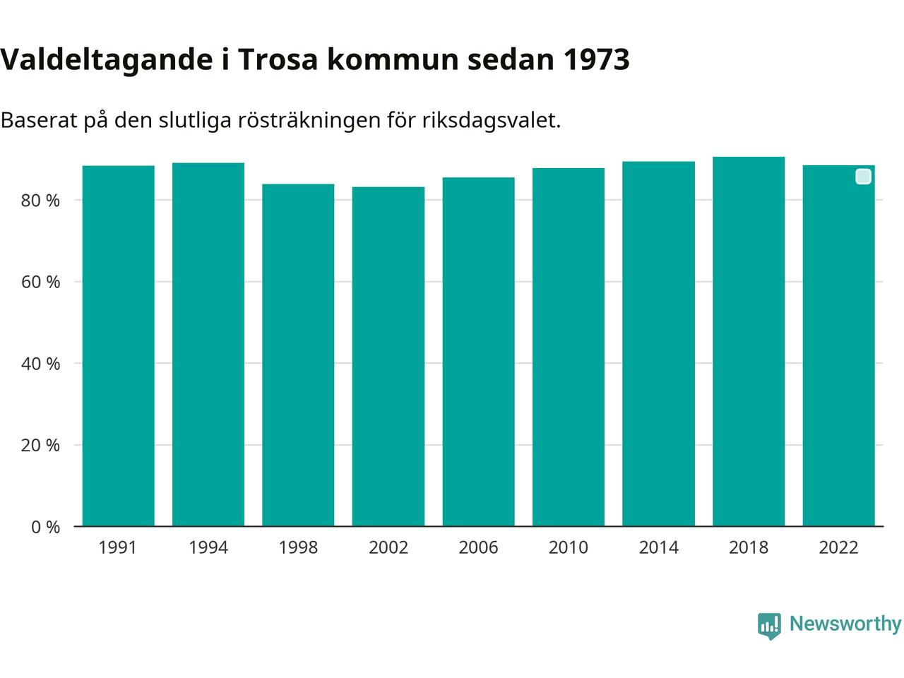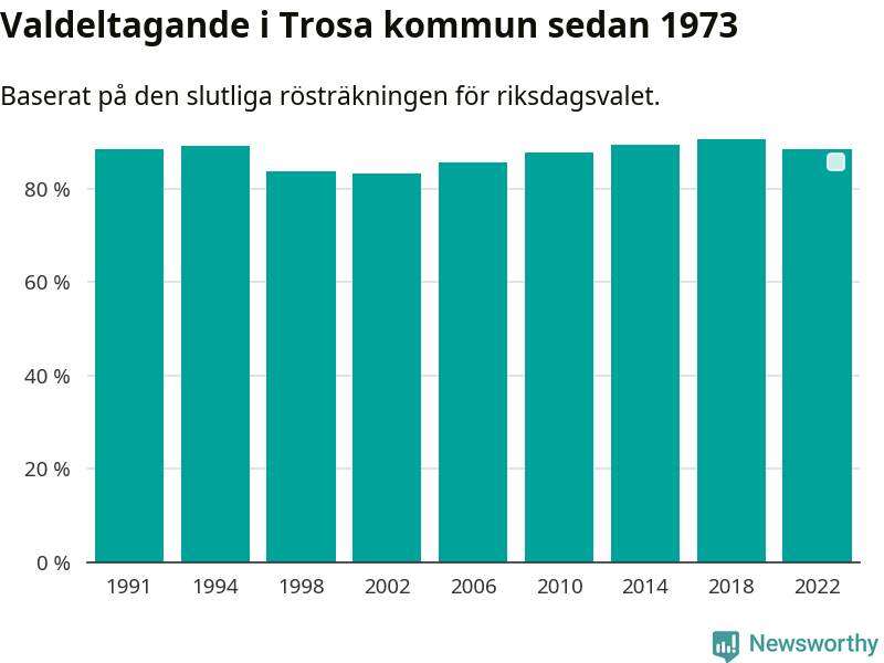 Trosa tillhör Södermanlands läns valkrets. Där var valdeltagandet förra valet 83,5 procent. I hela riket landade valdeltagandet 2022 på 84,21 procent, att jämföra med 87,18 procent 2018.