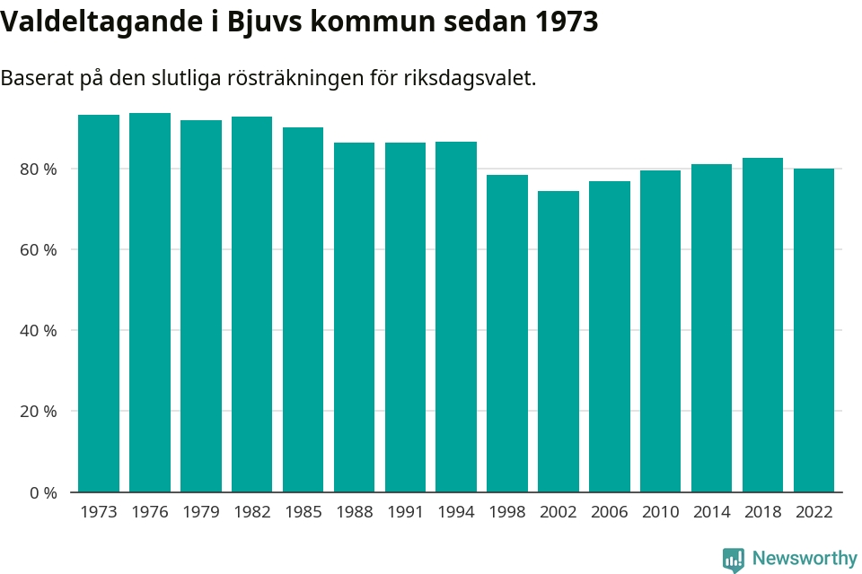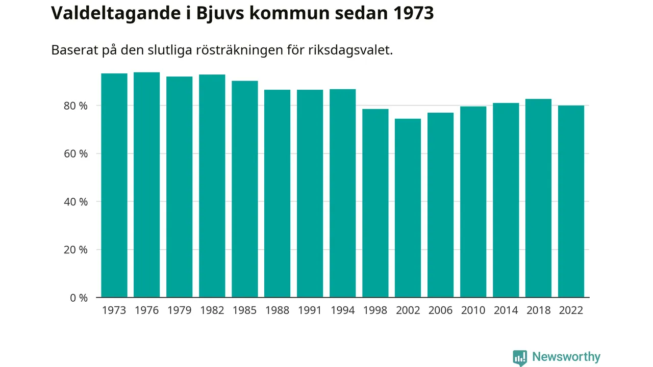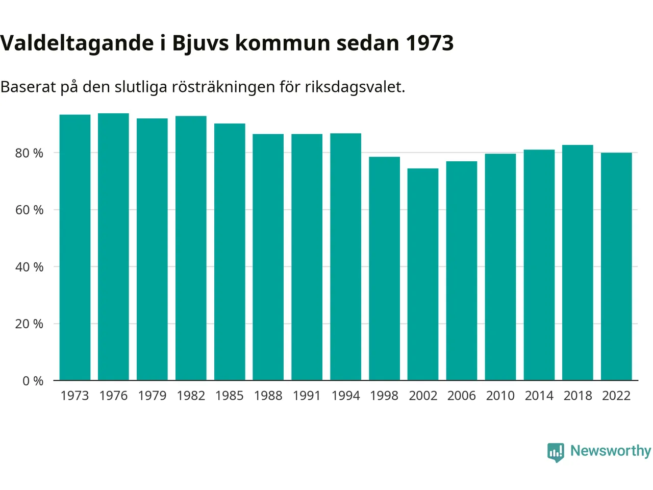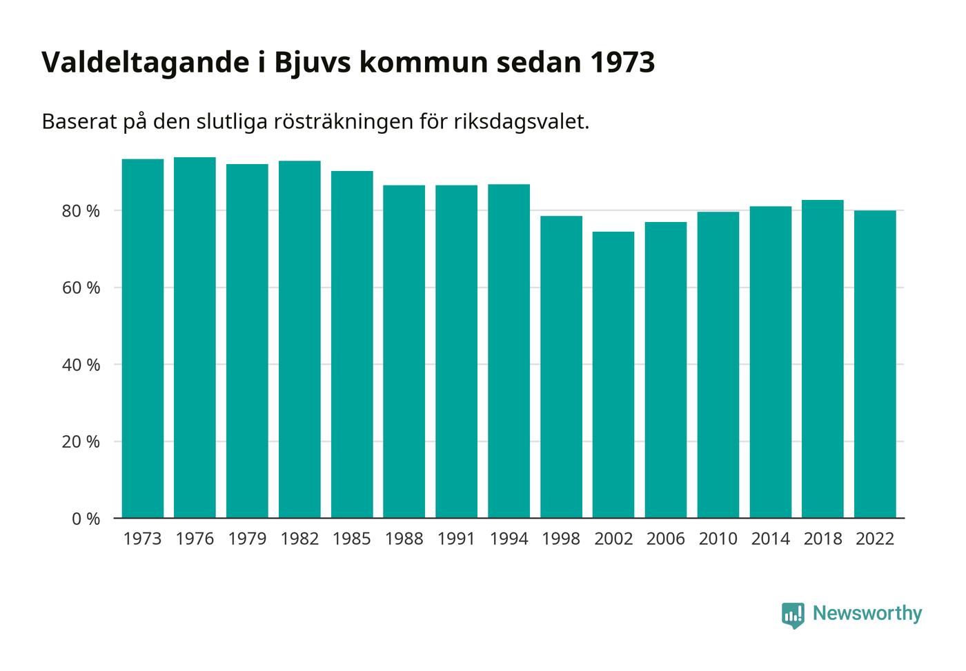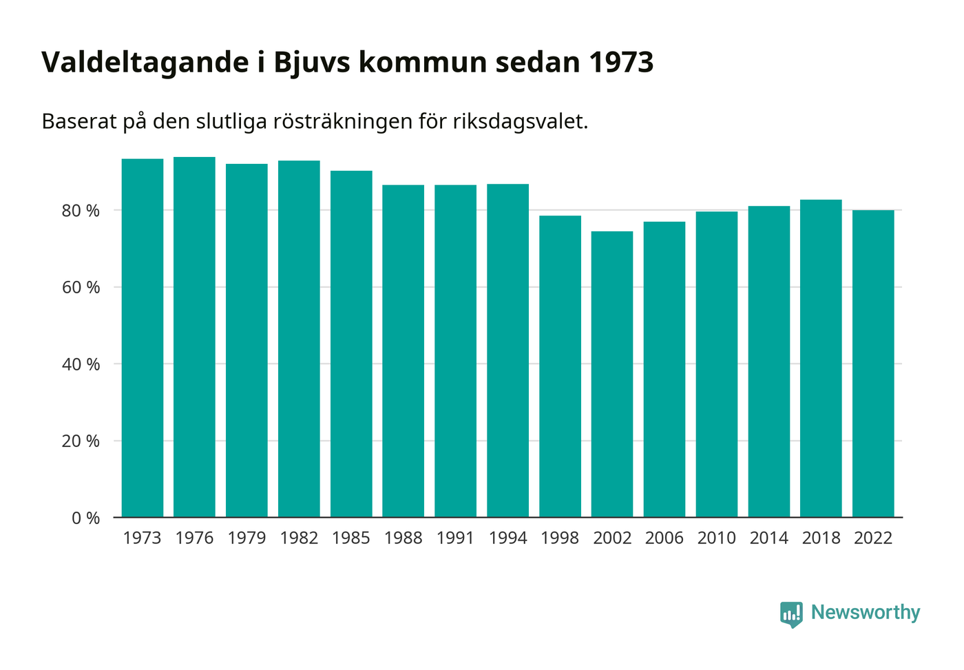 Bjuv tillhör Skåne läns västra valkrets. Där var valdeltagandet förra valet 81,9 procent. I hela riket landade valdeltagandet 2022 på 84,21 procent, att jämföra med 87,18 procent 2018.