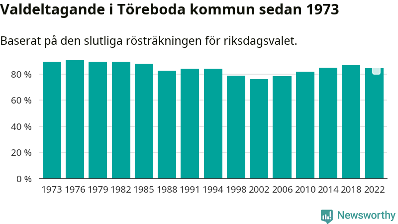 Töreboda hade det tredje lägsta valdeltagadet av alla kommuner i Västra Götalands läns östra valkrets under 2022. Allra lägst var det i Gullspångs kommun, 83,4 procent, medan 89,1 procent röstade i Karlsborgs kommun.