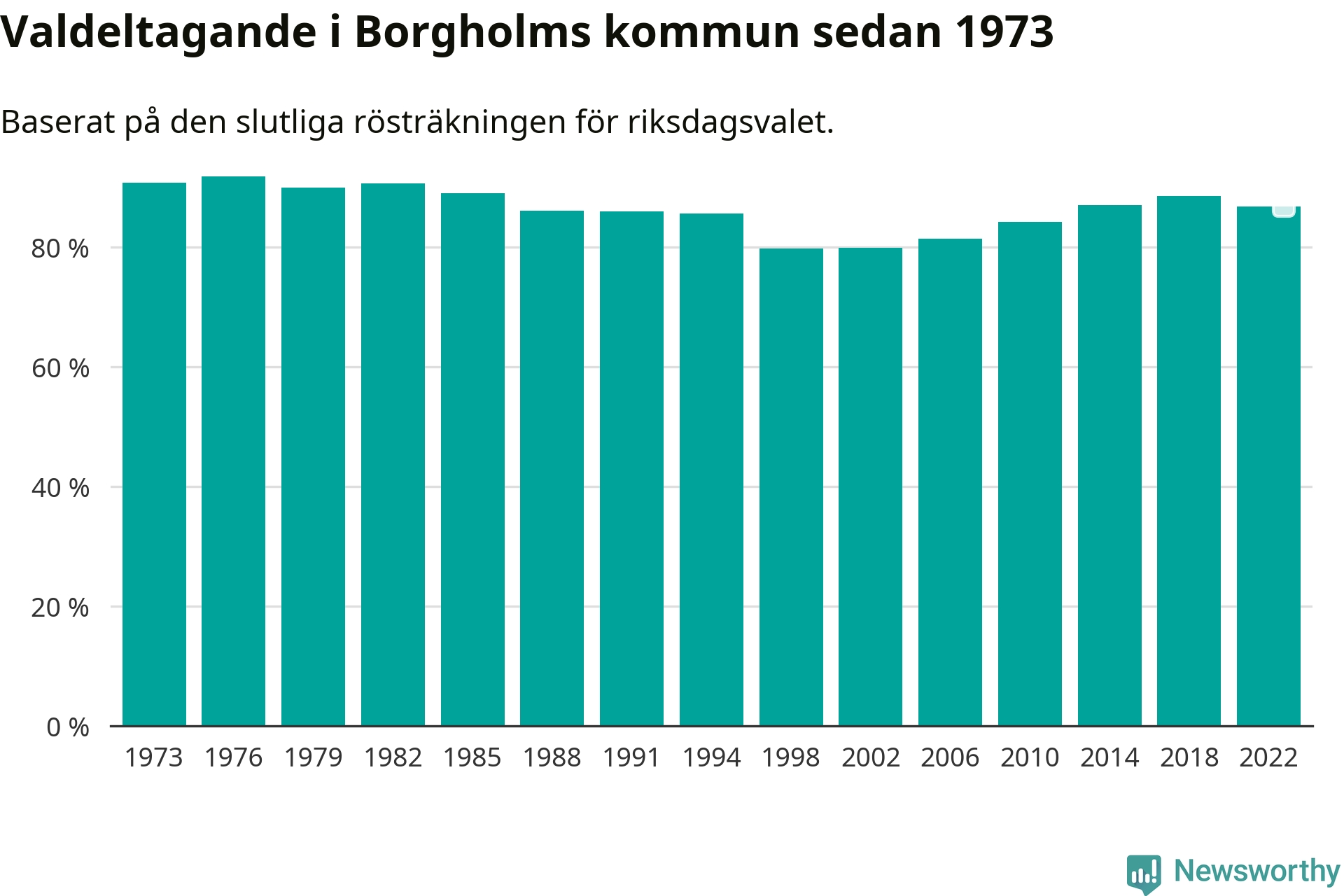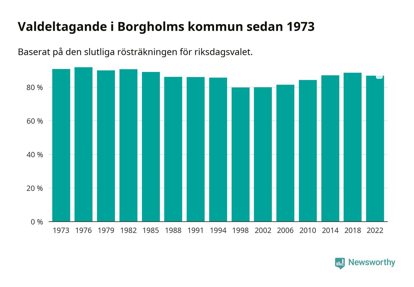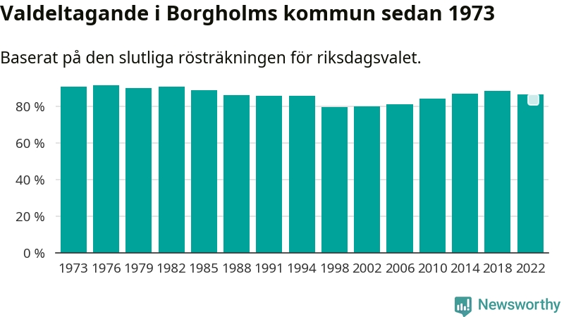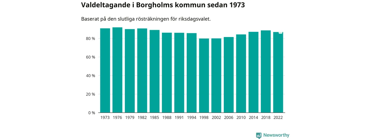 Borgholm tillhör Kalmar läns valkrets. Där var valdeltagandet förra valet 86,0 procent. I hela riket landade valdeltagandet 2022 på 84,21 procent, att jämföra med 87,18 procent 2018.