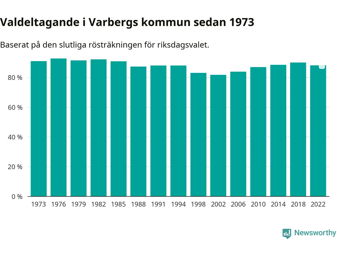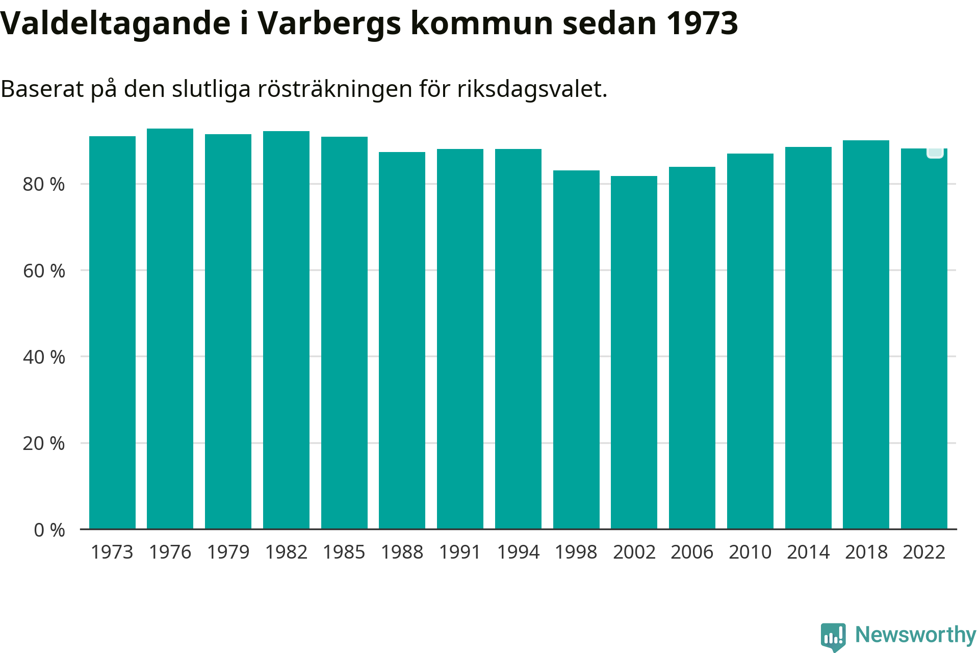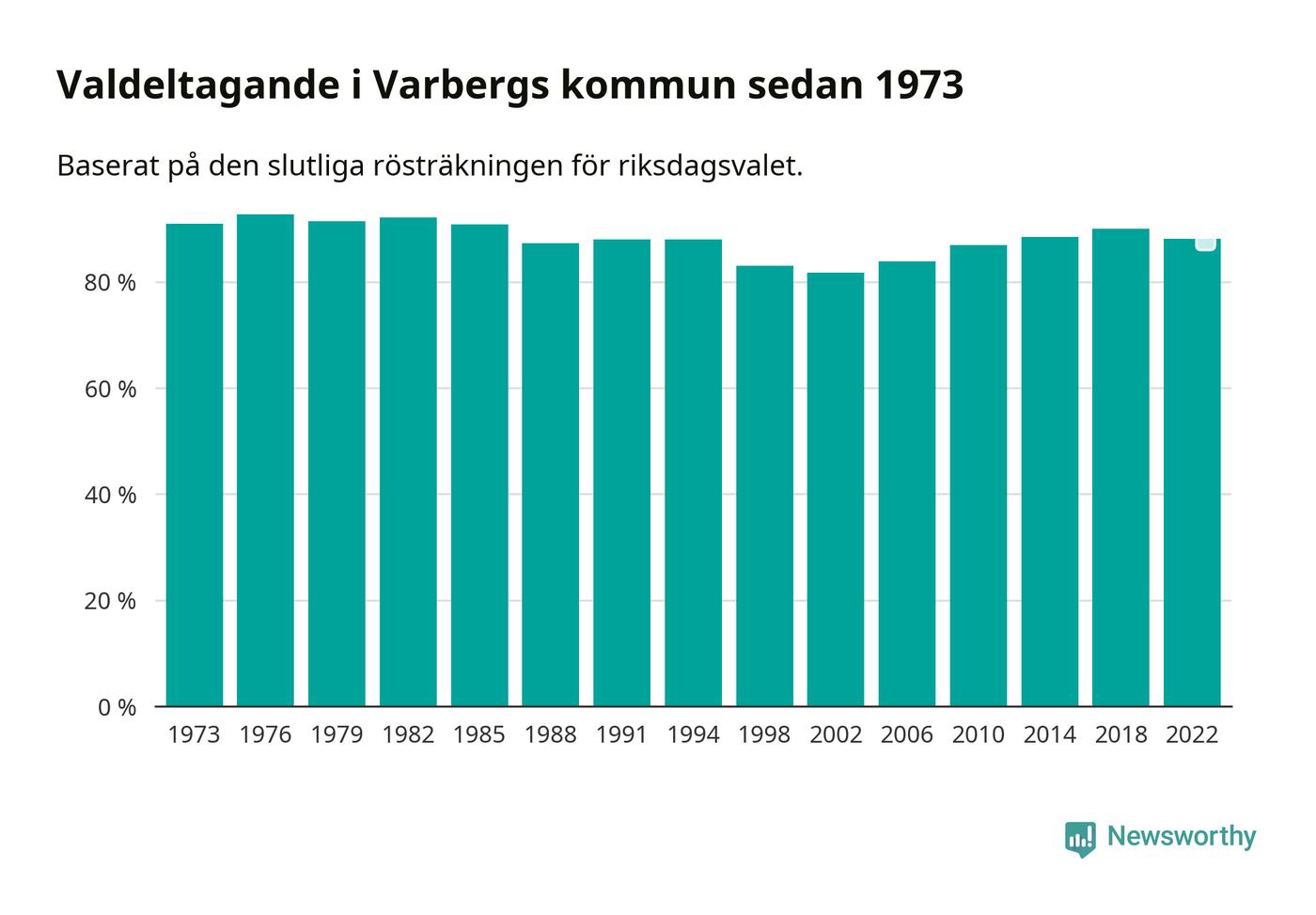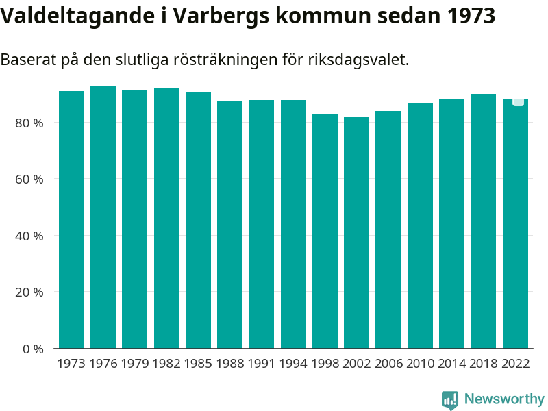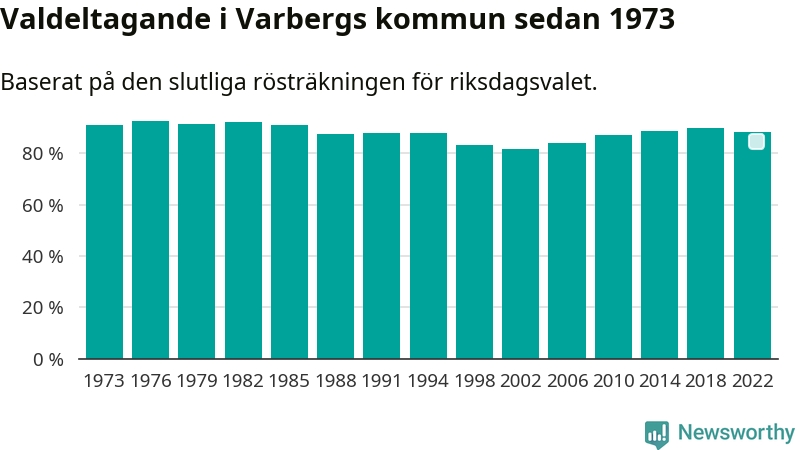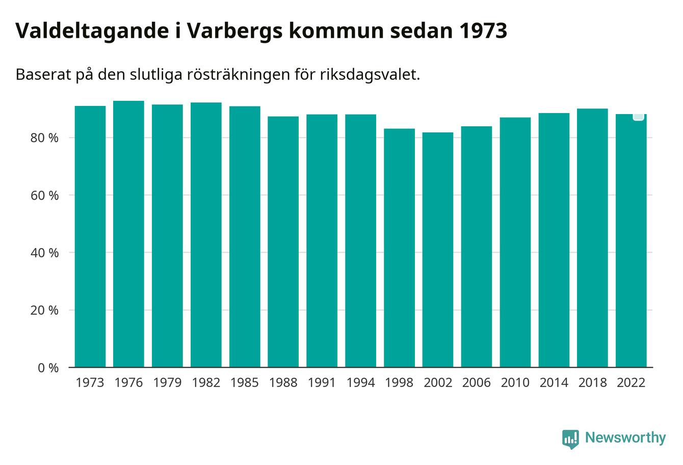 Varberg tillhör Hallands läns valkrets. Där var valdeltagandet förra valet 86,6 procent. I hela riket landade valdeltagandet 2022 på 84,21 procent, att jämföra med 87,18 procent 2018.