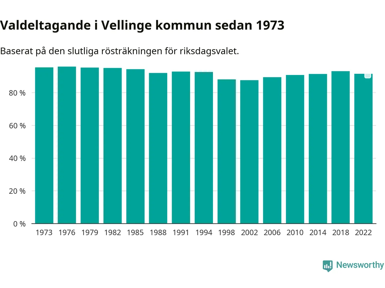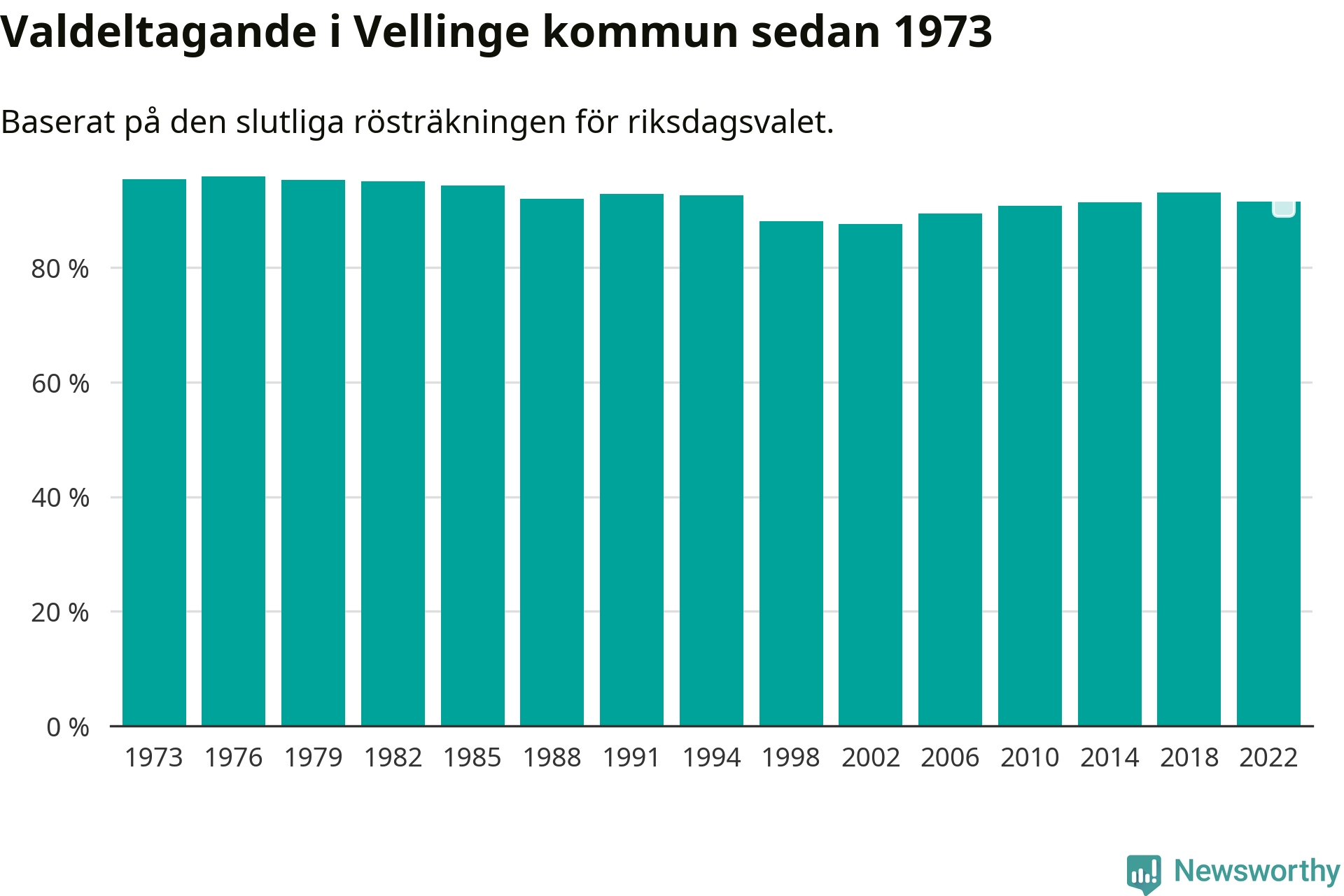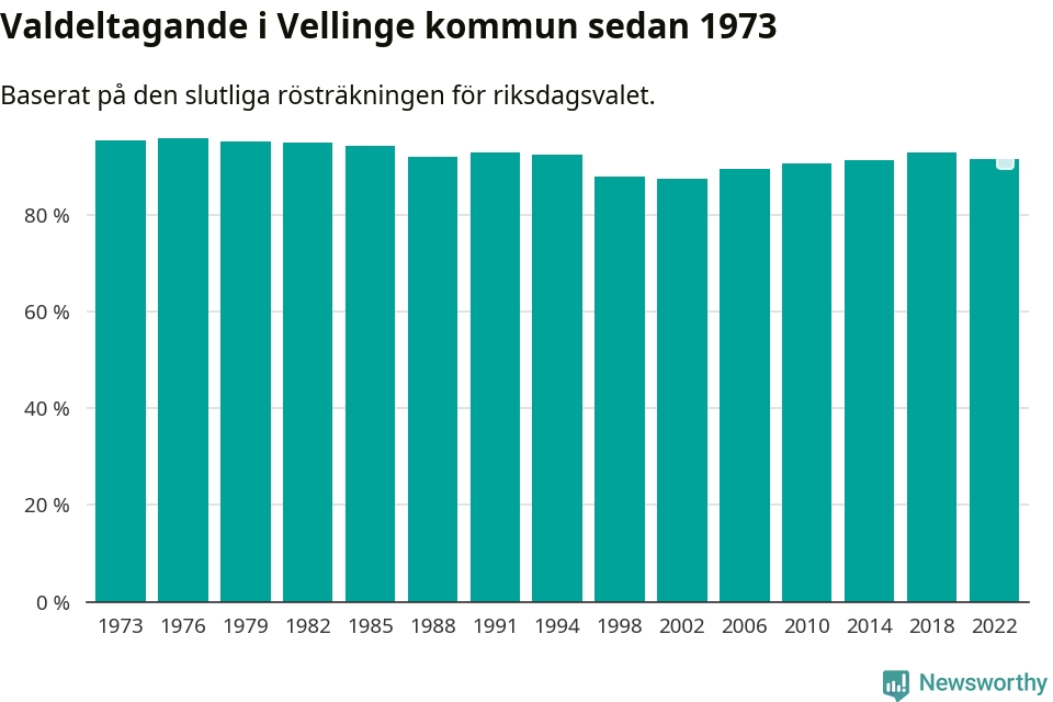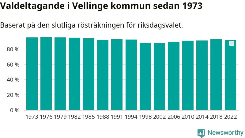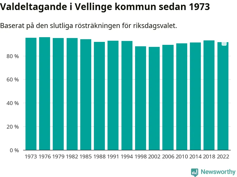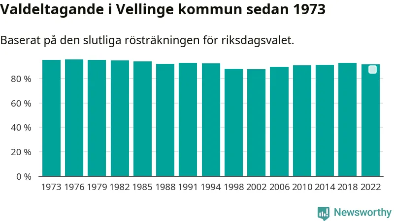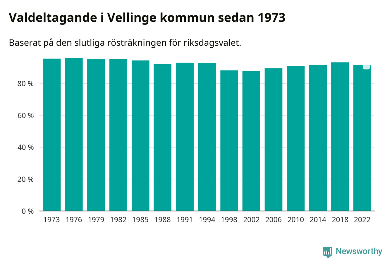 Vellinge hade det näst högsta valdeltagadet av alla kommuner i landet under 2022. Allra högst var det i Lomma kommun, 92,4 procent, medan bara 69,1 procent röstade i Haparanda kommun.