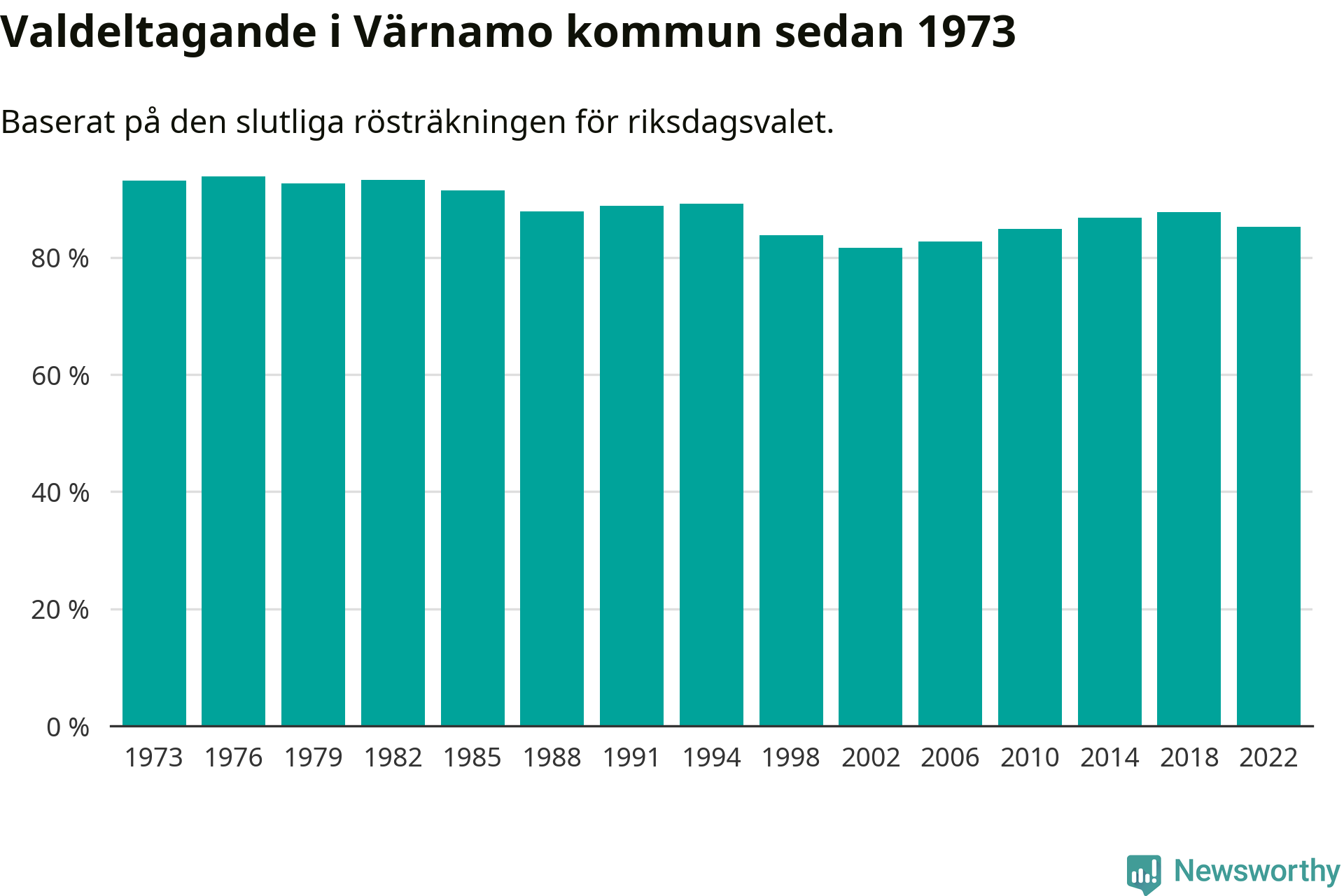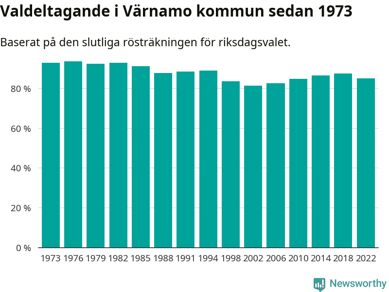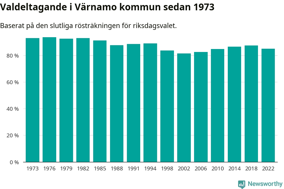 Värnamo tillhör Jönköpings läns valkrets. Där var valdeltagandet förra valet 85,3 procent. I hela riket landade valdeltagandet 2022 på 84,21 procent, att jämföra med 87,18 procent 2018.