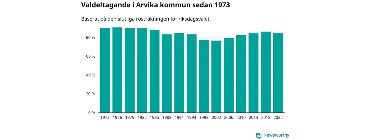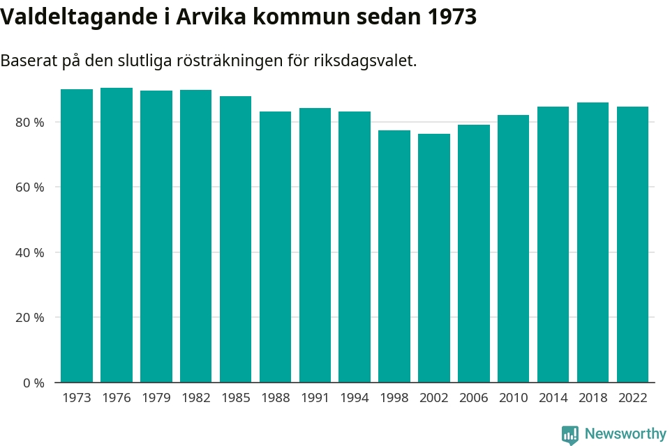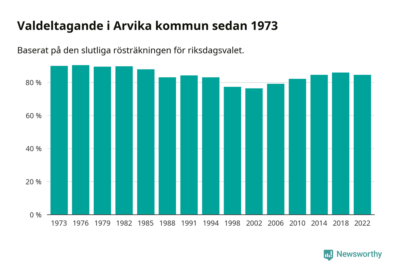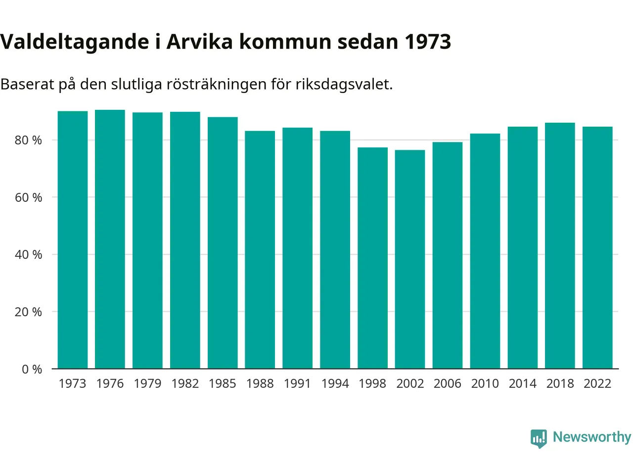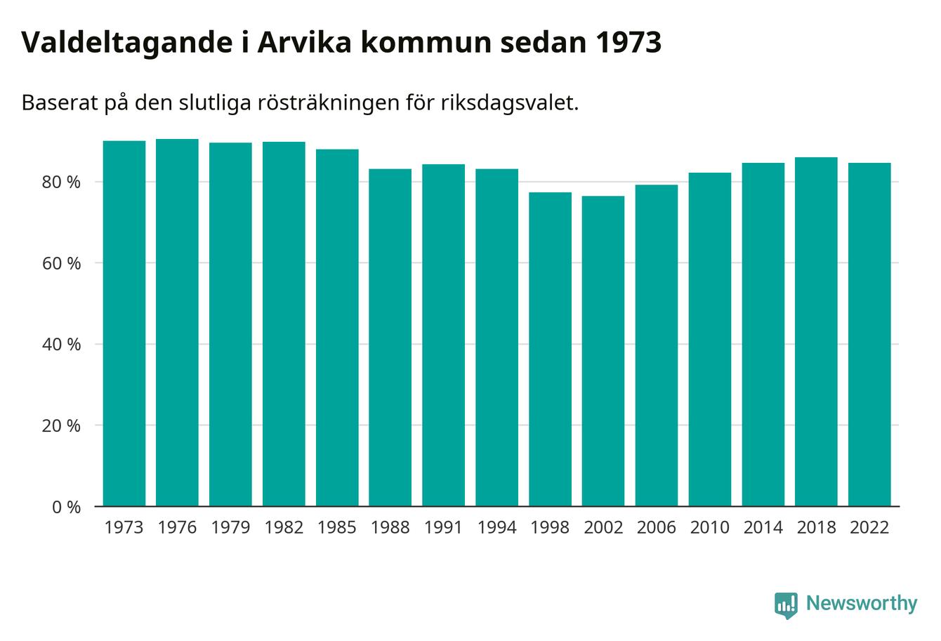 Arvika tillhör Värmlands läns valkrets. Där var valdeltagandet förra valet 85,2 procent. I hela riket landade valdeltagandet 2022 på 84,21 procent, att jämföra med 87,18 procent 2018.
