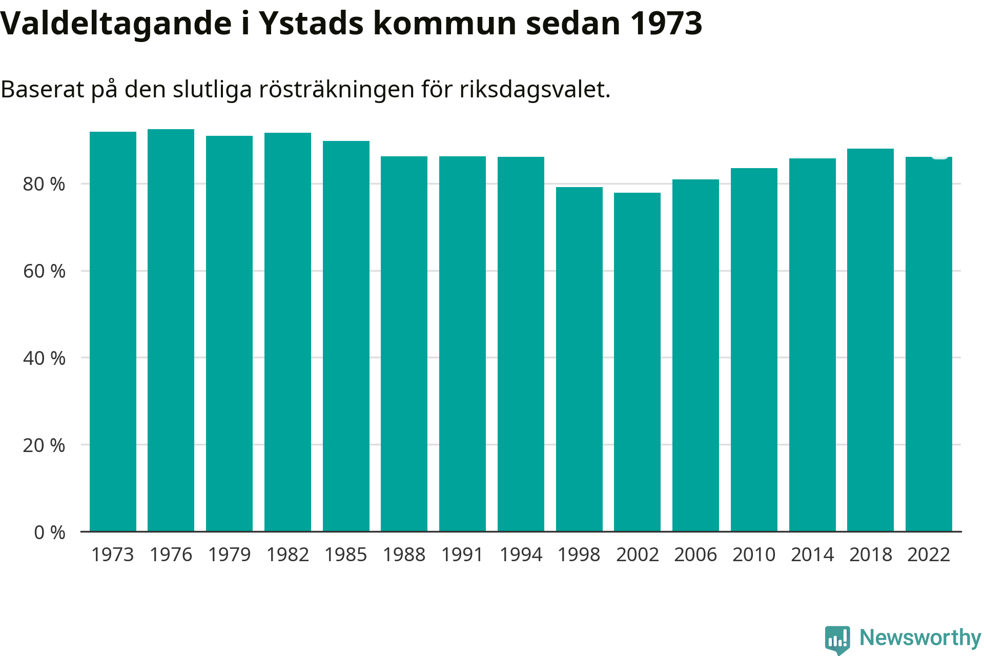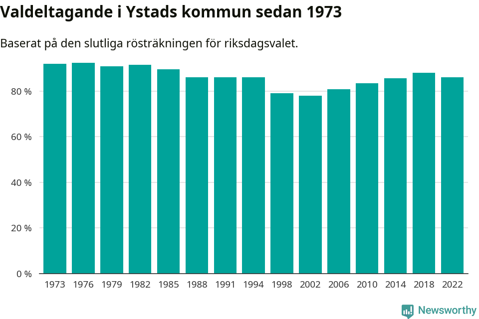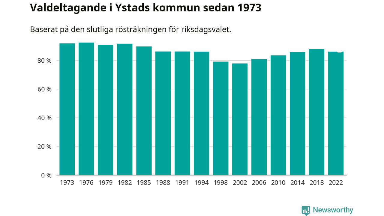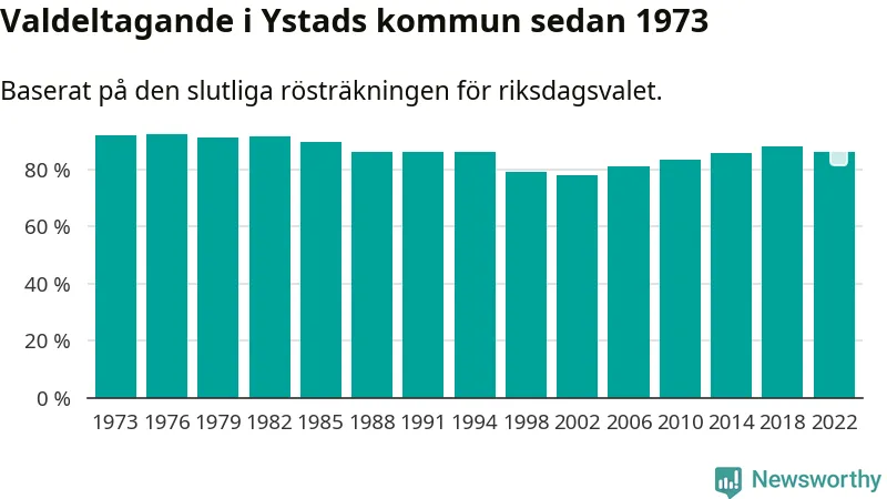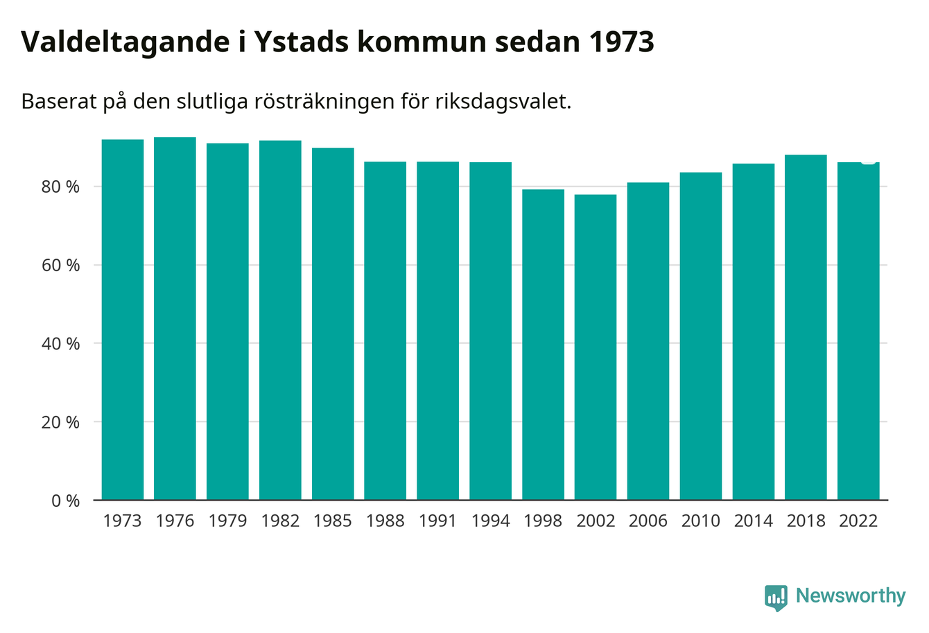 Ystad tillhör Skåne läns södra valkrets. Där var valdeltagandet förra valet 87,3 procent. I hela riket landade valdeltagandet 2022 på 84,21 procent, att jämföra med 87,18 procent 2018.