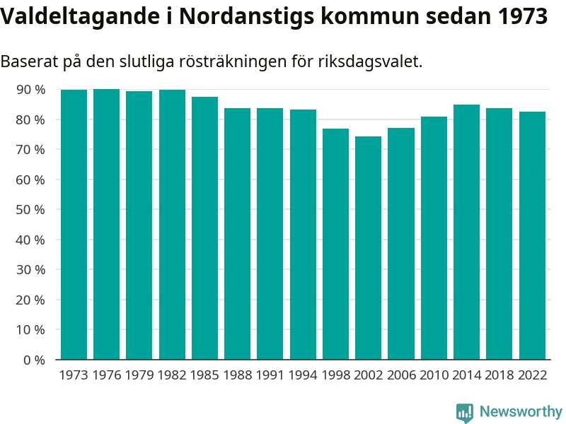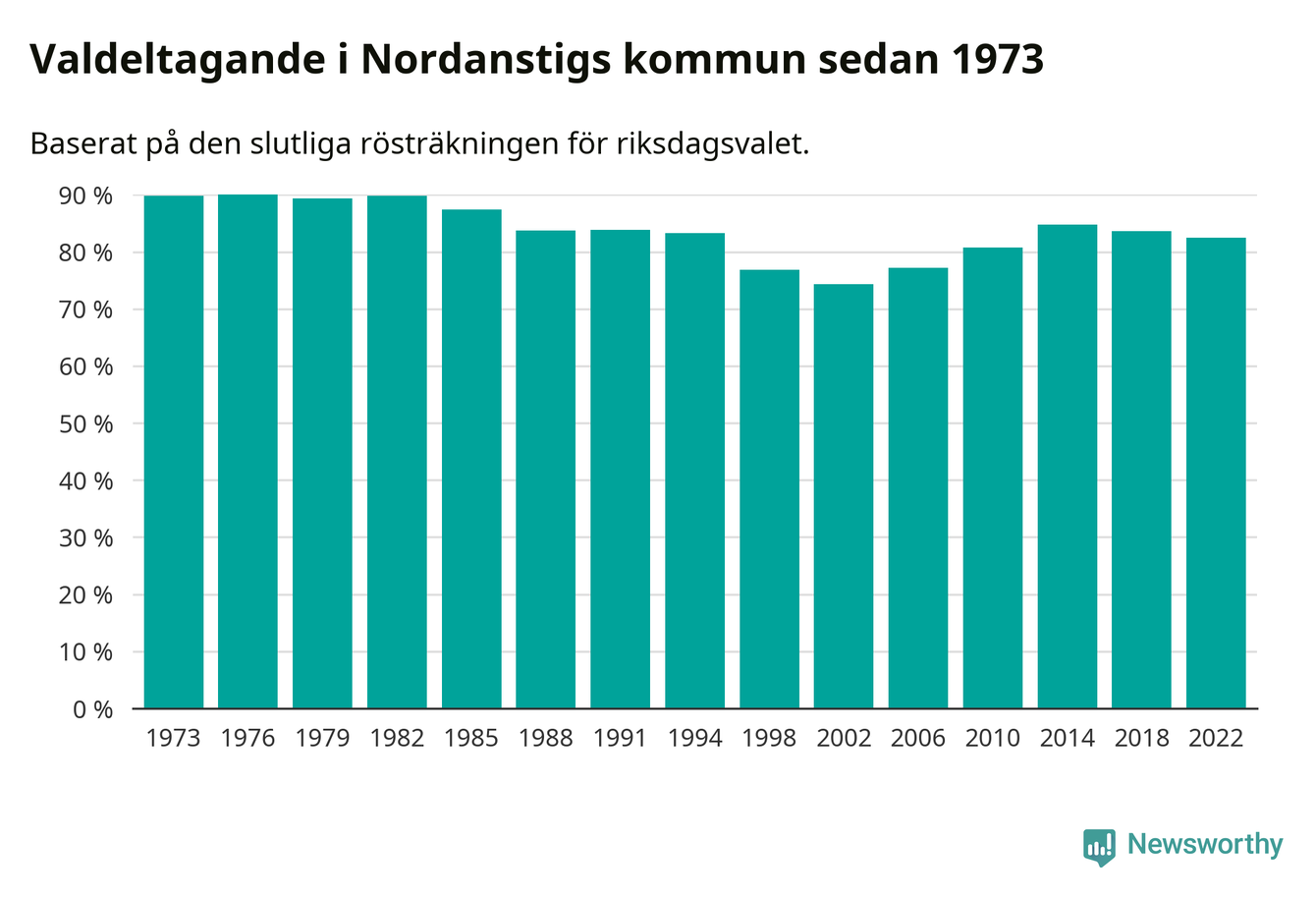 Nordanstig tillhör Gävleborgs läns valkrets. Där var valdeltagandet förra valet 83,5 procent. I hela riket landade valdeltagandet 2022 på 84,21 procent, att jämföra med 87,18 procent 2018.