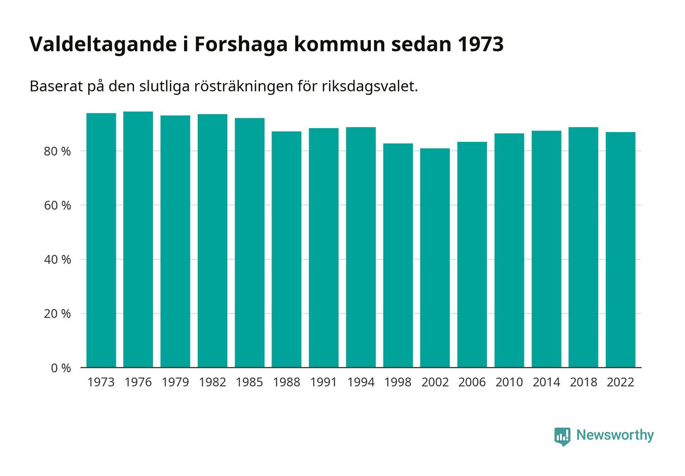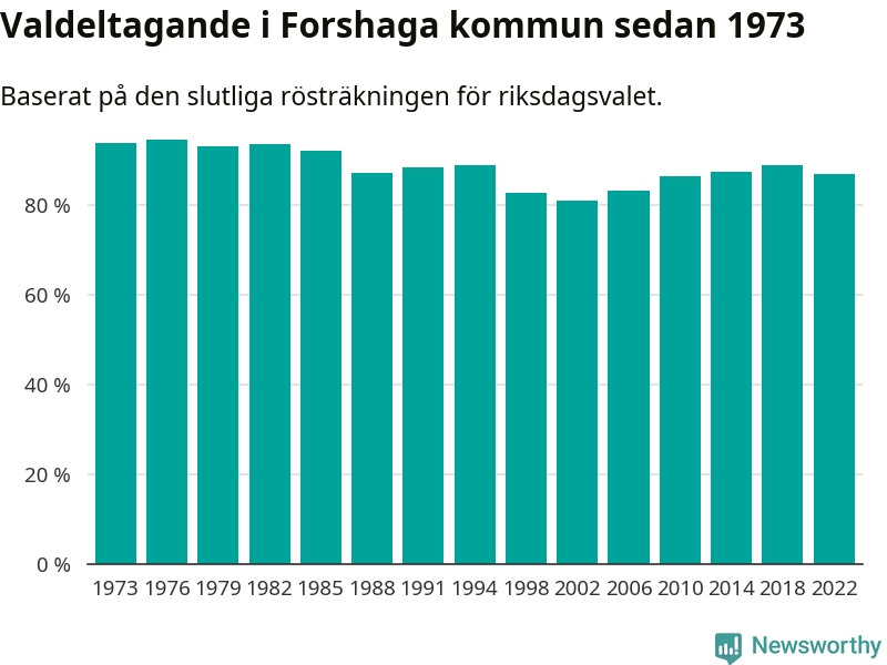 Forshaga tillhör Värmlands läns valkrets. Där var valdeltagandet förra valet 85,2 procent. I hela riket landade valdeltagandet 2022 på 84,21 procent, att jämföra med 87,18 procent 2018.