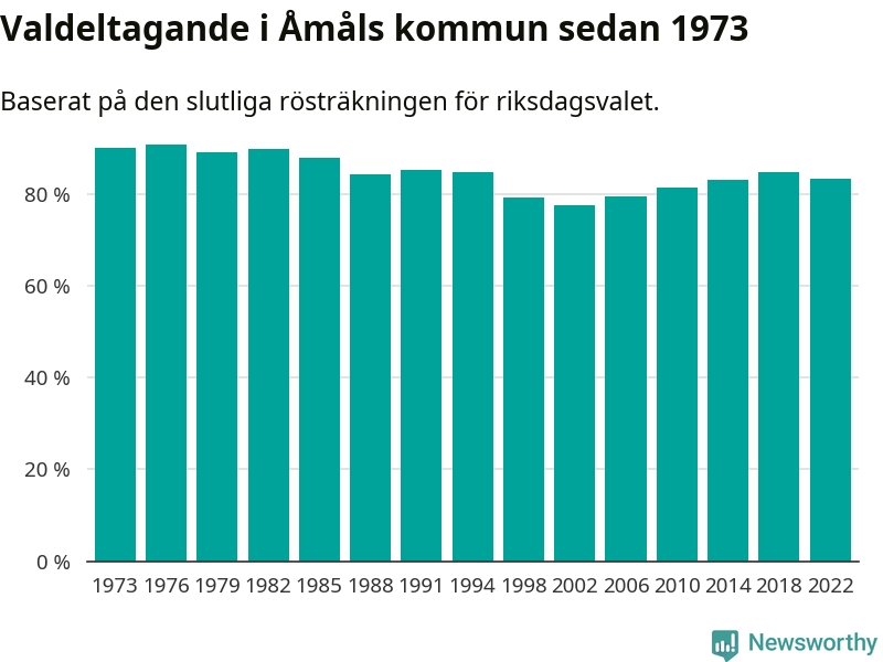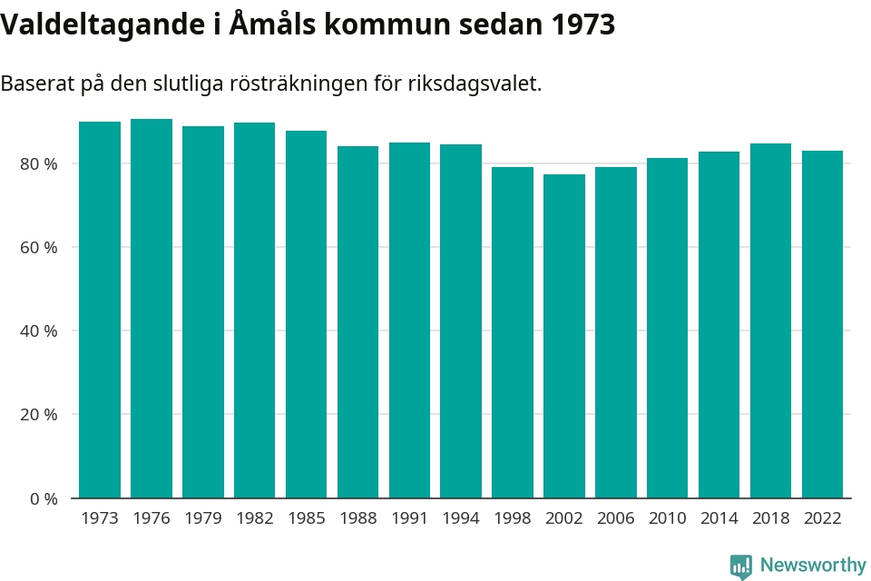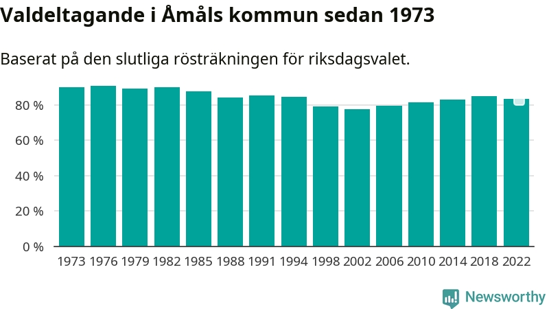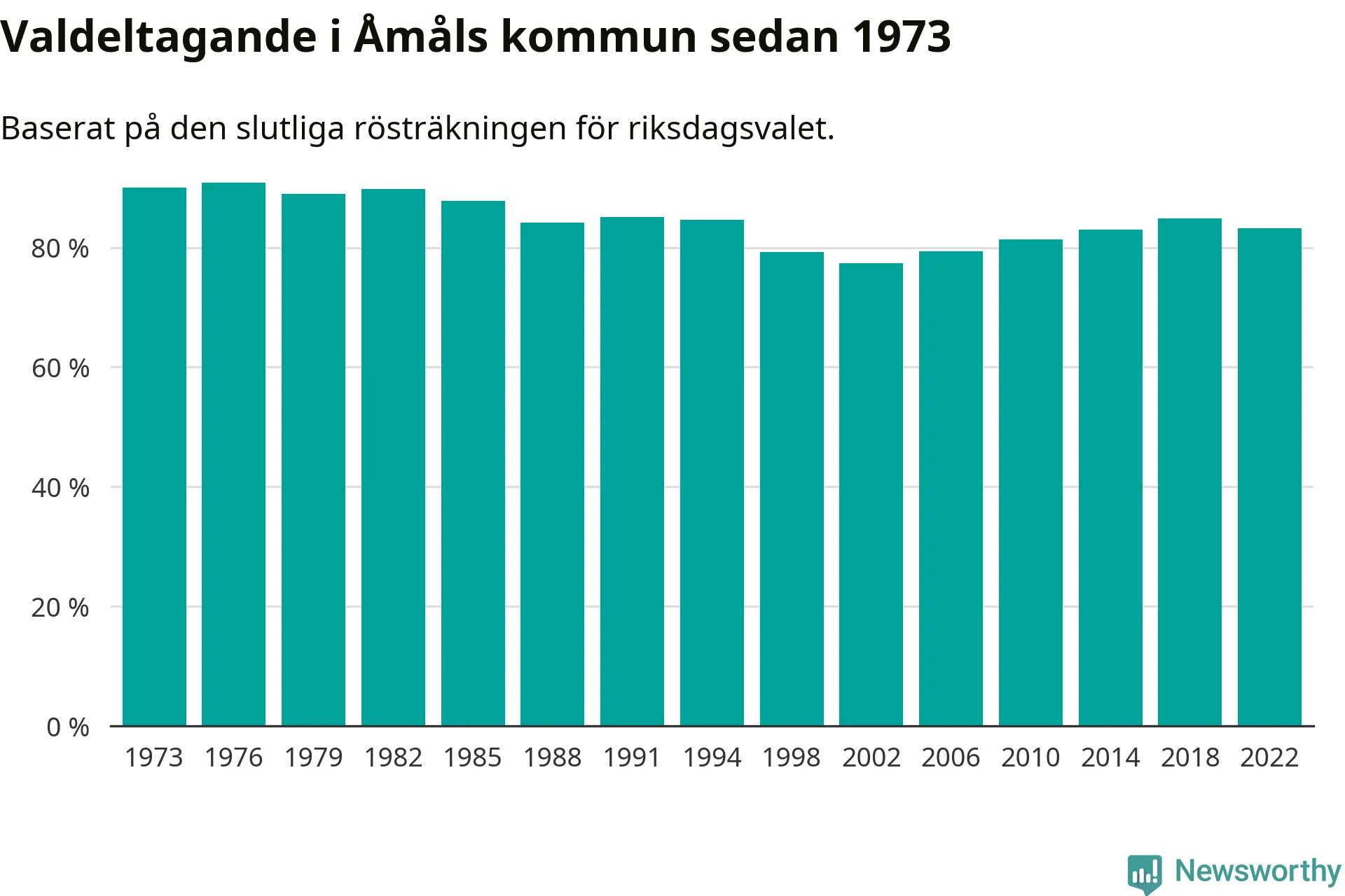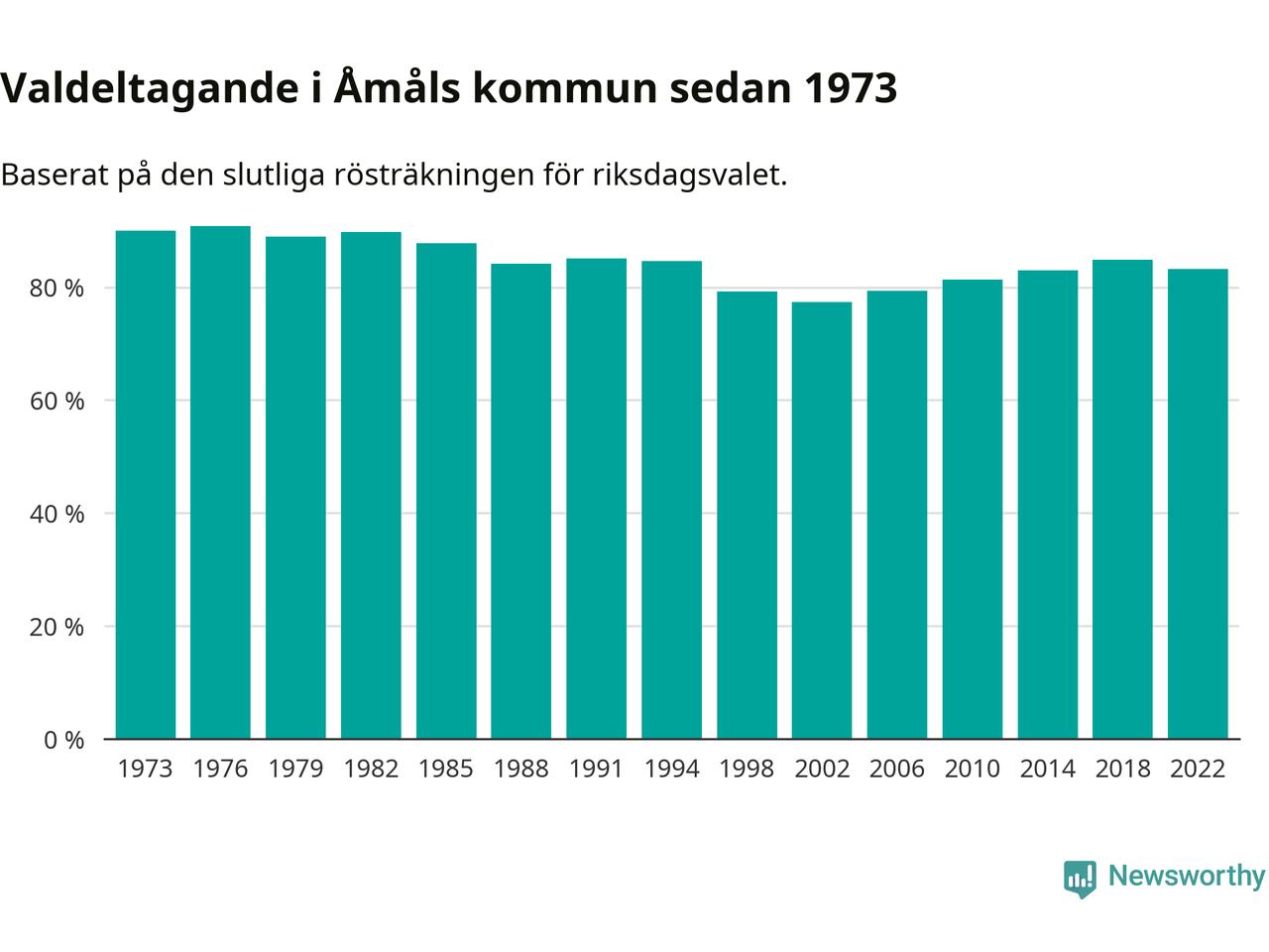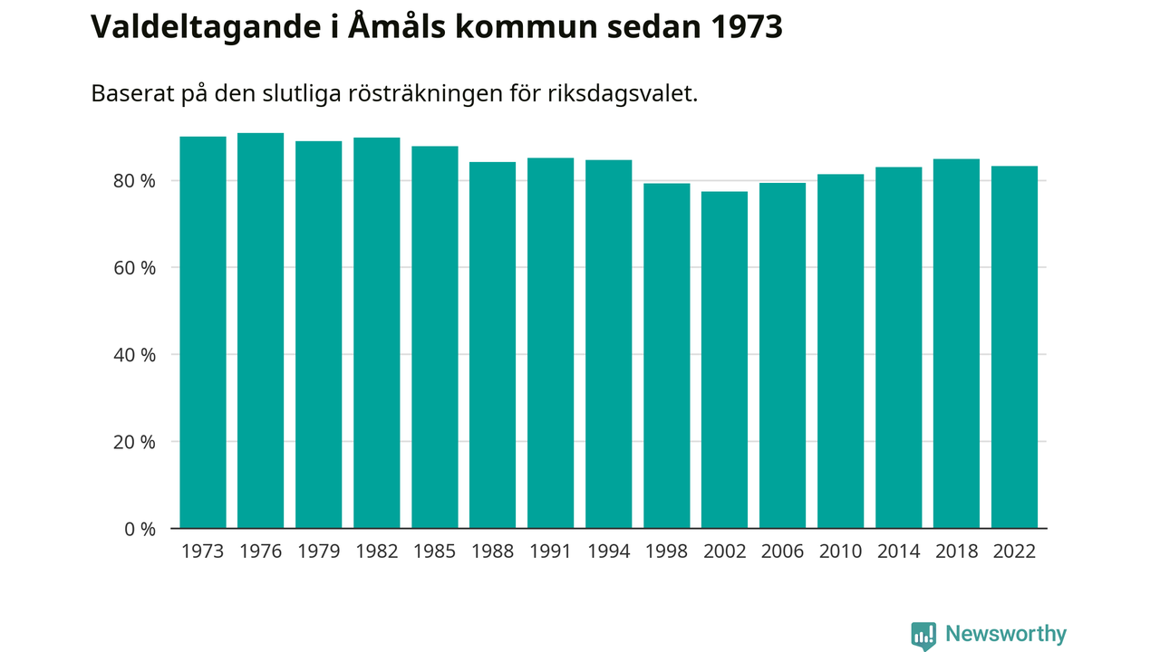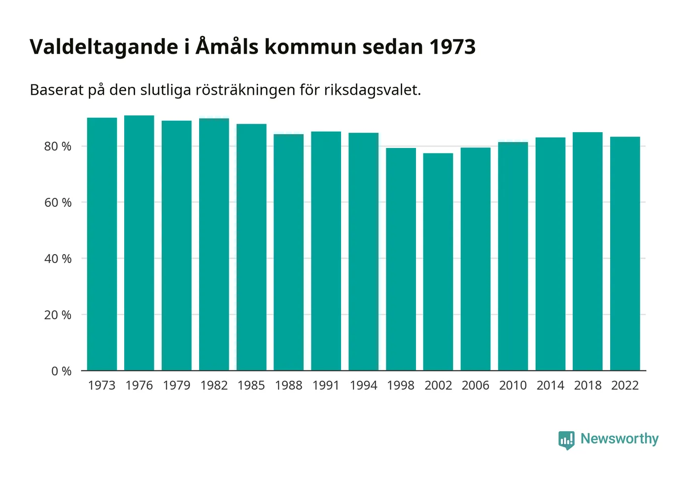 Åmål hade det tredje lägsta valdeltagadet av alla kommuner i Västra Götalands läns norra valkrets under 2022. Allra lägst var det i Strömstads kommun, 80,9 procent, medan 88,3 procent röstade i Sotenäs kommun.
