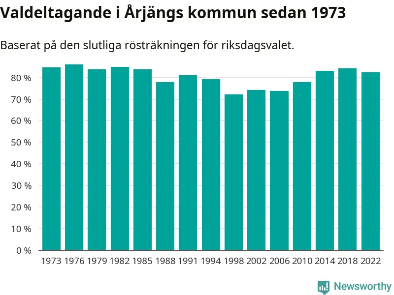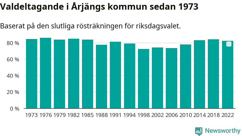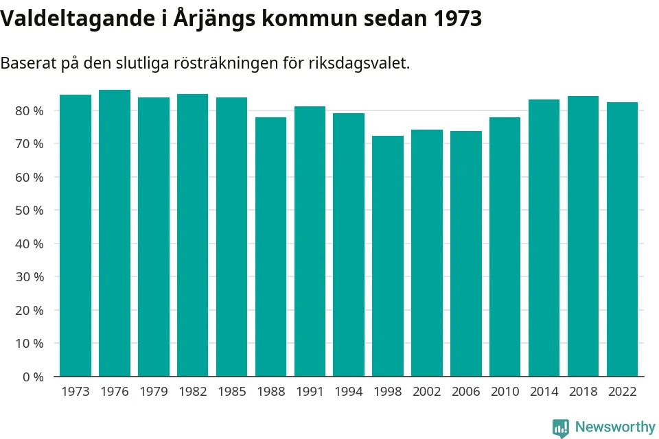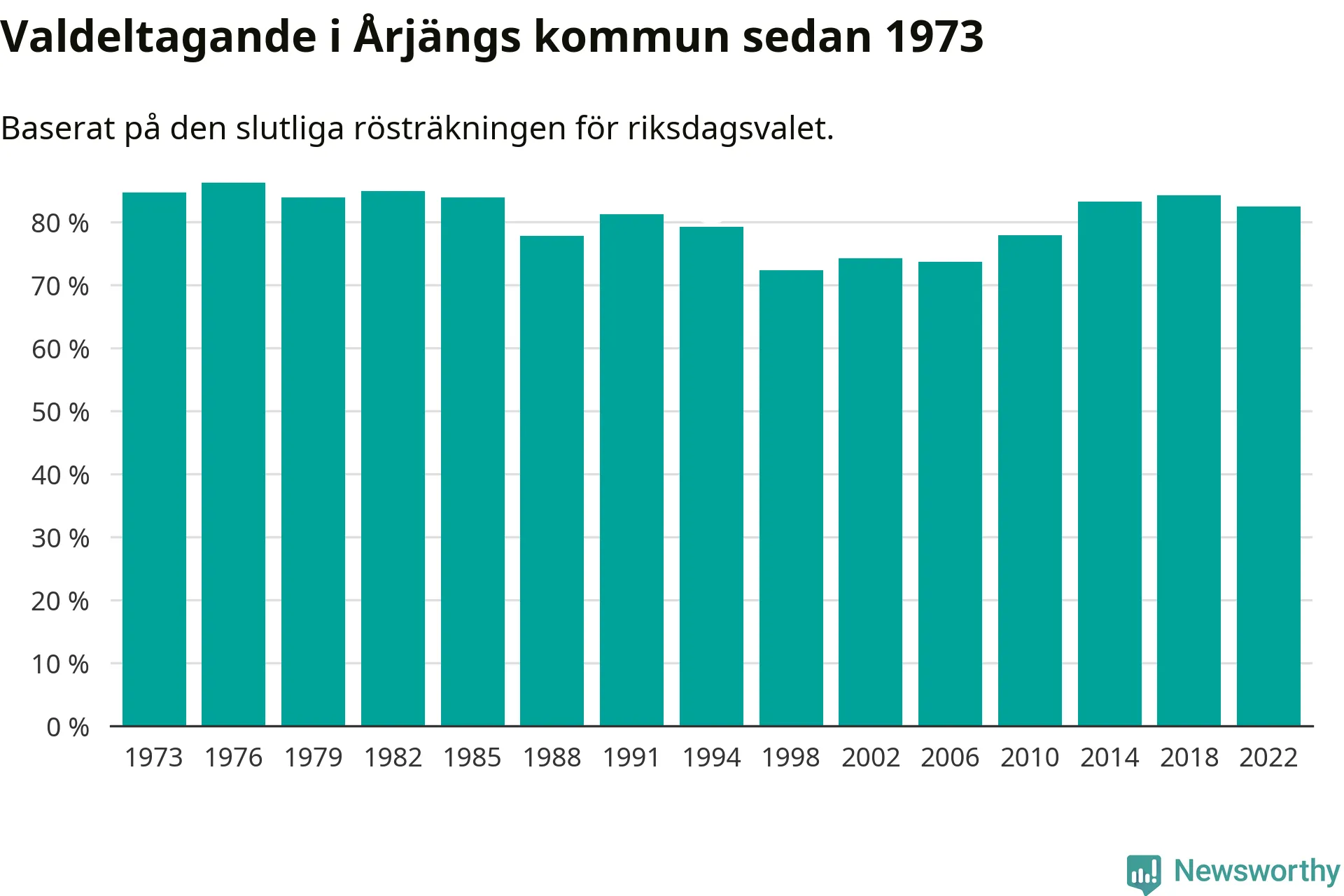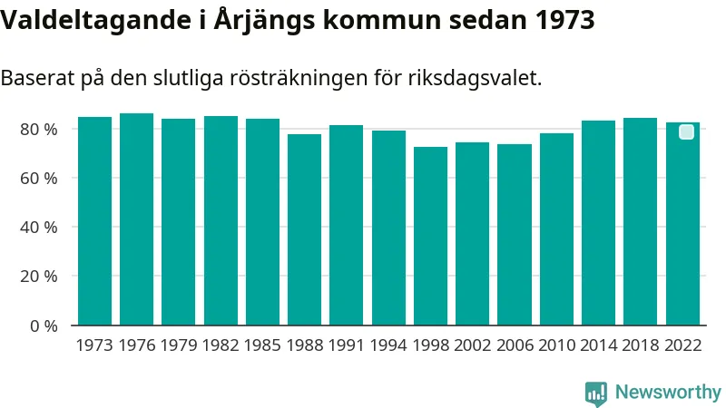 Årjäng tillhör Värmlands läns valkrets. Där var valdeltagandet förra valet 85,2 procent. I hela riket landade valdeltagandet 2022 på 84,21 procent, att jämföra med 87,18 procent 2018.