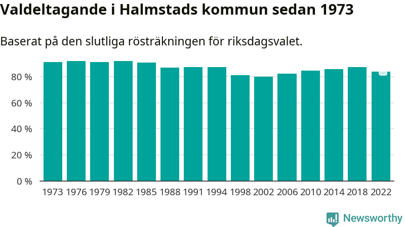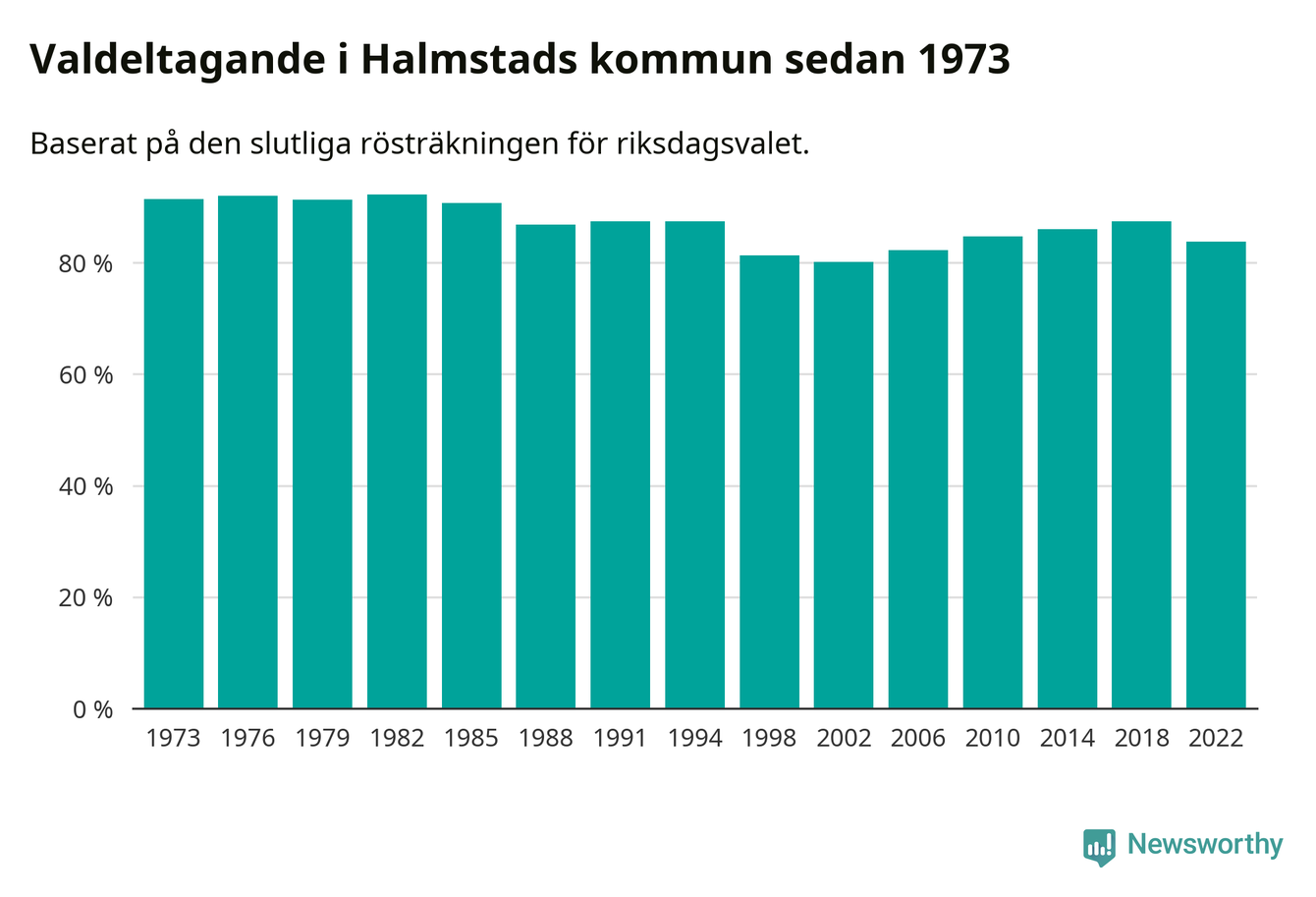 Halmstad tillhör Hallands läns valkrets. Där var valdeltagandet förra valet 86,6 procent. I hela riket landade valdeltagandet 2022 på 84,21 procent, att jämföra med 87,18 procent 2018.