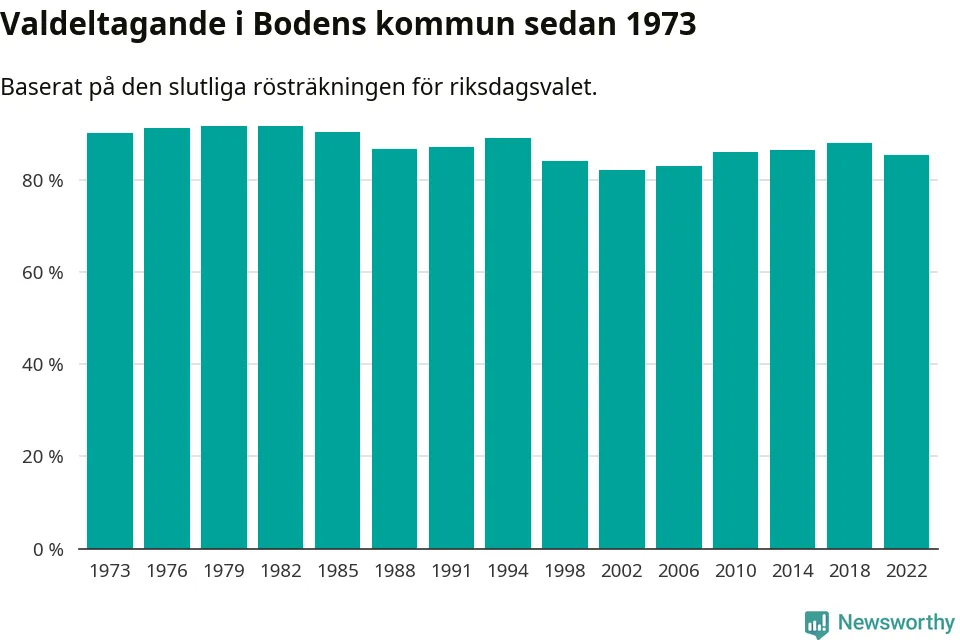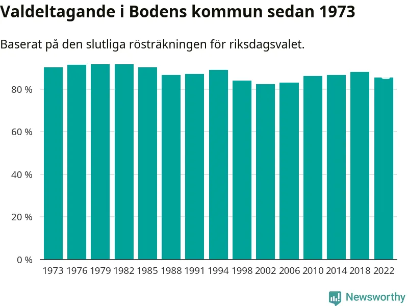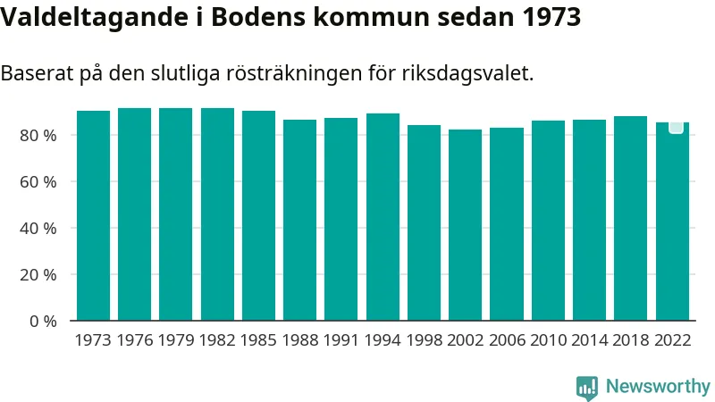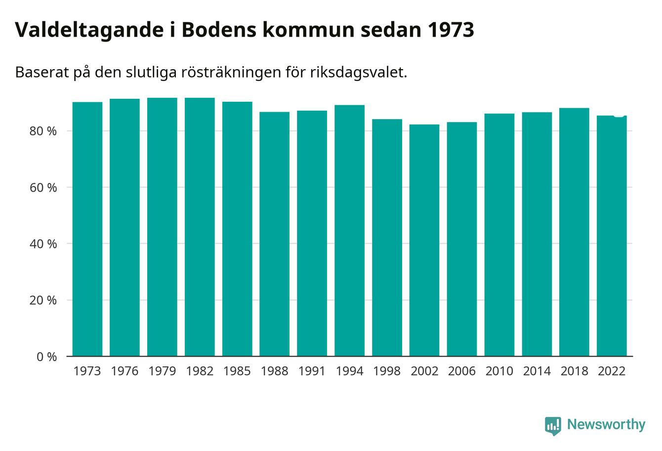 Boden tillhör Norrbottens läns valkrets. Där var valdeltagandet förra valet 84,6 procent. I hela riket landade valdeltagandet 2022 på 84,21 procent, att jämföra med 87,18 procent 2018.