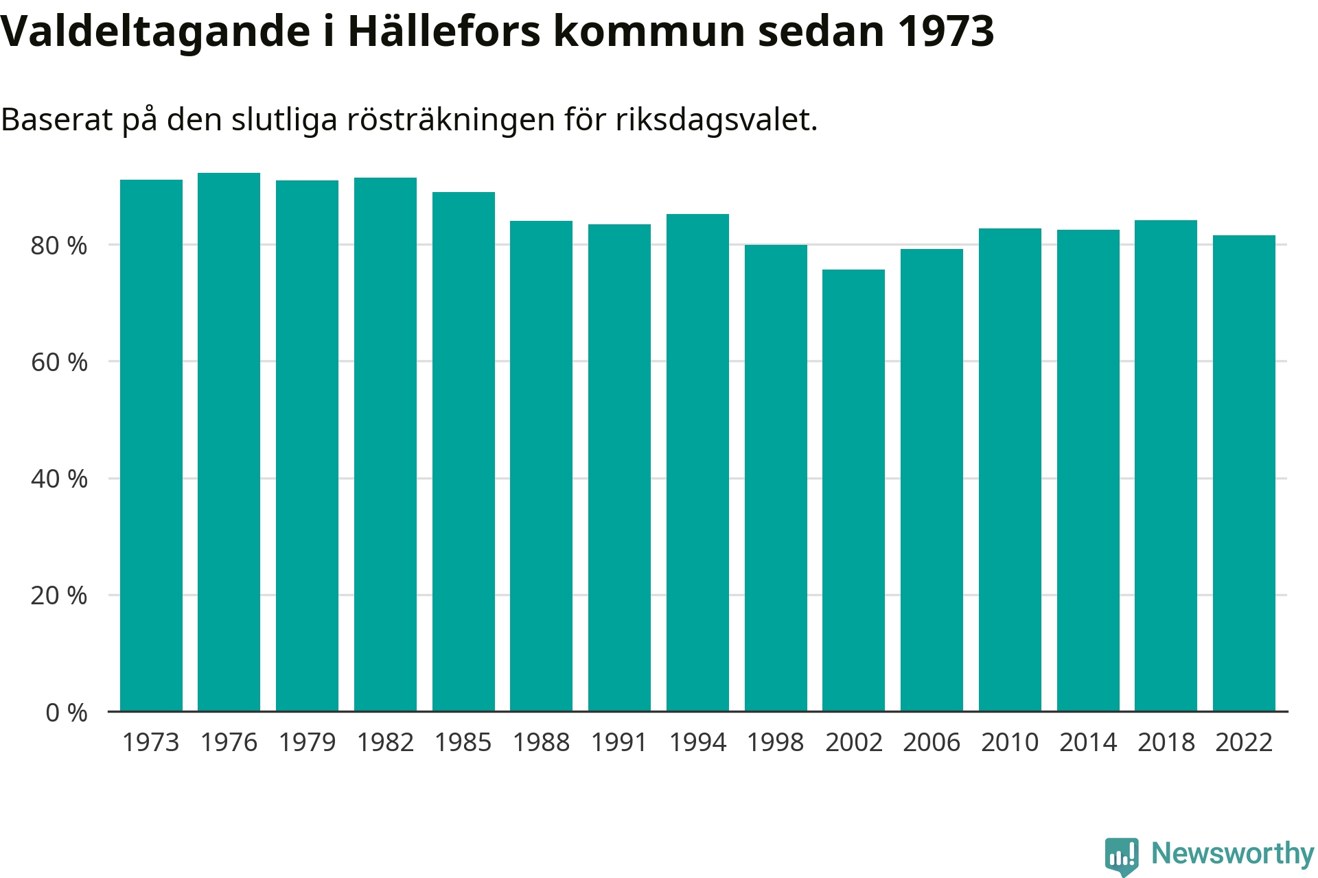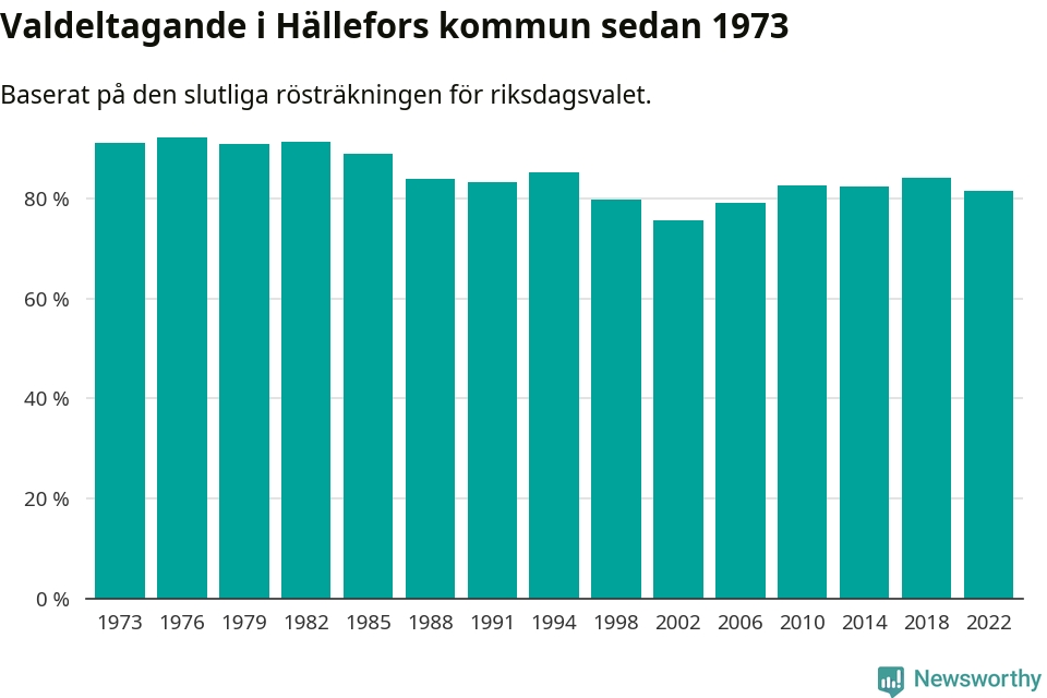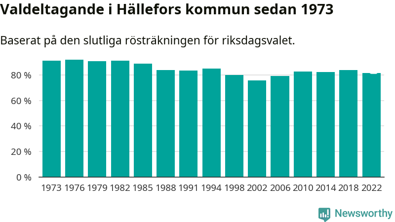 Hällefors tillhör Örebro läns valkrets. Där var valdeltagandet förra valet 84,7 procent. I hela riket landade valdeltagandet 2022 på 84,21 procent, att jämföra med 87,18 procent 2018.