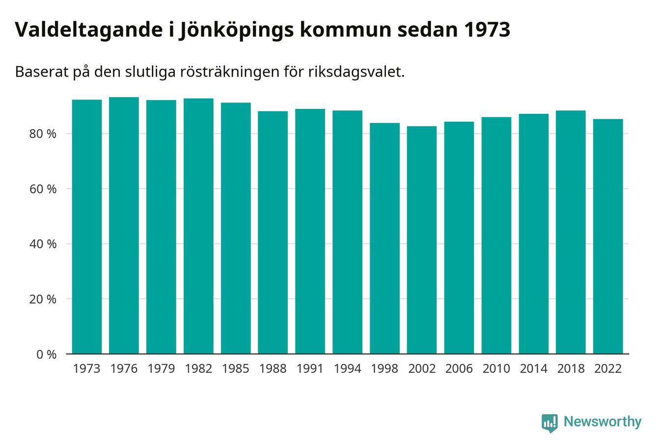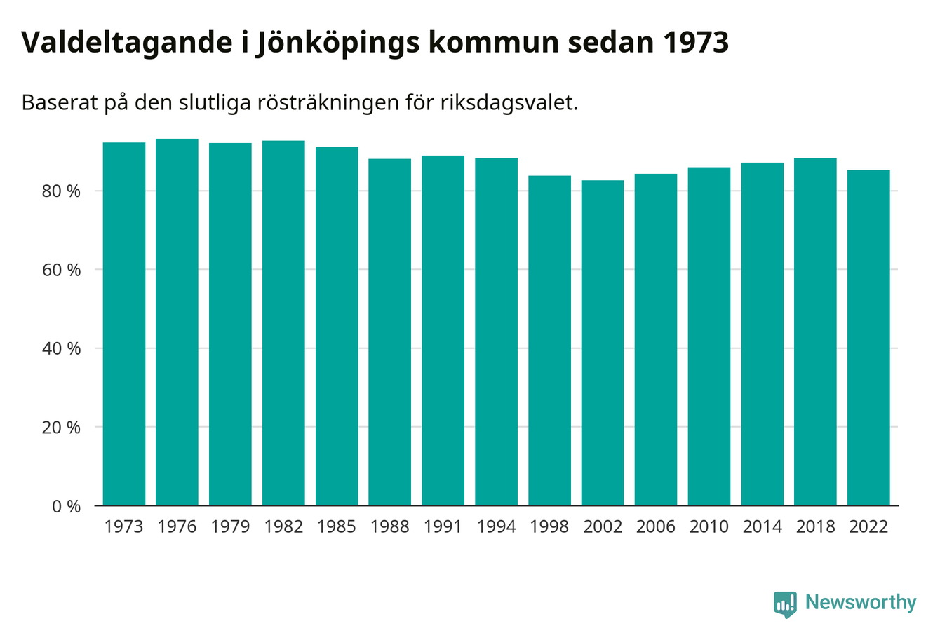 Jönköping tillhör Jönköpings läns valkrets. Där var valdeltagandet förra valet 85,3 procent. I hela riket landade valdeltagandet 2022 på 84,21 procent, att jämföra med 87,18 procent 2018.