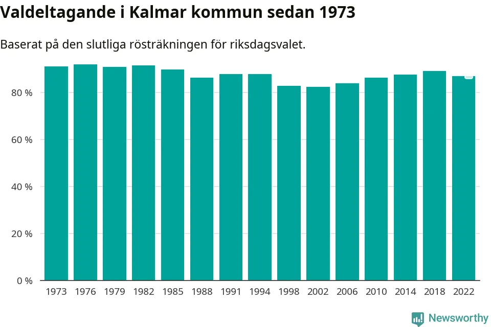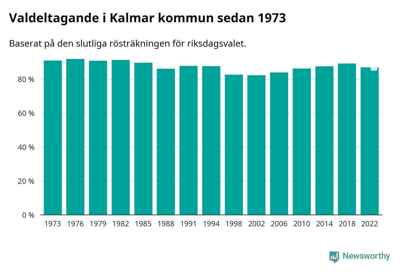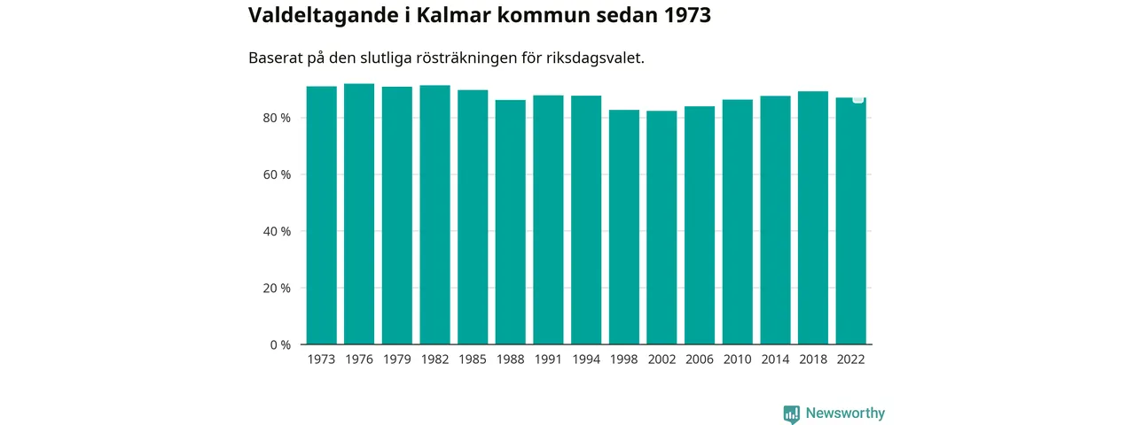 Kalmar tillhör Kalmar läns valkrets. Där var valdeltagandet förra valet 86,0 procent. I hela riket landade valdeltagandet 2022 på 84,21 procent, att jämföra med 87,18 procent 2018.