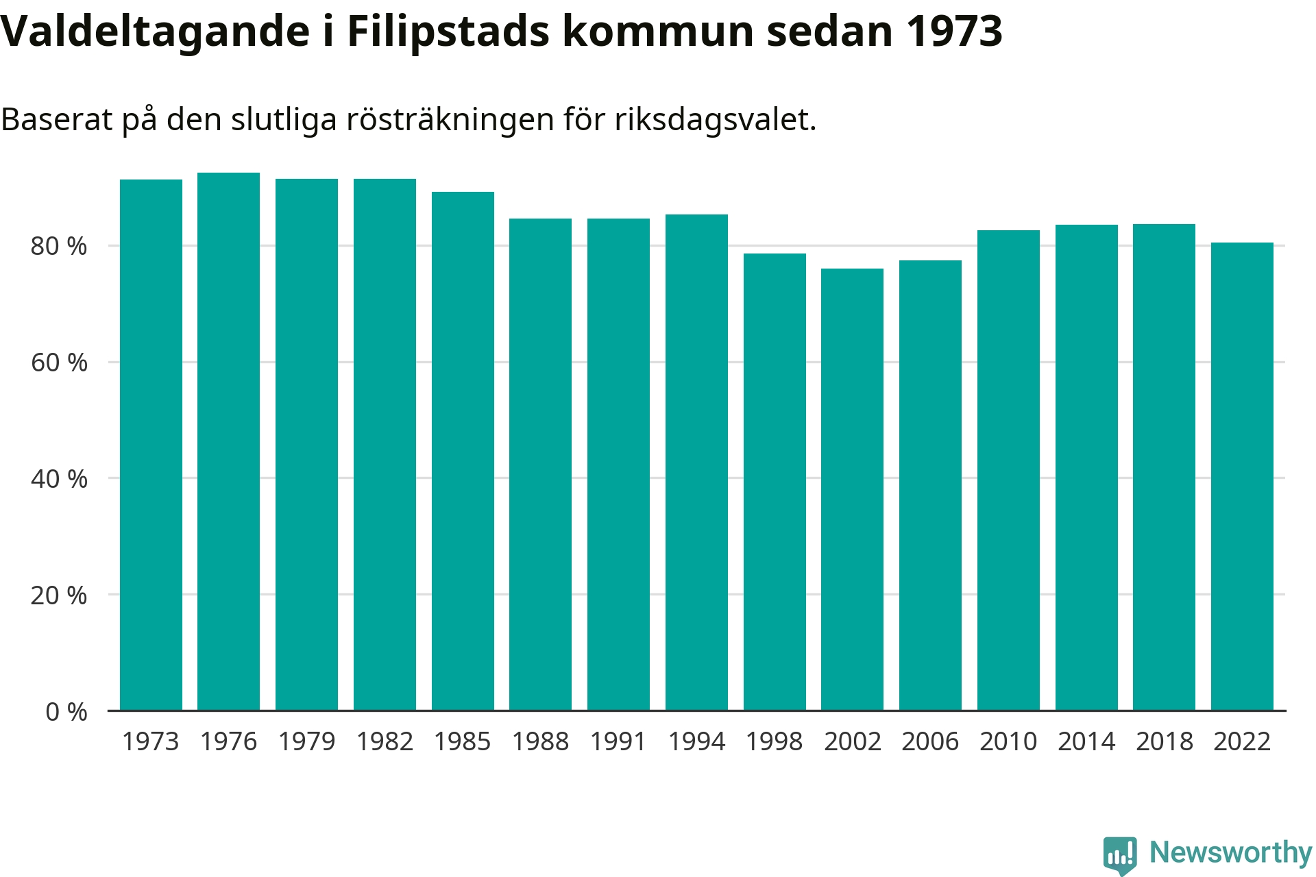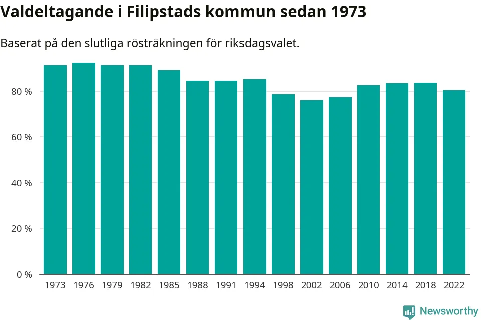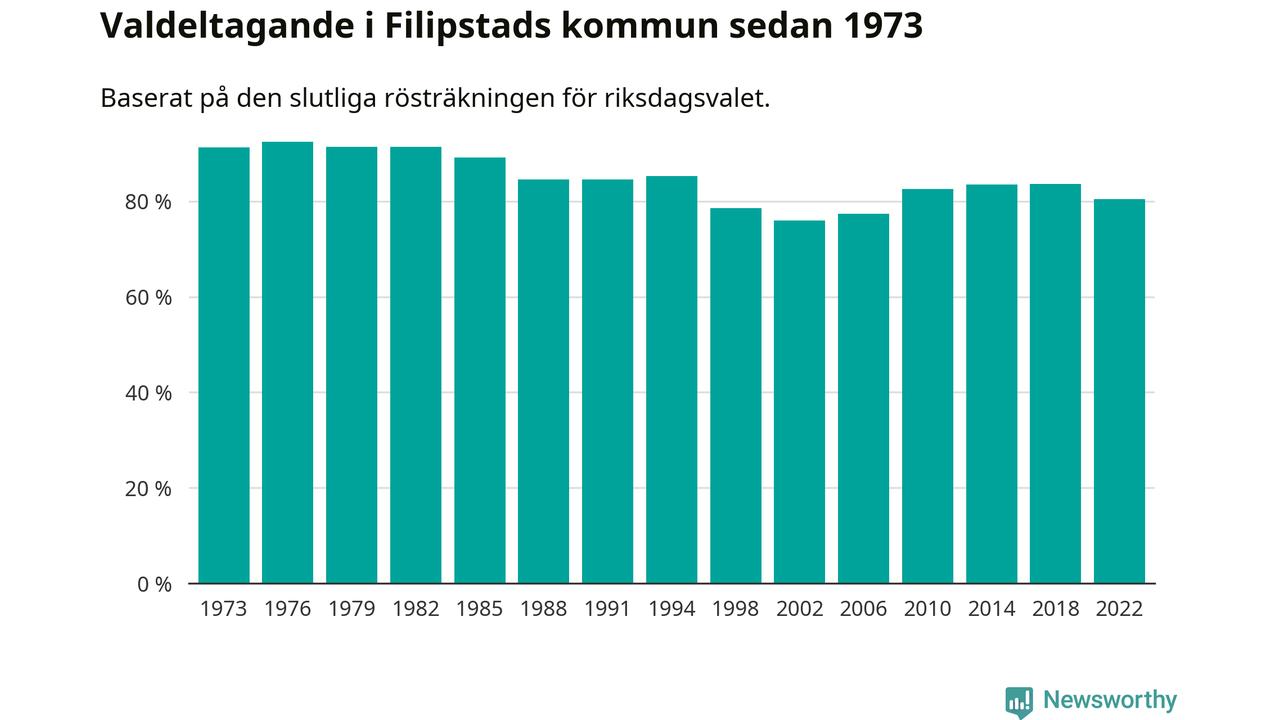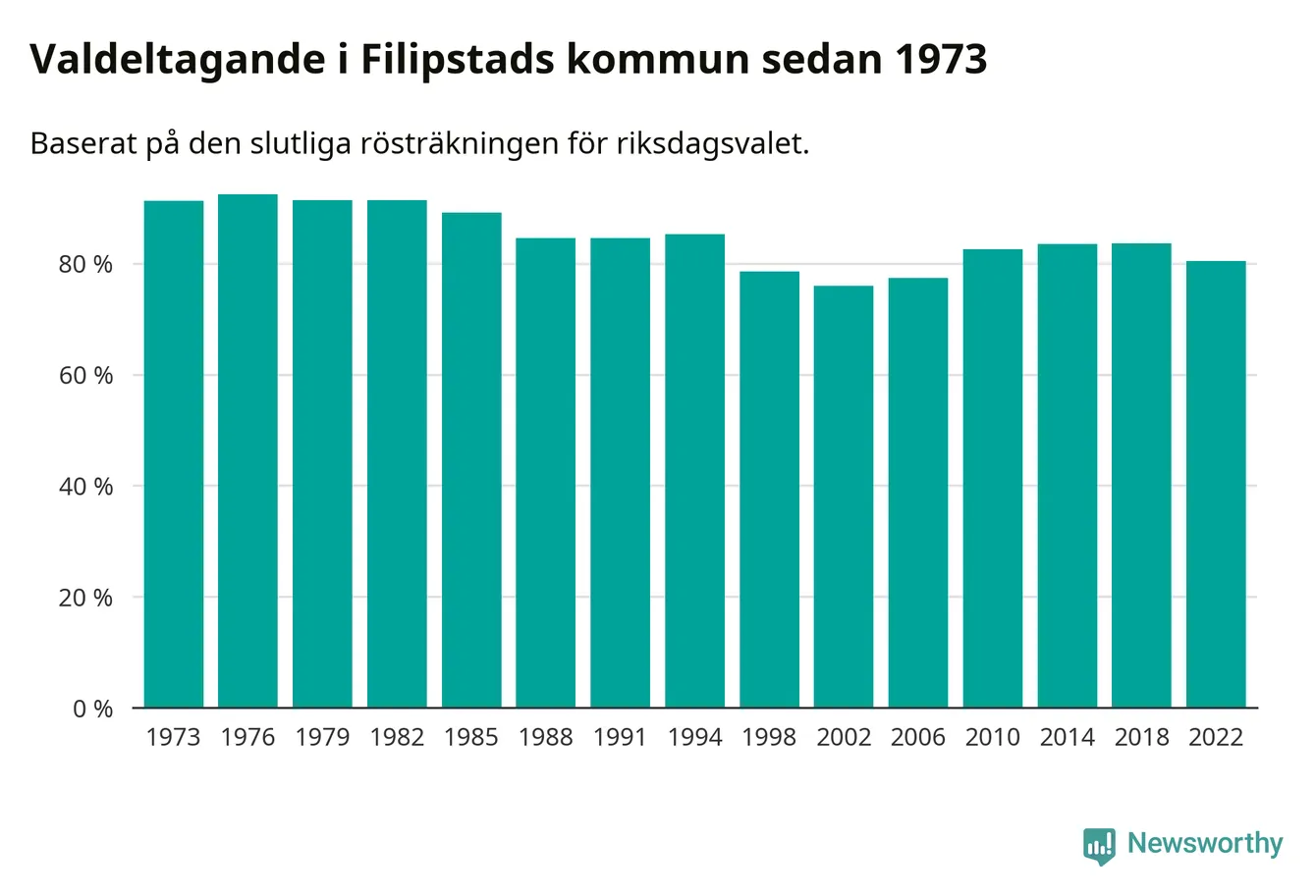 Filipstad tillhör Värmlands läns valkrets. Där var valdeltagandet förra valet 85,2 procent. I hela riket landade valdeltagandet 2022 på 84,21 procent, att jämföra med 87,18 procent 2018.