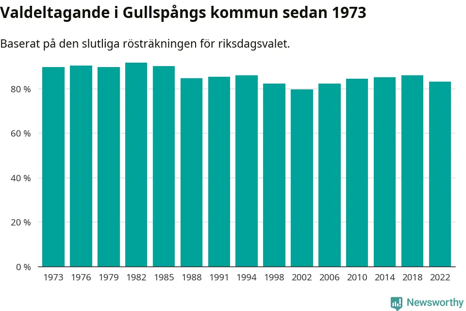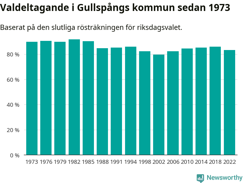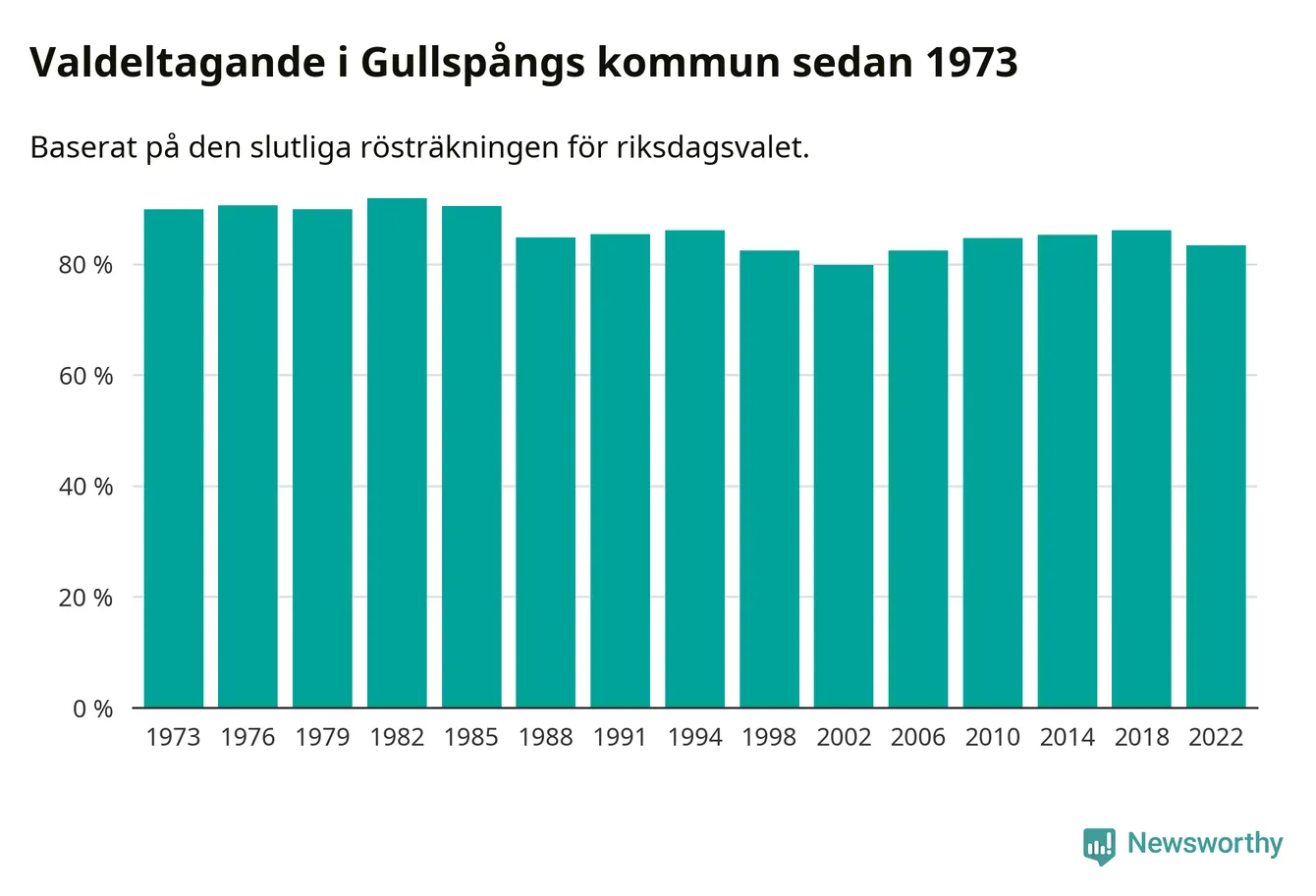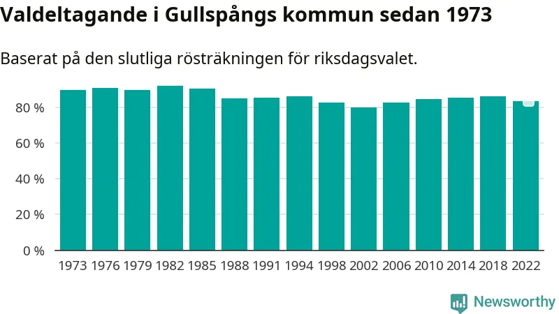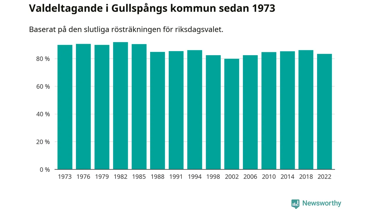Gullspång tillhör Västra Götalands läns östra valkrets. Där var valdeltagandet förra valet 86,1 procent. I hela riket landade valdeltagandet 2022 på 84,21 procent, att jämföra med 87,18 procent 2018.
