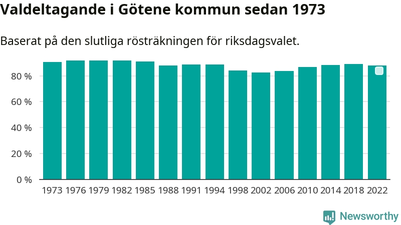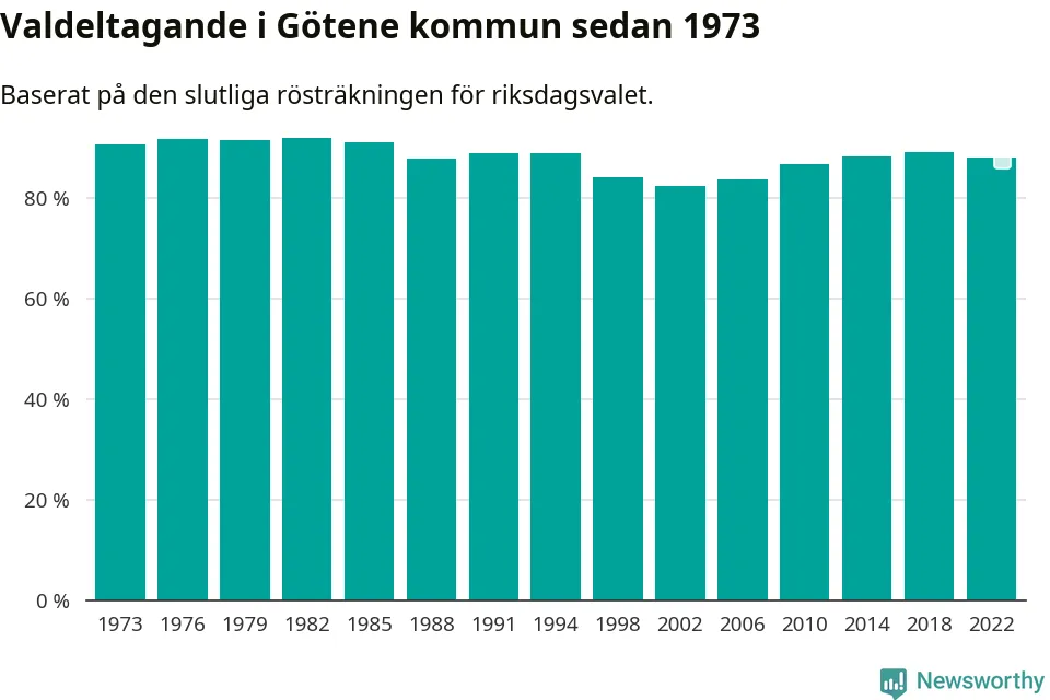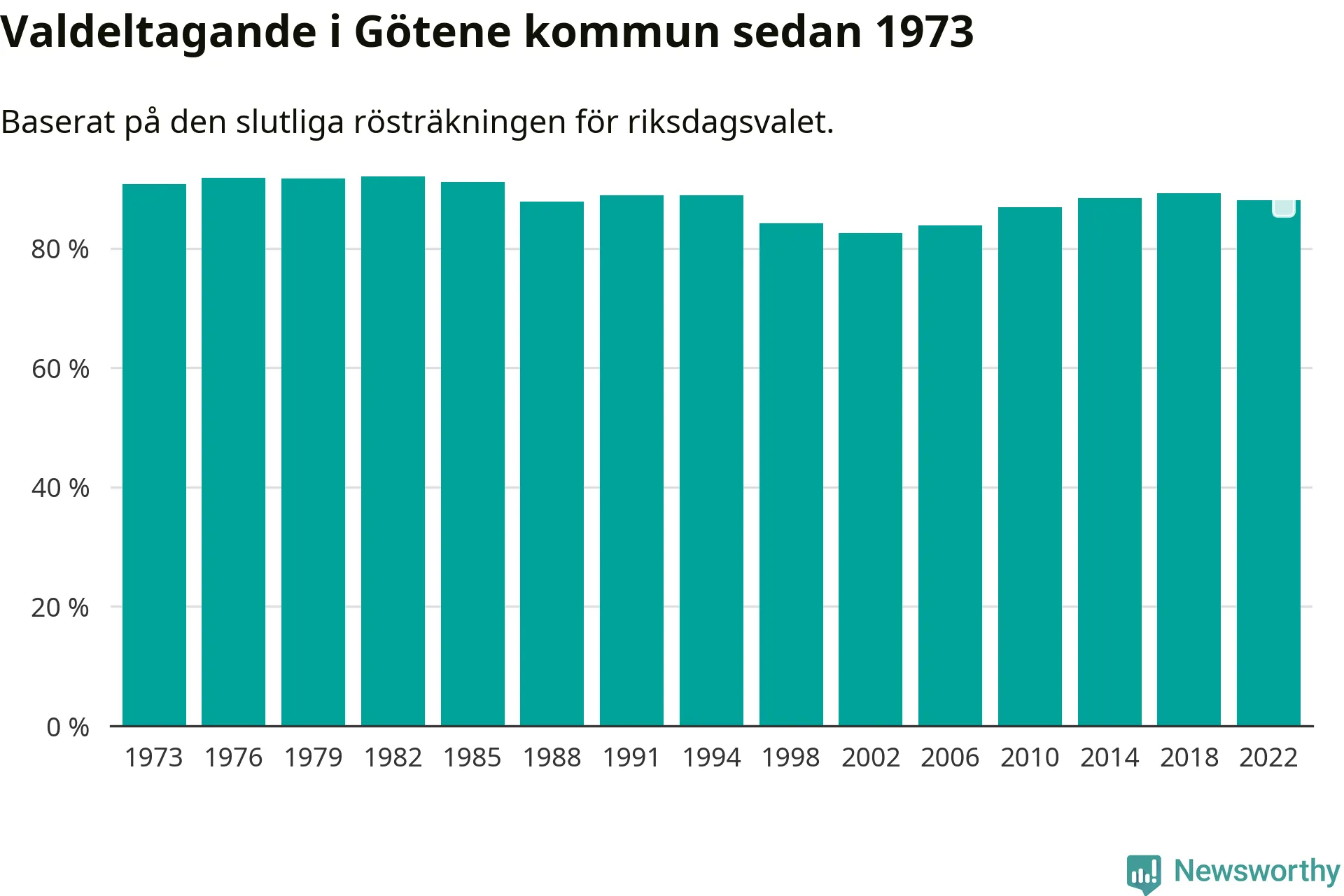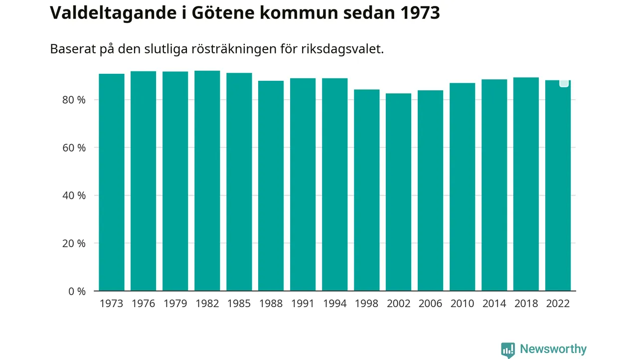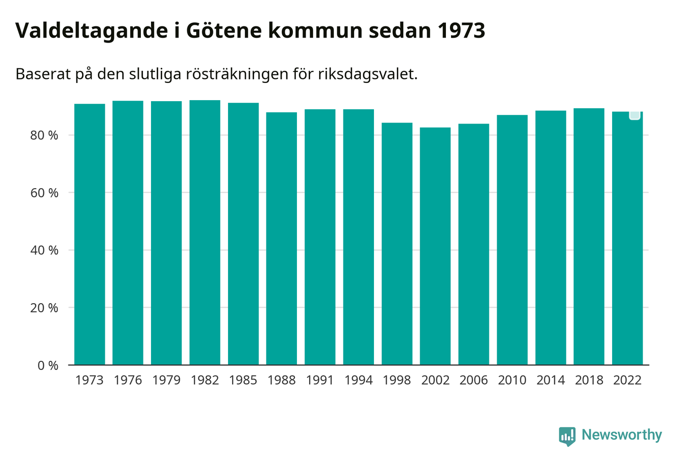 I höst går 10 287 Götenebor till val. Sist landade valdeltagandet på 88 procent, en minskning för första gången sedan 2002 i kommunen.