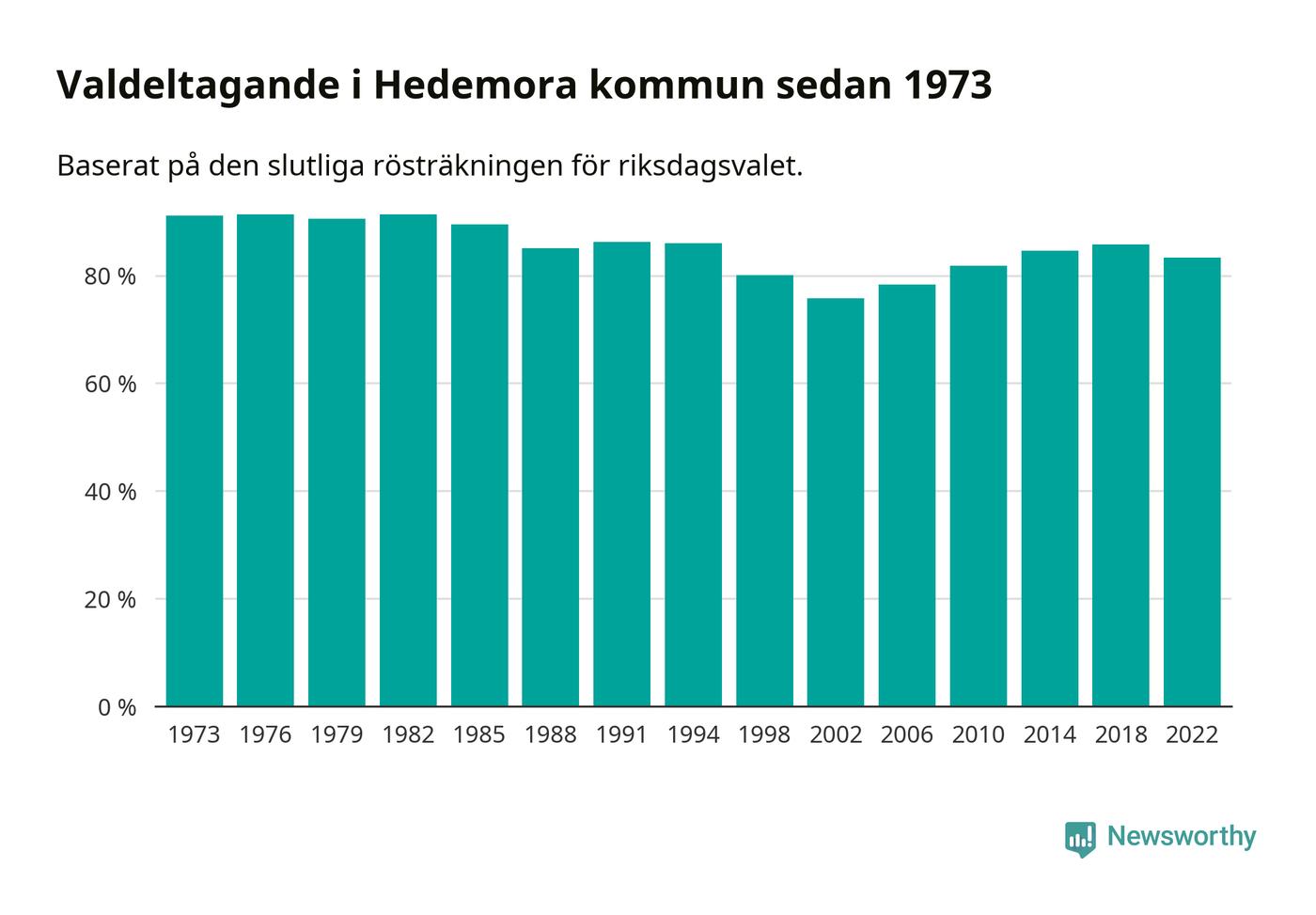 Hedemora tillhör Dalarnas läns valkrets. Där var valdeltagandet förra valet 85,4 procent. I hela riket landade valdeltagandet 2022 på 84,21 procent, att jämföra med 87,18 procent 2018.