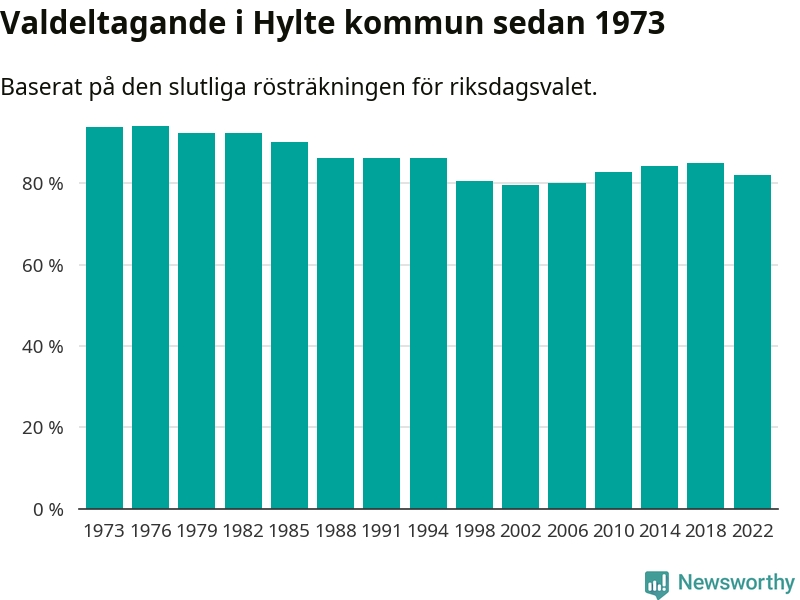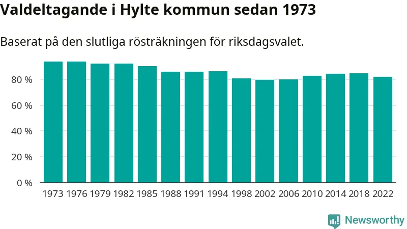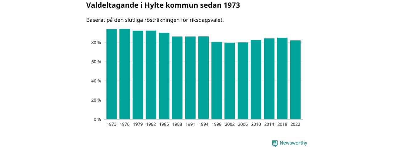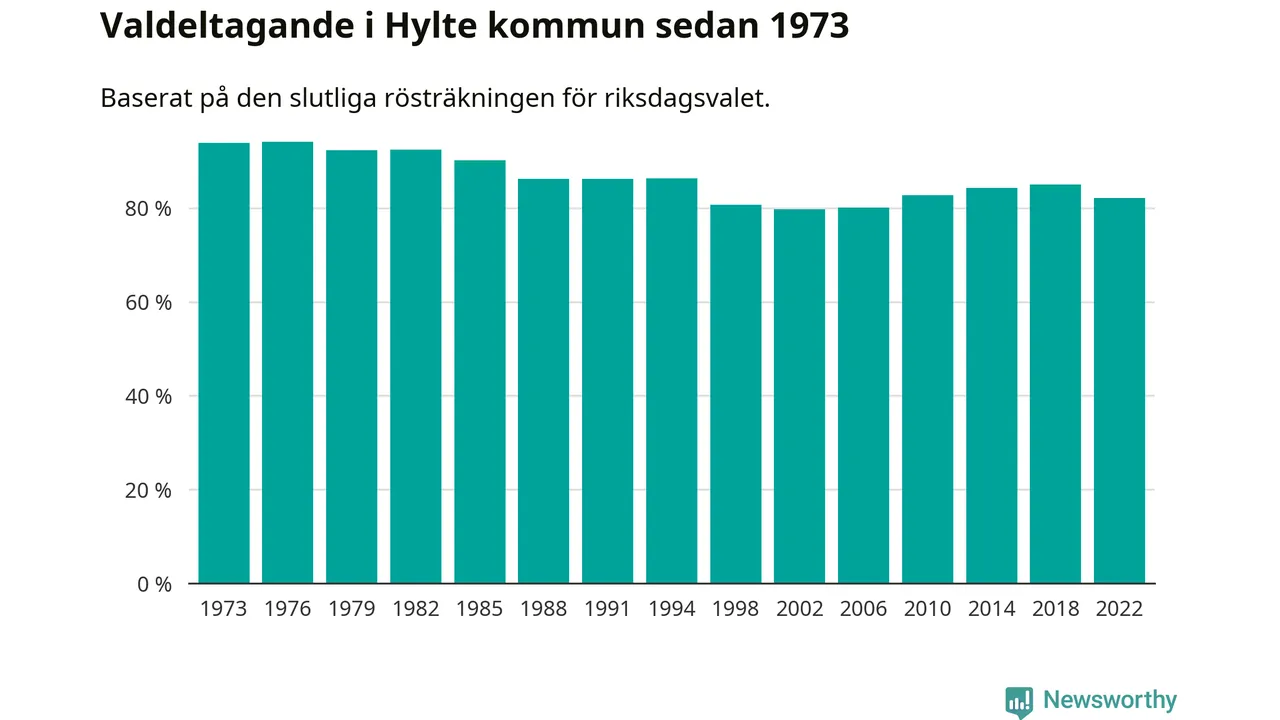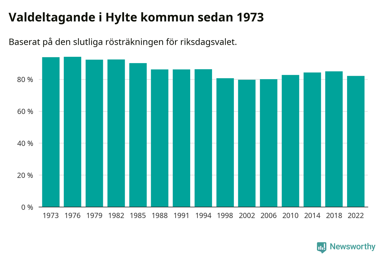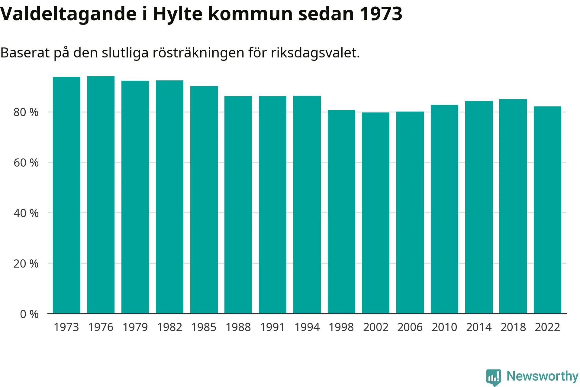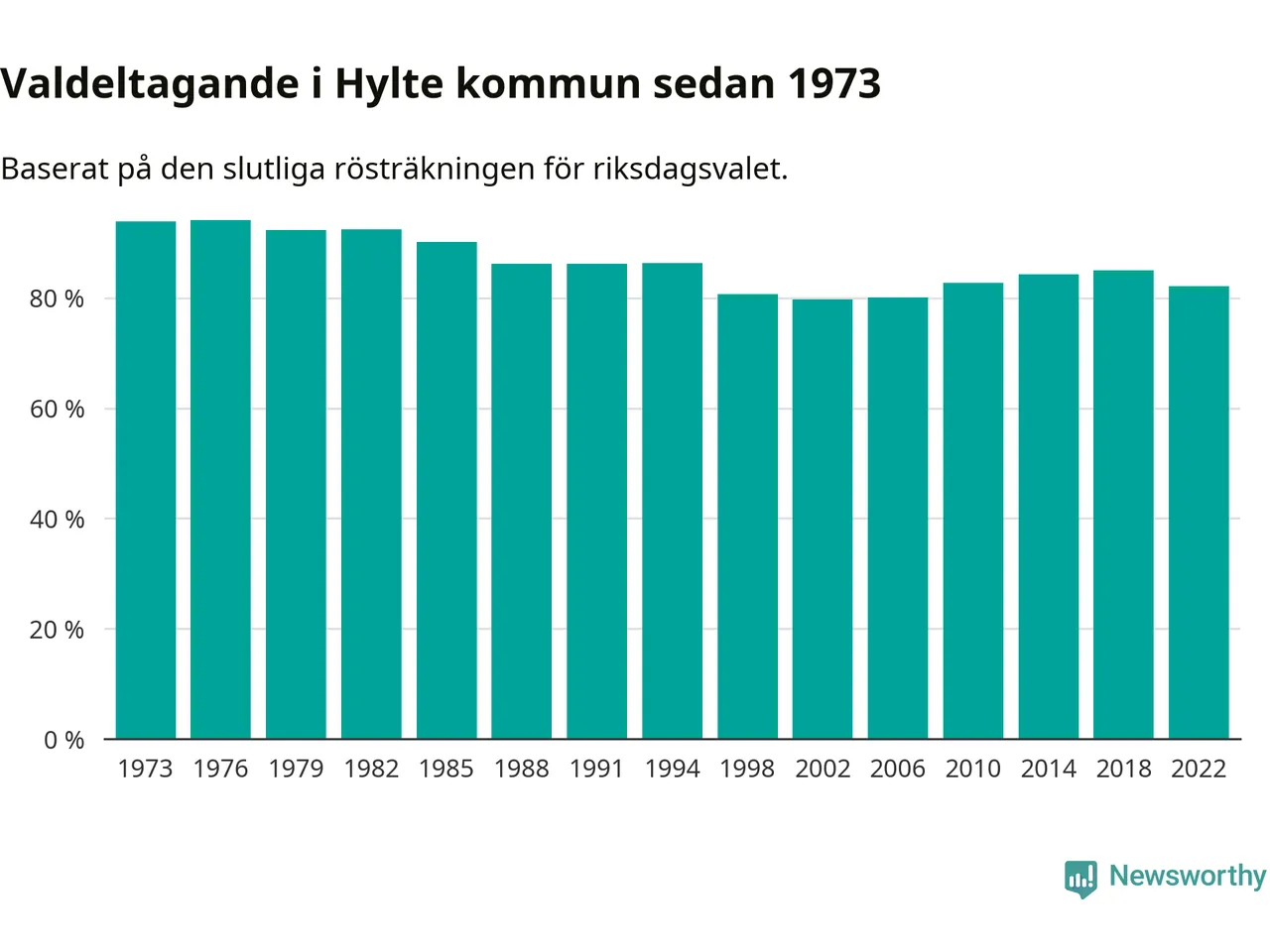 Hylte tillhör Hallands läns valkrets. Där var valdeltagandet förra valet 86,6 procent. I hela riket landade valdeltagandet 2022 på 84,21 procent, att jämföra med 87,18 procent 2018.