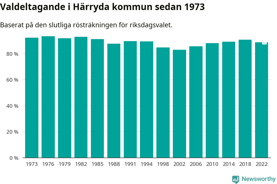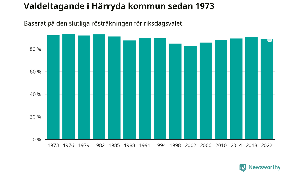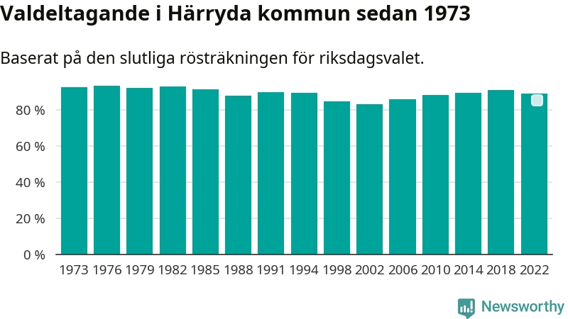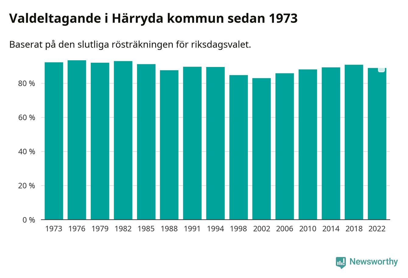 Härryda tillhör Västra Götalands läns västra valkrets. Där var valdeltagandet förra valet 87,6 procent. I hela riket landade valdeltagandet 2022 på 84,21 procent, att jämföra med 87,18 procent 2018.