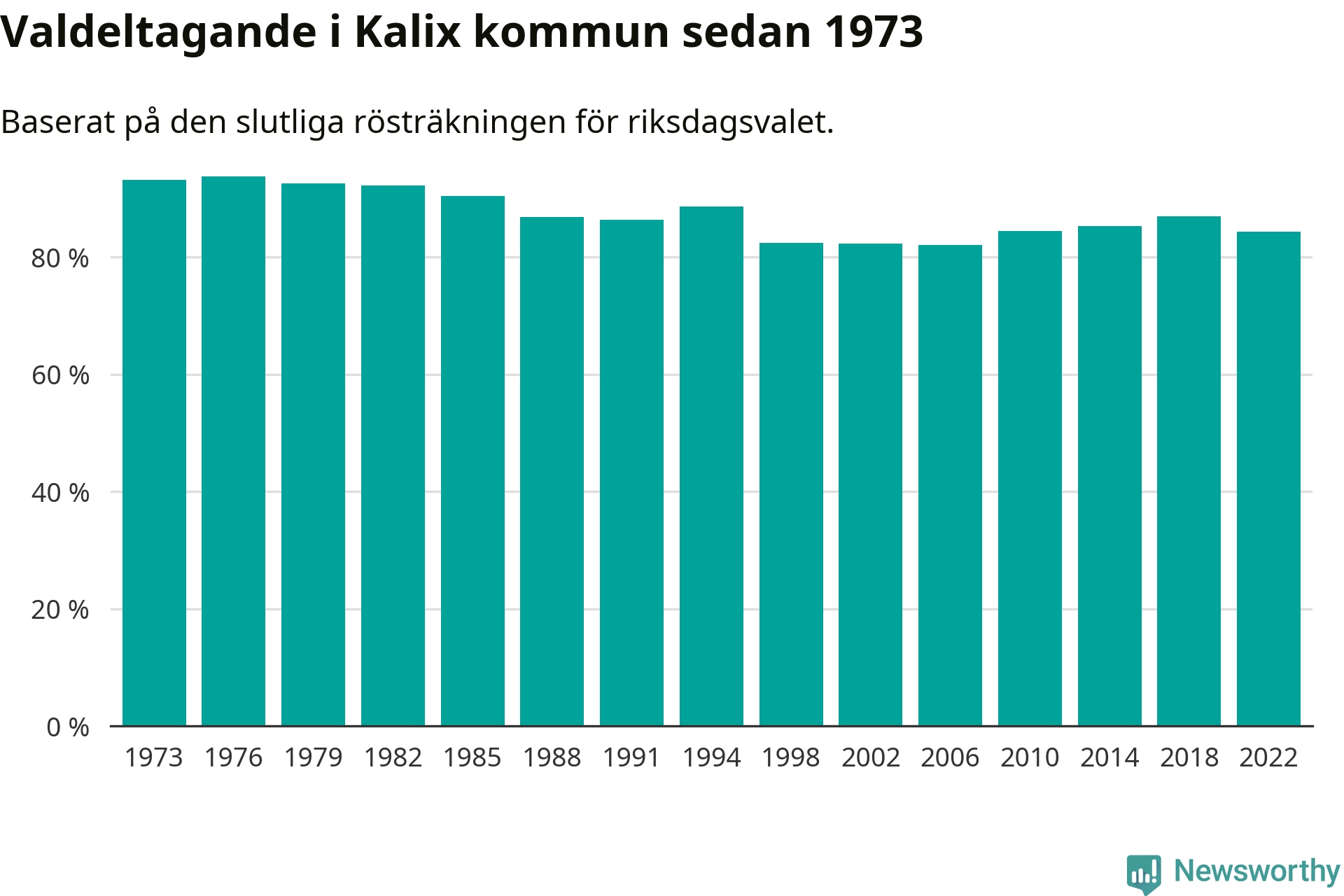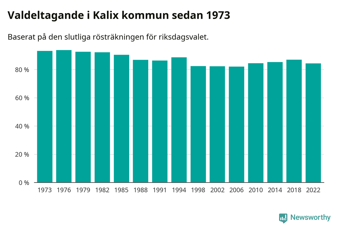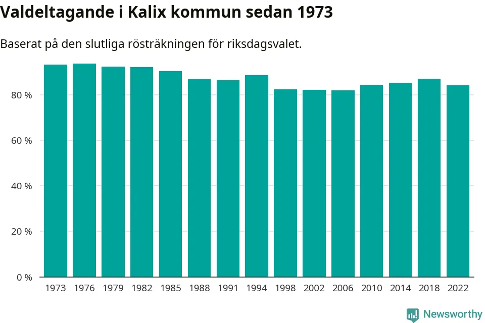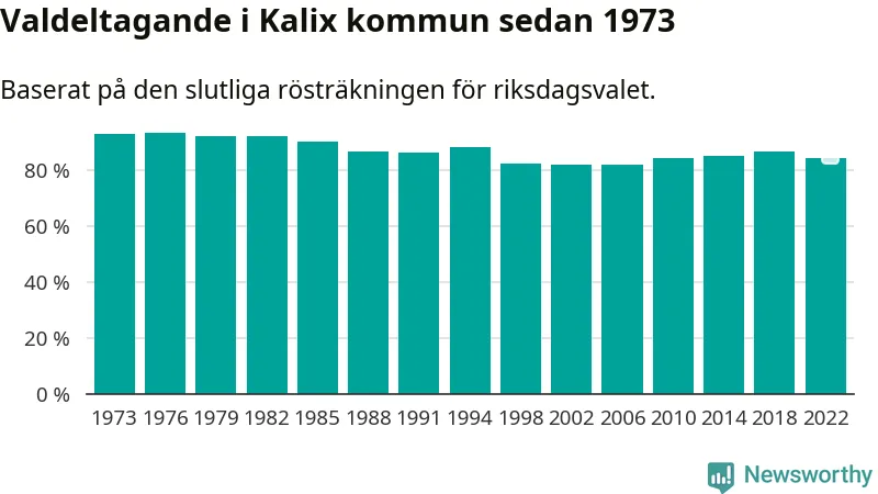 Kalix tillhör Norrbottens läns valkrets. Där var valdeltagandet förra valet 84,6 procent. I hela riket landade valdeltagandet 2022 på 84,21 procent, att jämföra med 87,18 procent 2018.