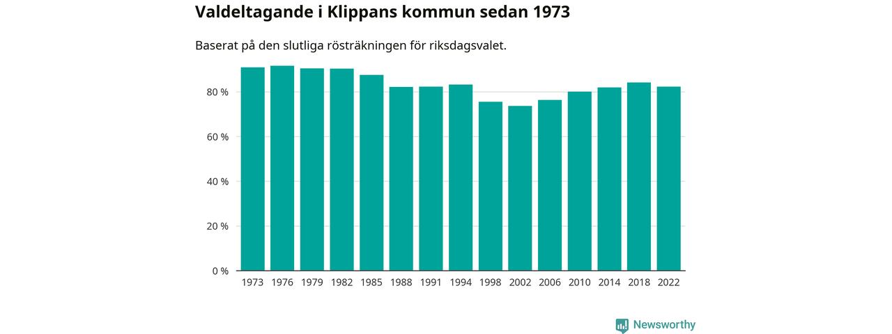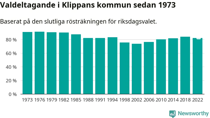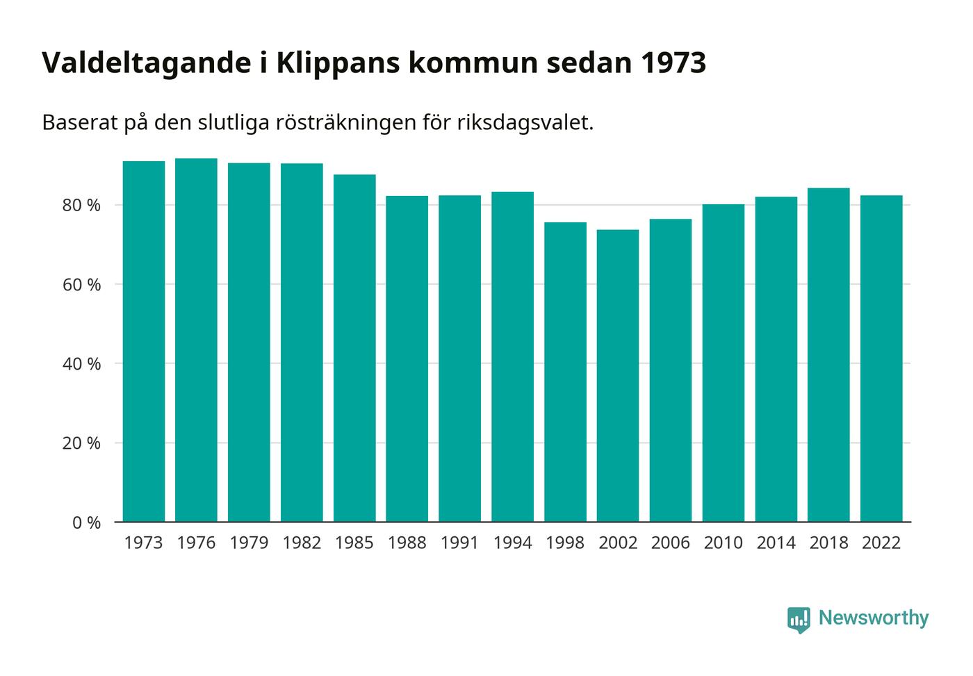 Klippan hade det tredje lägsta valdeltagadet av alla kommuner i Skåne läns norra och östra valkrets under 2022. Allra lägst var det i Perstorps kommun, 79,2 procent, medan 87,2 procent röstade i Båstads kommun.