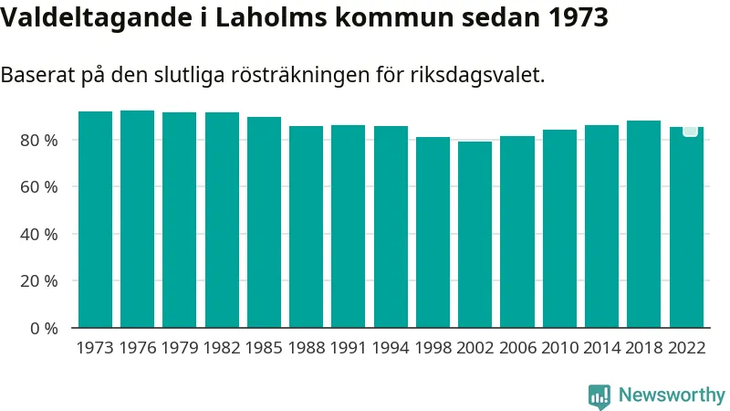 Laholm tillhör Hallands läns valkrets. Där var valdeltagandet förra valet 86,6 procent. I hela riket landade valdeltagandet 2022 på 84,21 procent, att jämföra med 87,18 procent 2018.