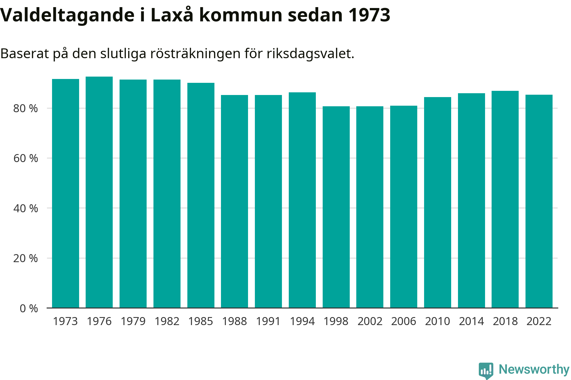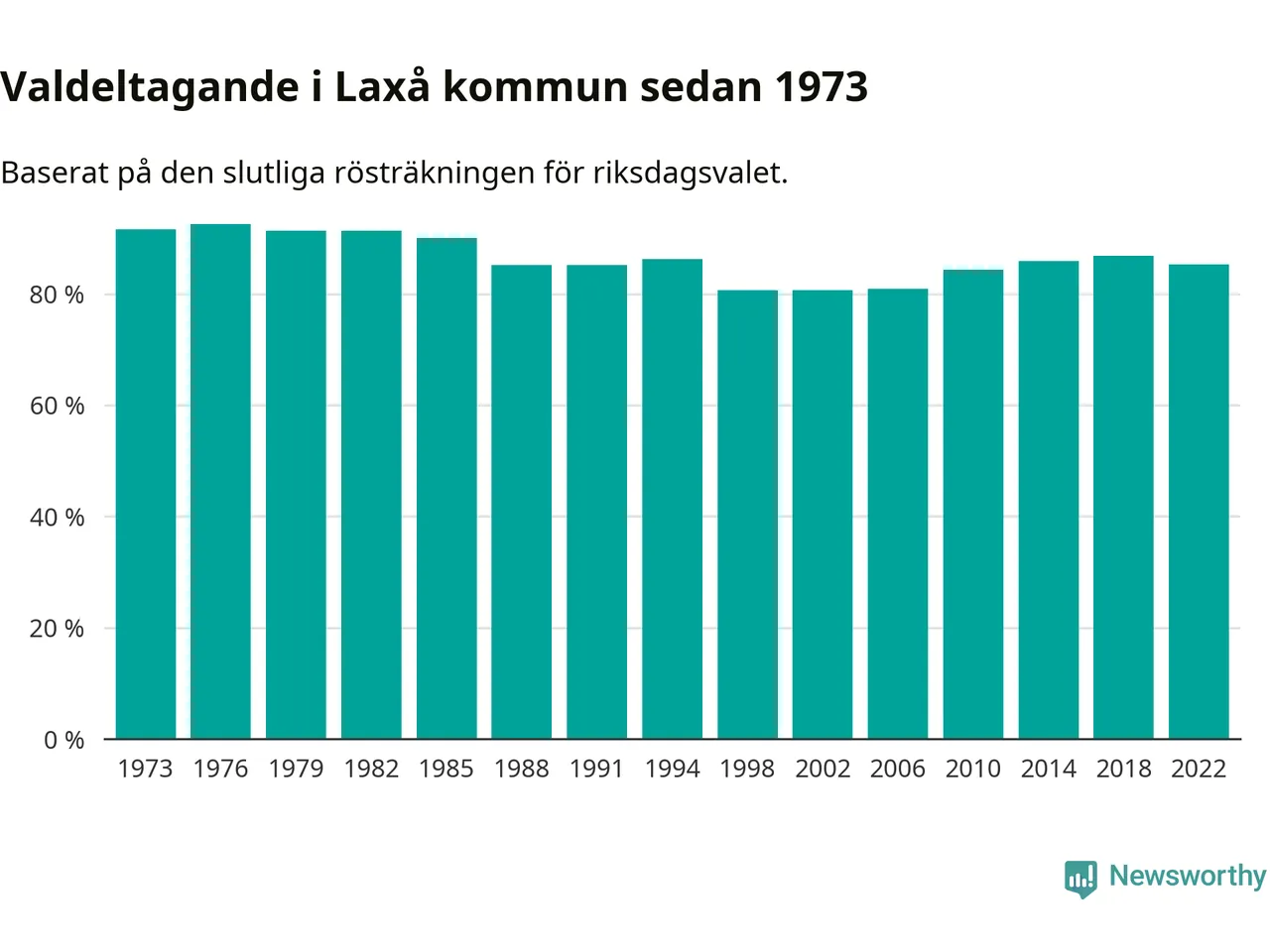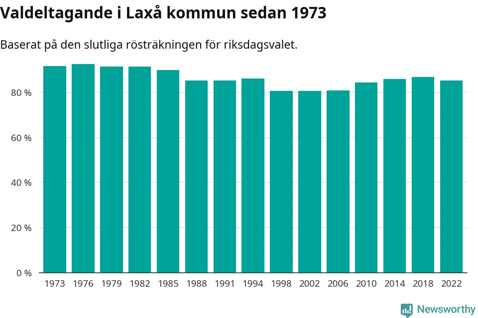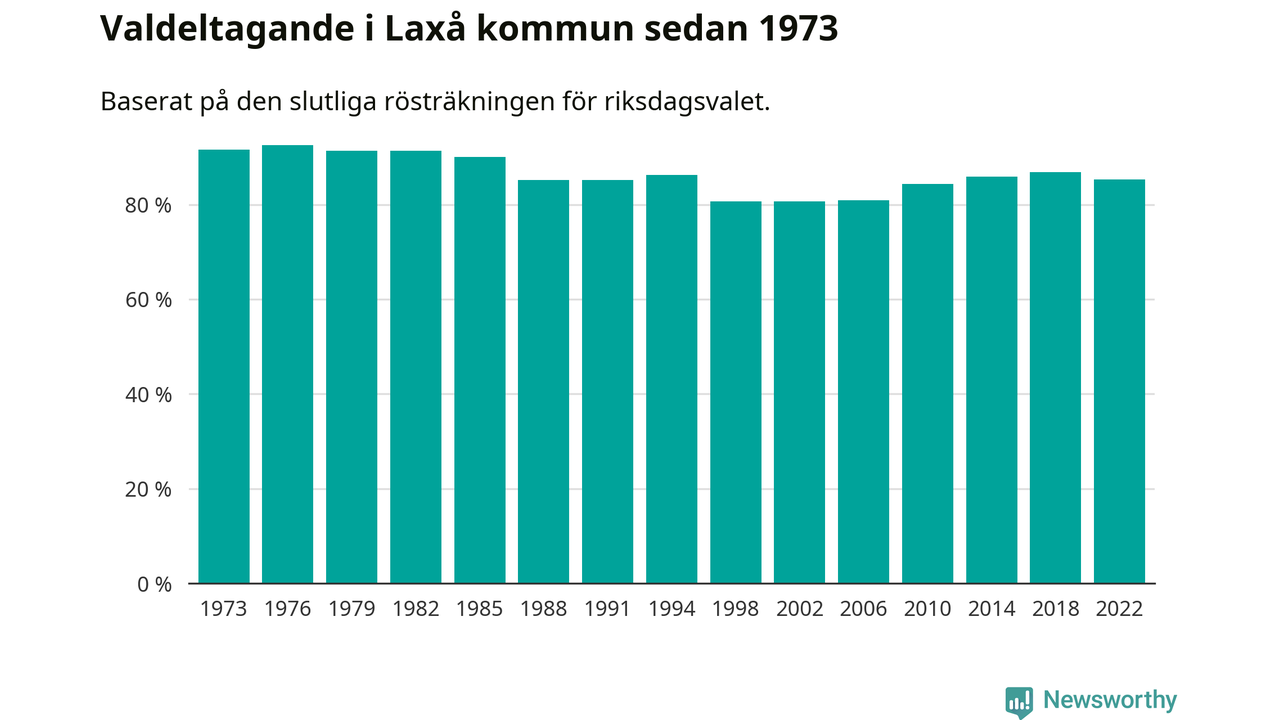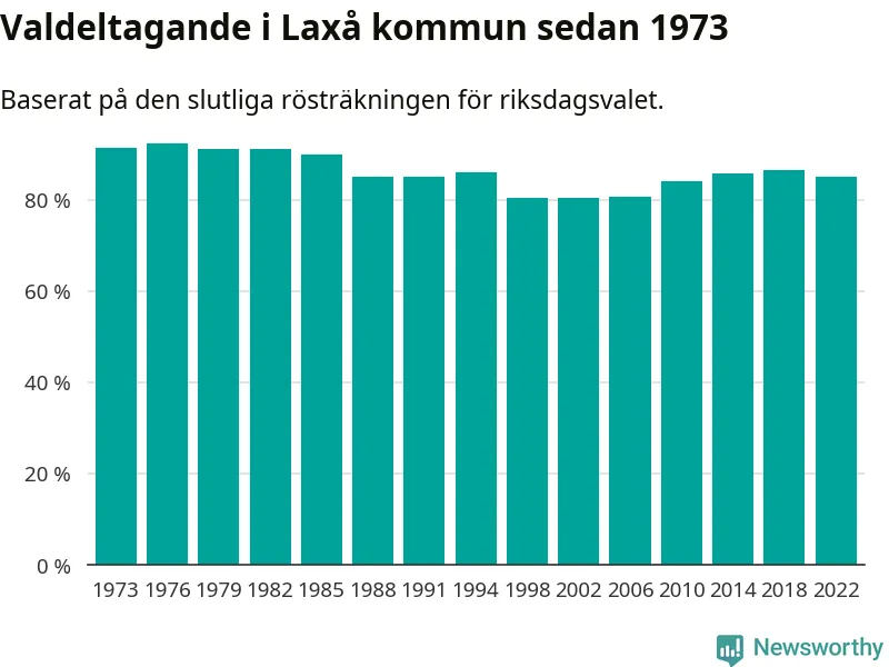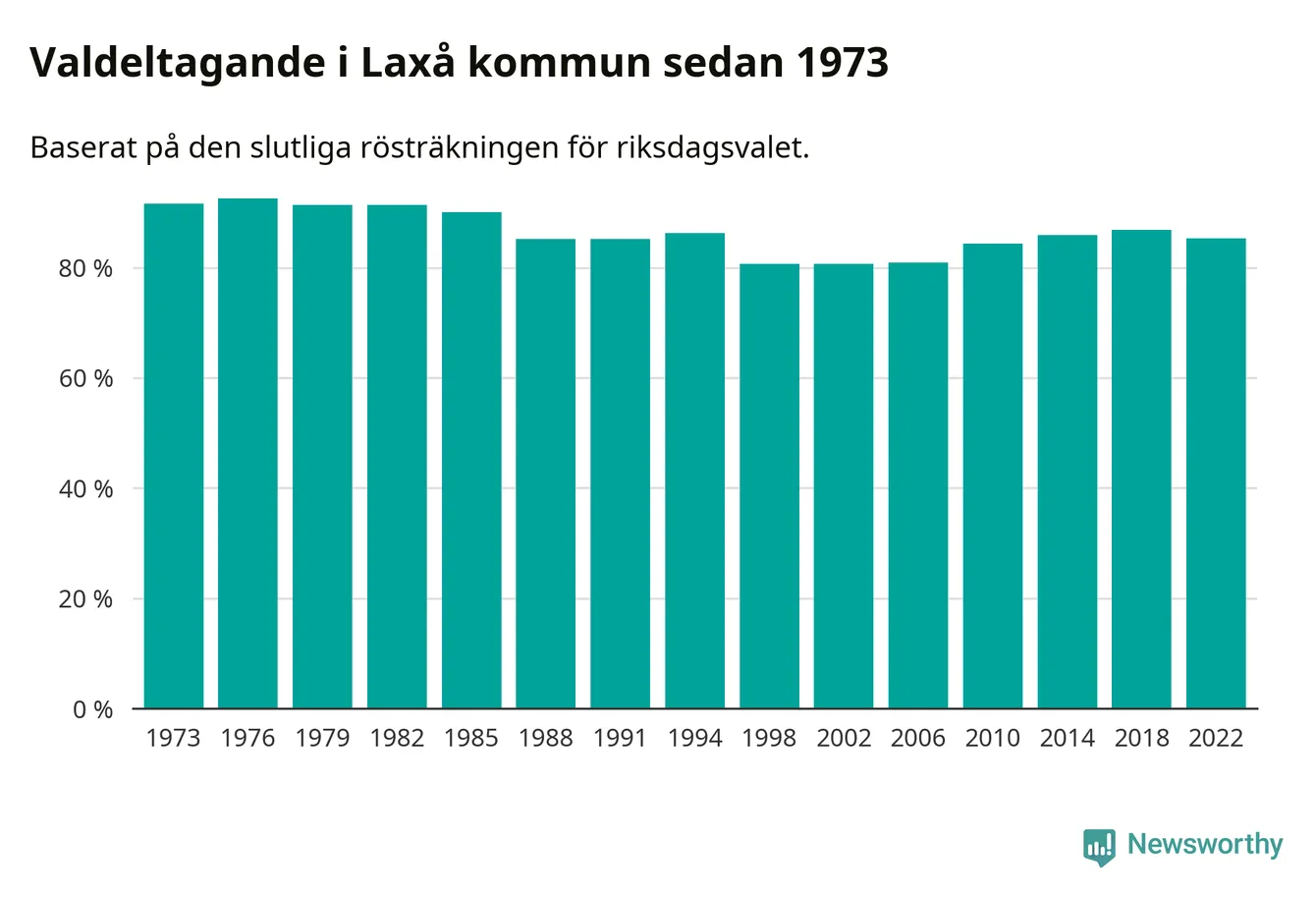 Laxå tillhör Örebro läns valkrets. Där var valdeltagandet förra valet 84,7 procent. I hela riket landade valdeltagandet 2022 på 84,21 procent, att jämföra med 87,18 procent 2018.