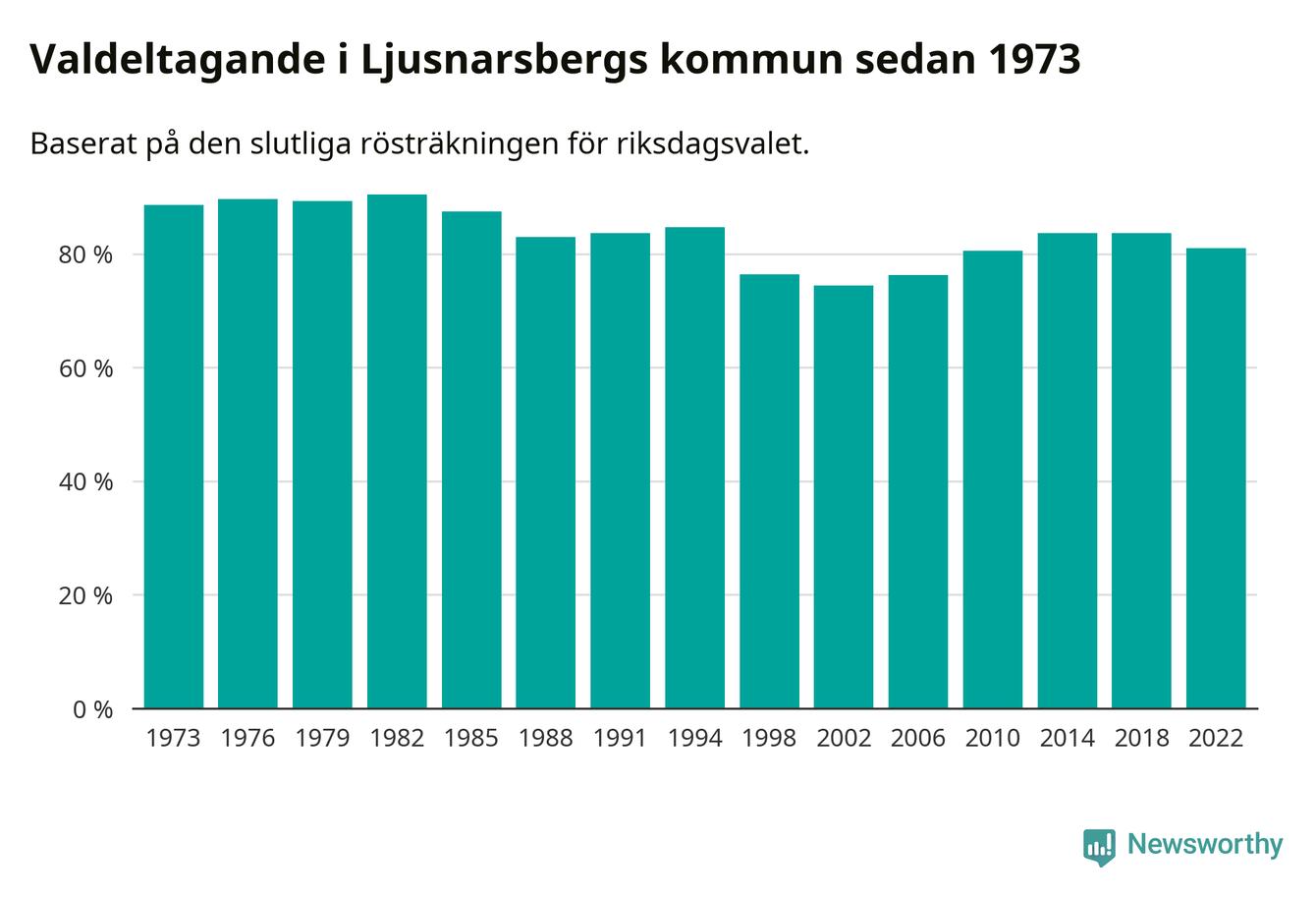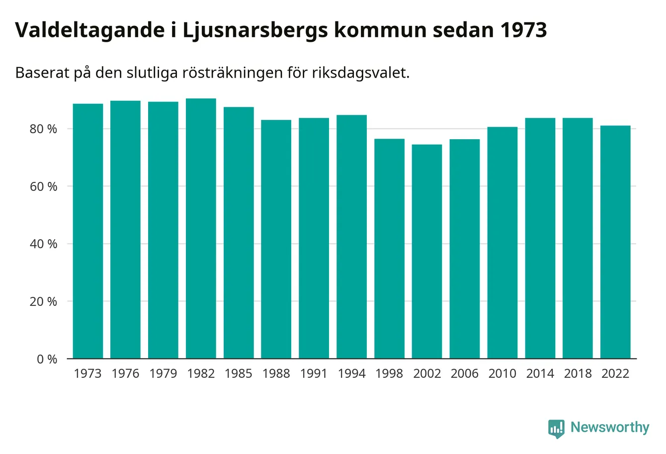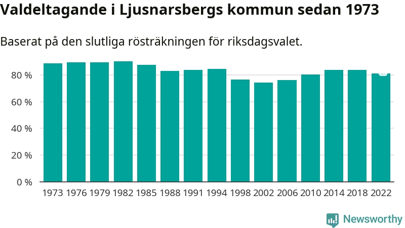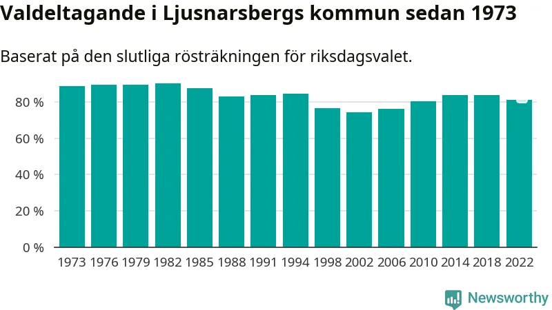 Ljusnarsberg tillhör Örebro läns valkrets. Där var valdeltagandet förra valet 84,7 procent. I hela riket landade valdeltagandet 2022 på 84,21 procent, att jämföra med 87,18 procent 2018.