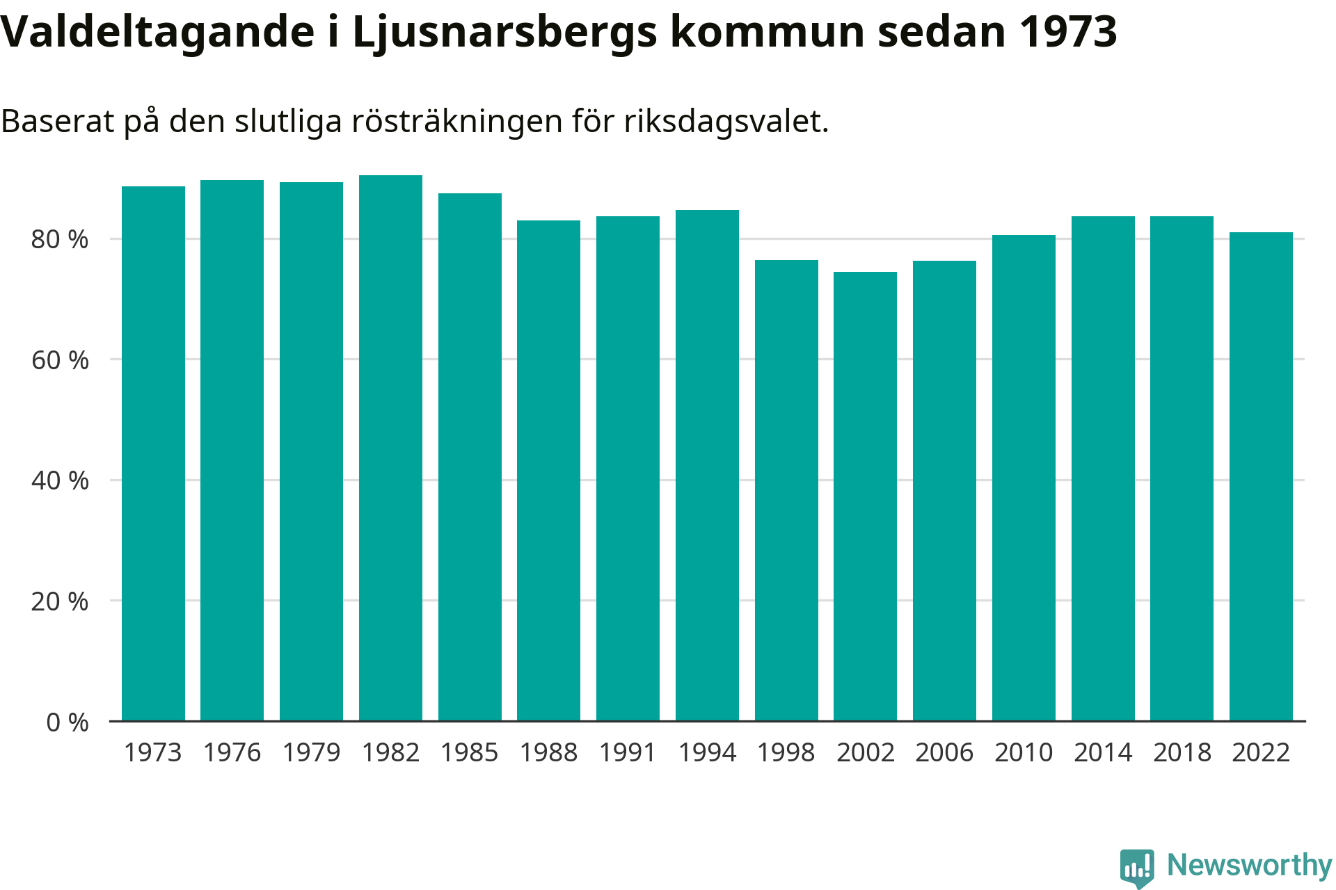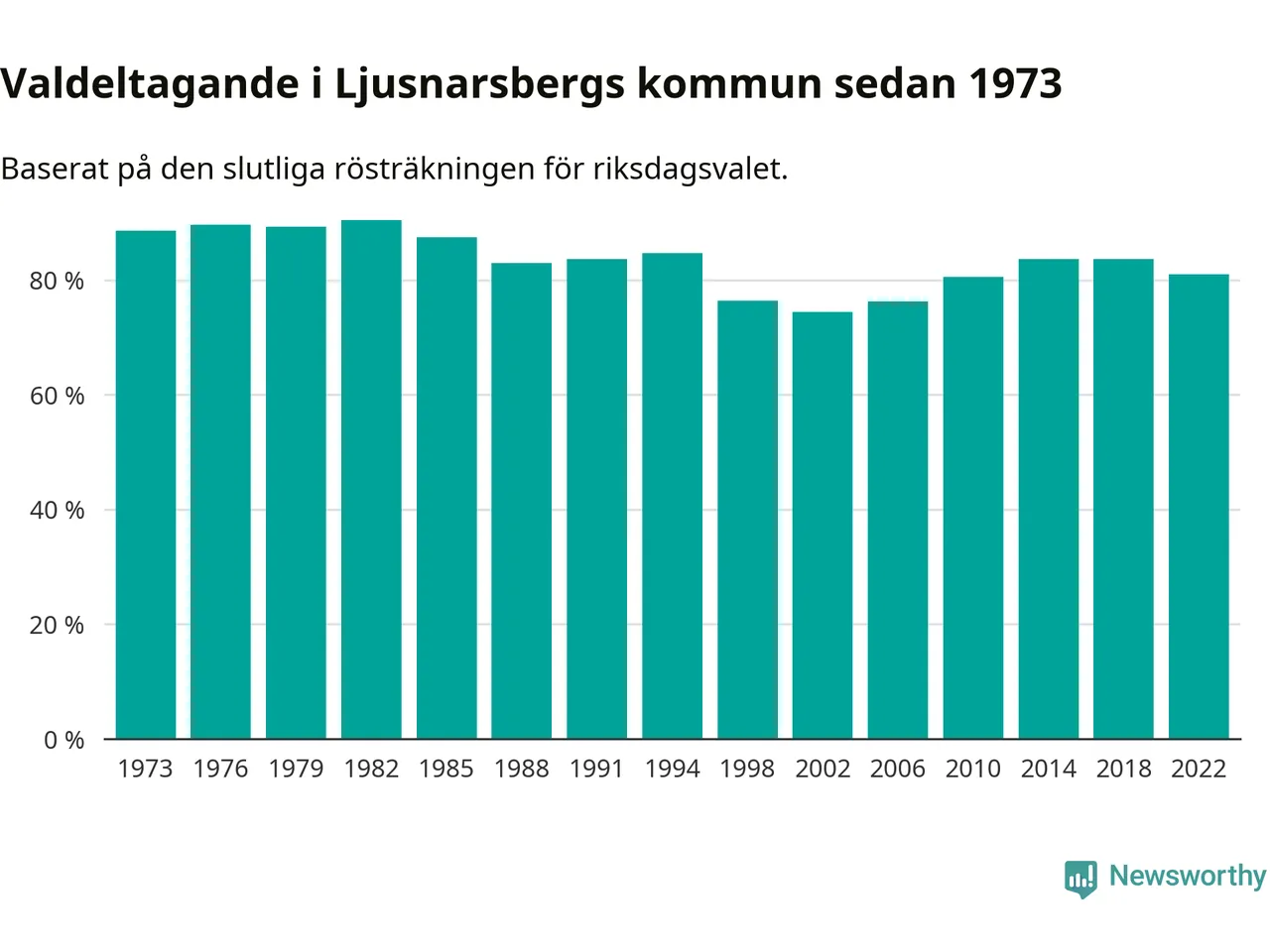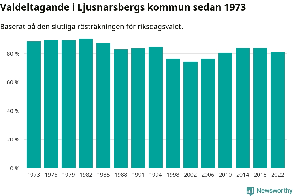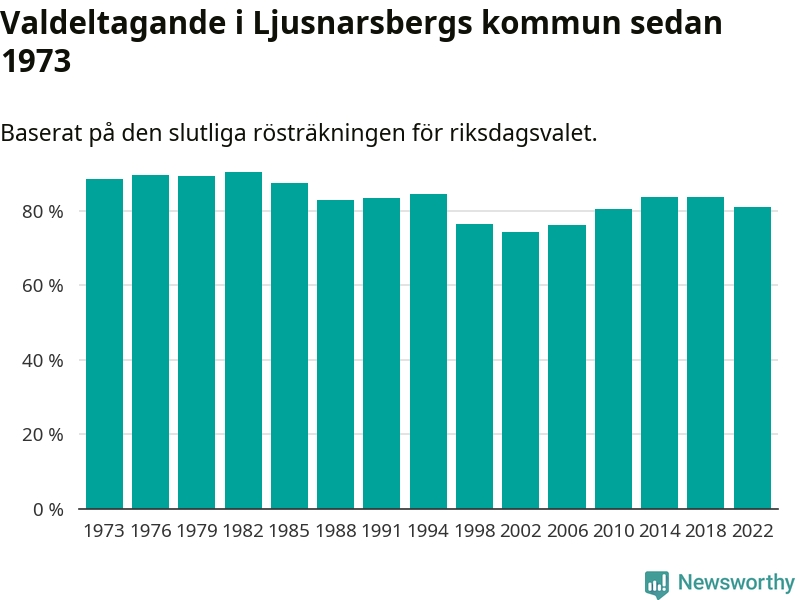 Ljusnarsberg tillhör Örebro läns valkrets. Där var valdeltagandet förra valet 84,7 procent. I hela riket landade valdeltagandet 2022 på 84,21 procent, att jämföra med 87,18 procent 2018.