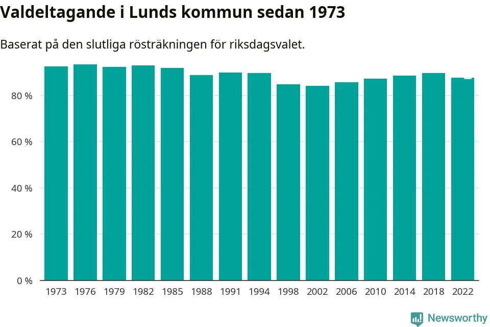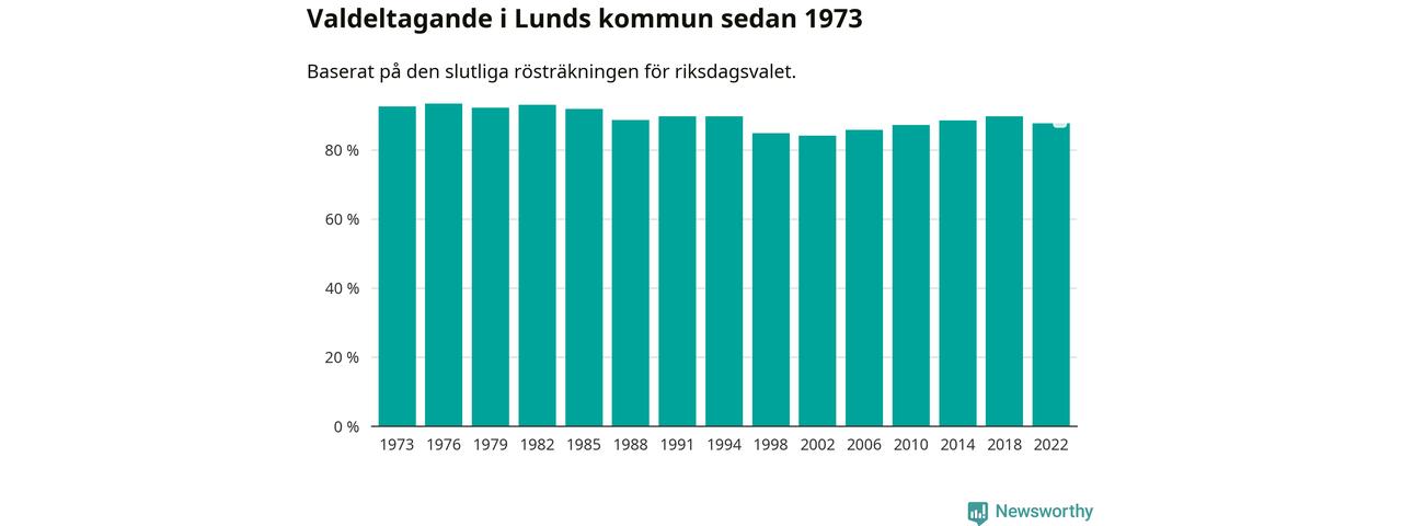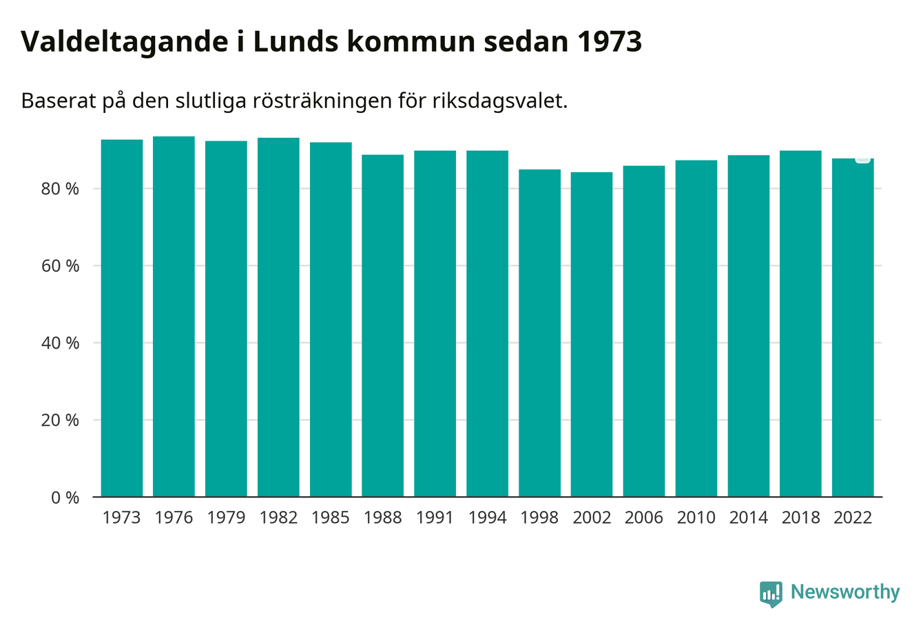 Lund tillhör Skåne läns södra valkrets. Där var valdeltagandet förra valet 87,3 procent. I hela riket landade valdeltagandet 2022 på 84,21 procent, att jämföra med 87,18 procent 2018.