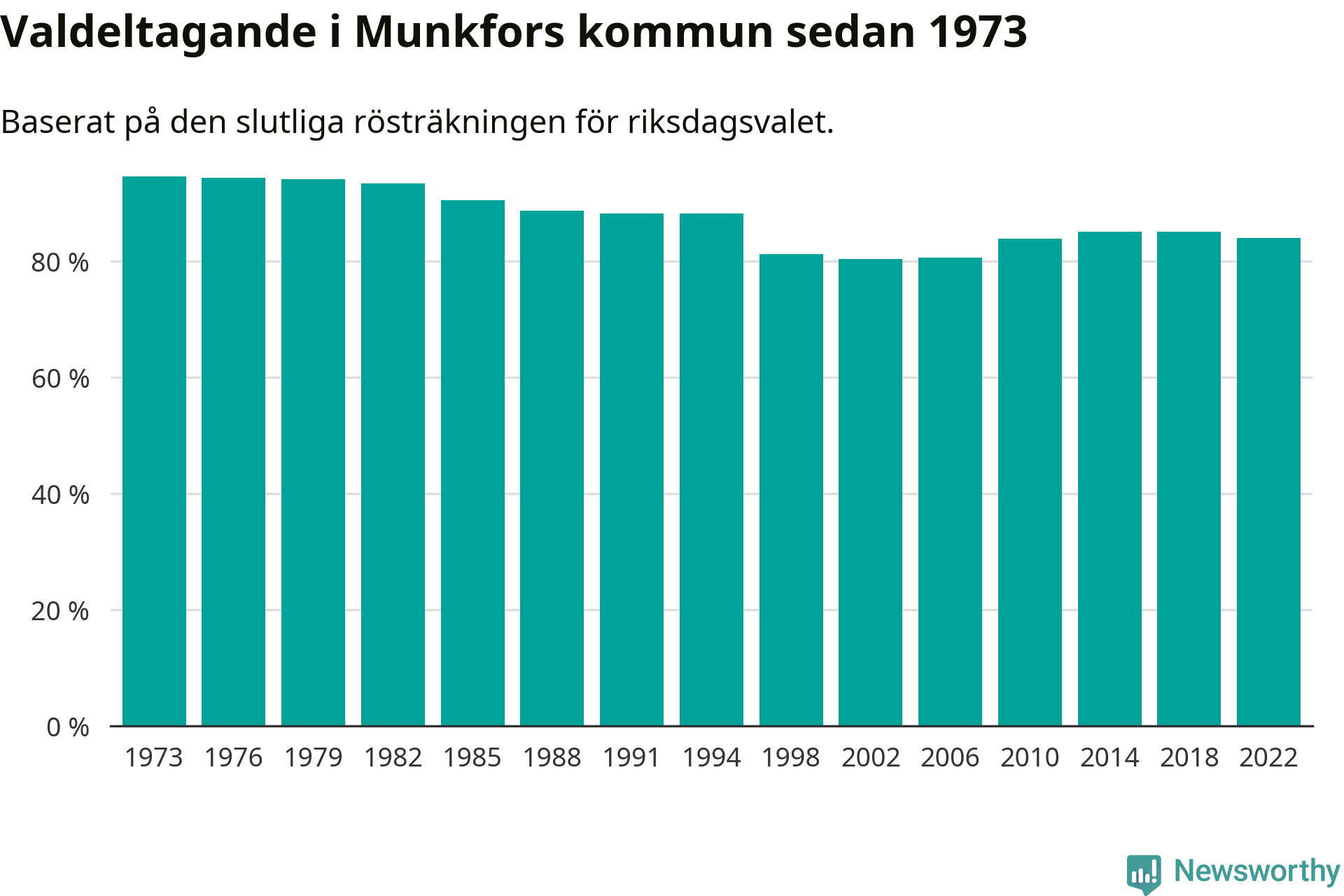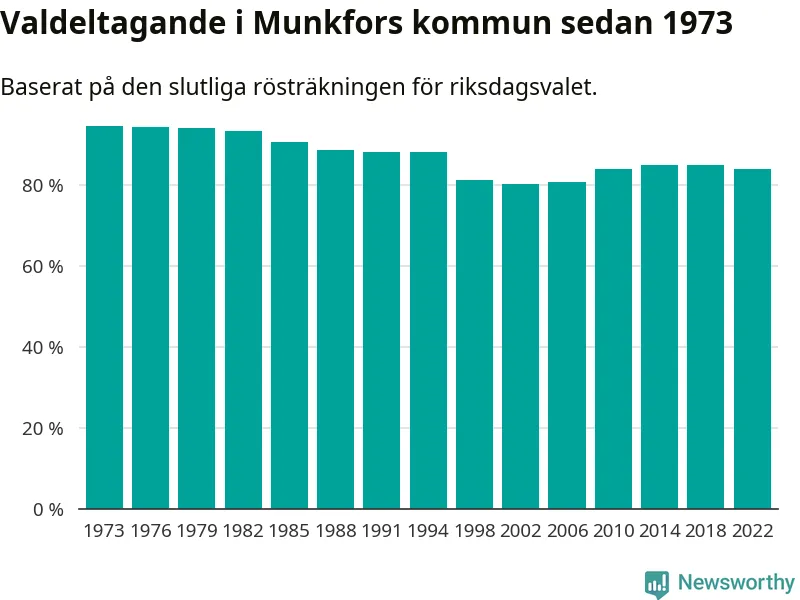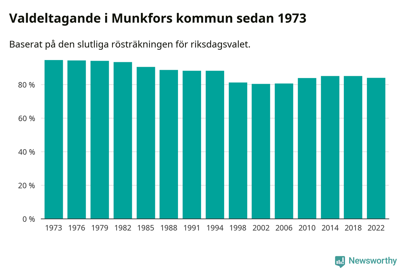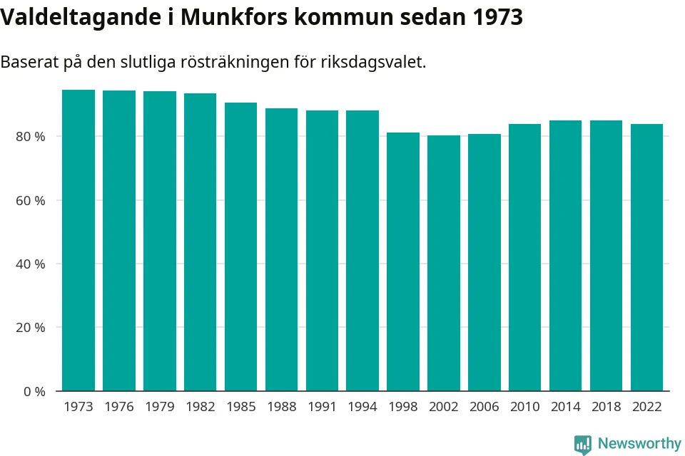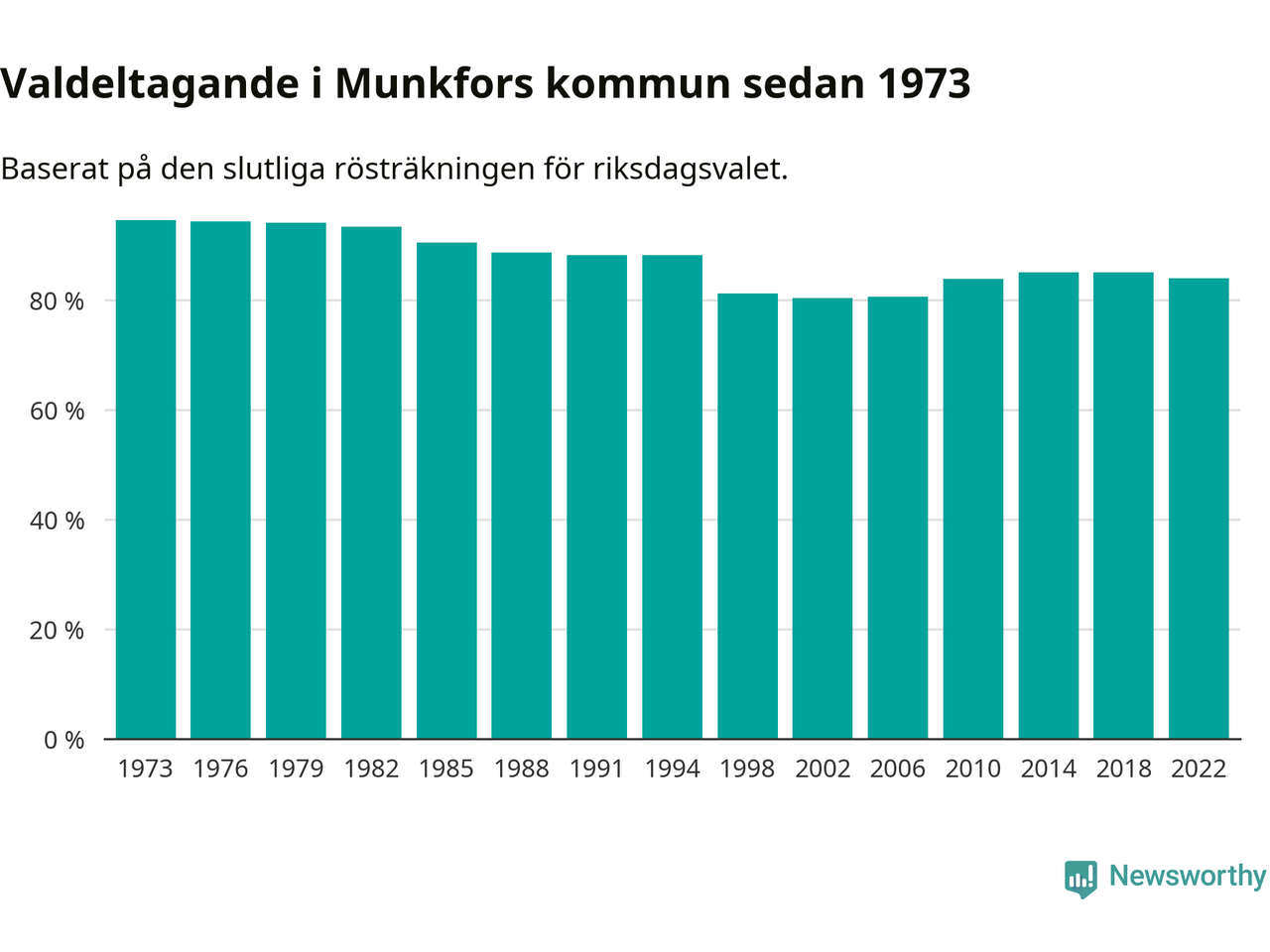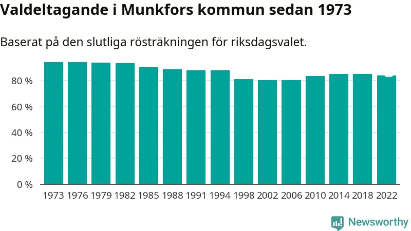 Munkfors tillhör Värmlands läns valkrets. Där var valdeltagandet förra valet 85,2 procent. I hela riket landade valdeltagandet 2022 på 84,21 procent, att jämföra med 87,18 procent 2018.