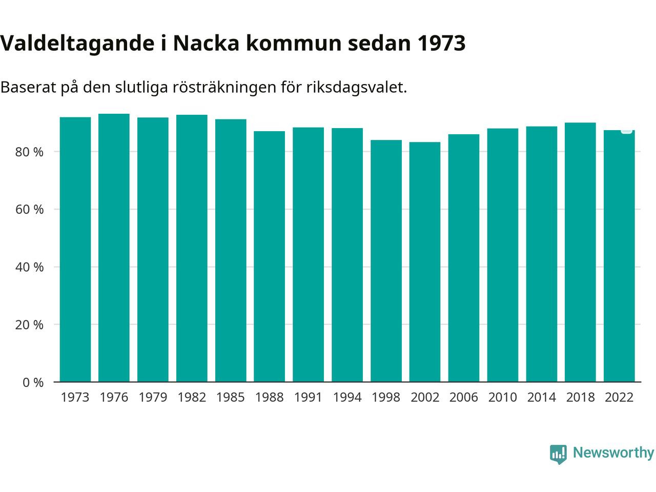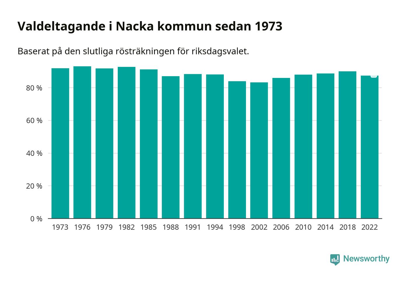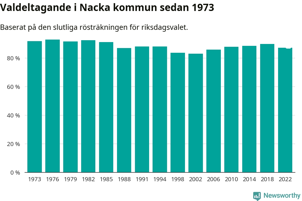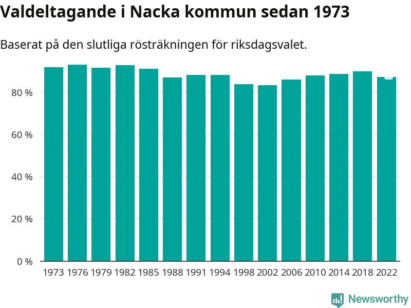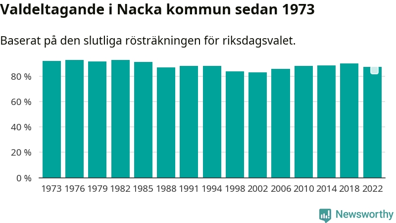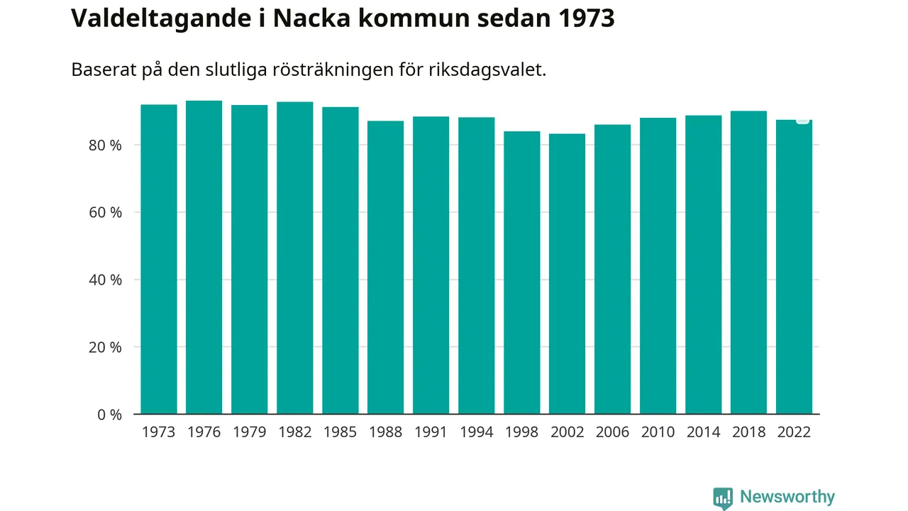 Nacka tillhör Stockholms läns valkrets. Där var valdeltagandet förra valet 82,5 procent. I hela riket landade valdeltagandet 2022 på 84,21 procent, att jämföra med 87,18 procent 2018.