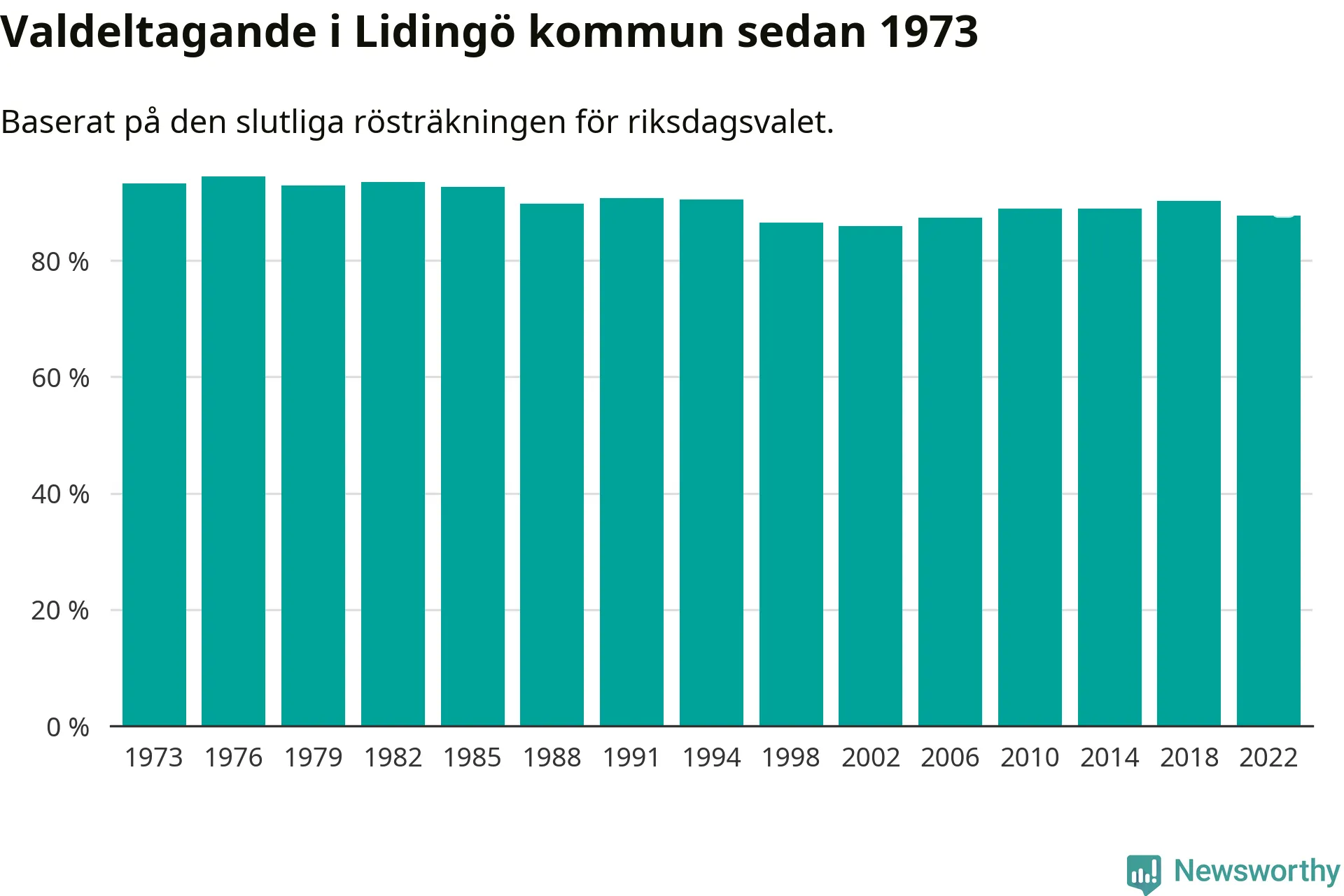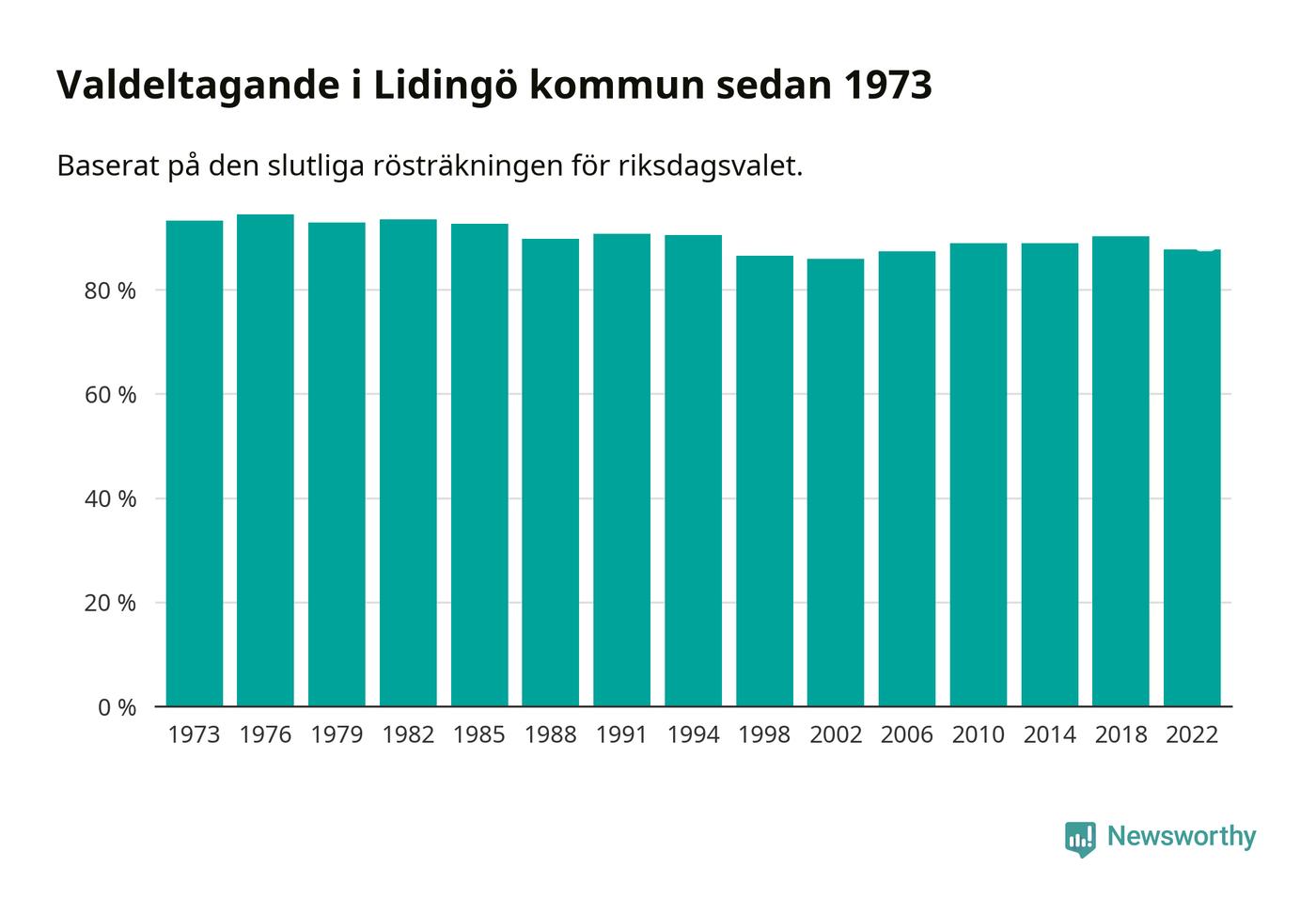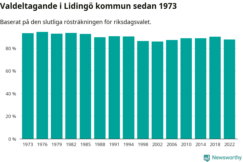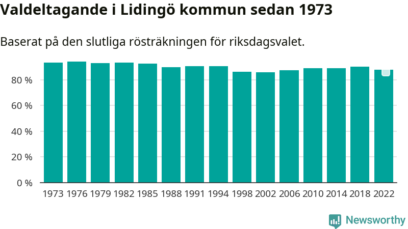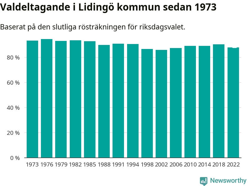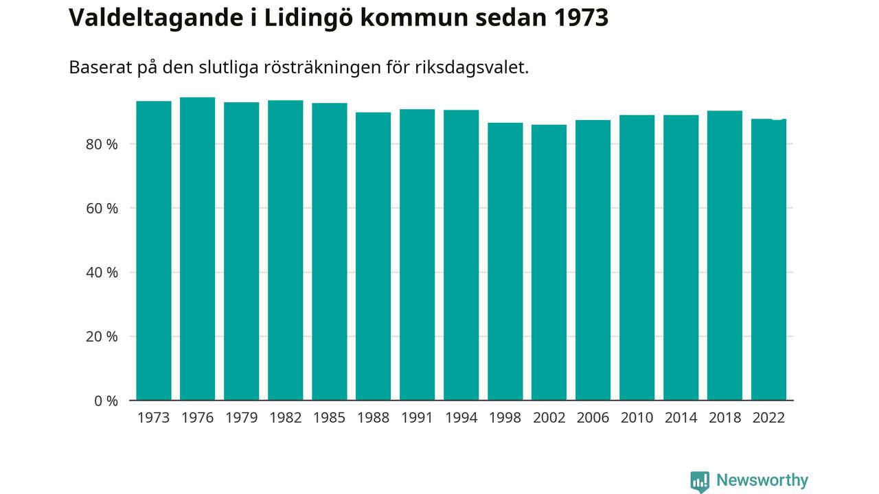 Lidingö tillhör Stockholms läns valkrets. Där var valdeltagandet förra valet 82,5 procent. I hela riket landade valdeltagandet 2022 på 84,21 procent, att jämföra med 87,18 procent 2018.