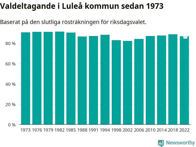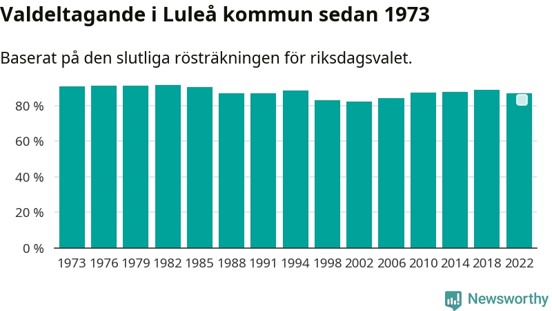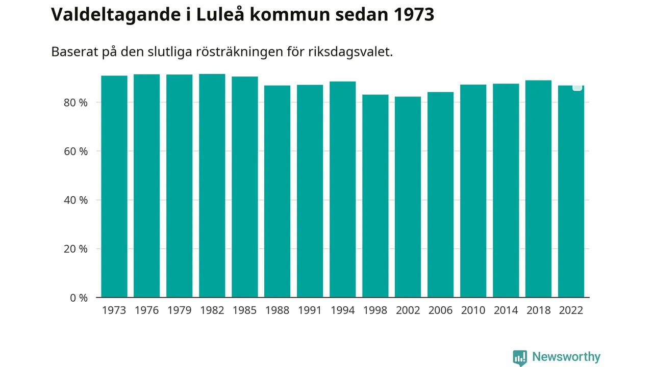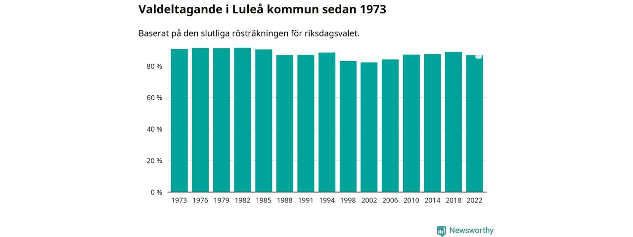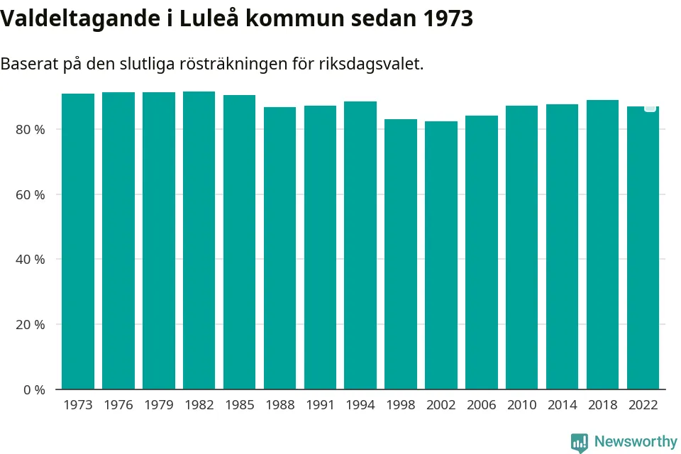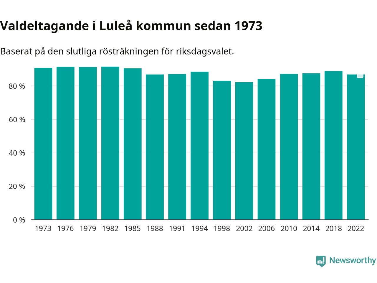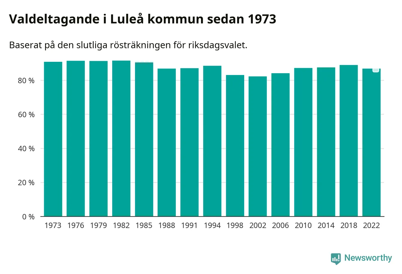Luleå tillhör Norrbottens läns valkrets. Där var valdeltagandet förra valet 84,6 procent. I hela riket landade valdeltagandet 2022 på 84,21 procent, att jämföra med 87,18 procent 2018.