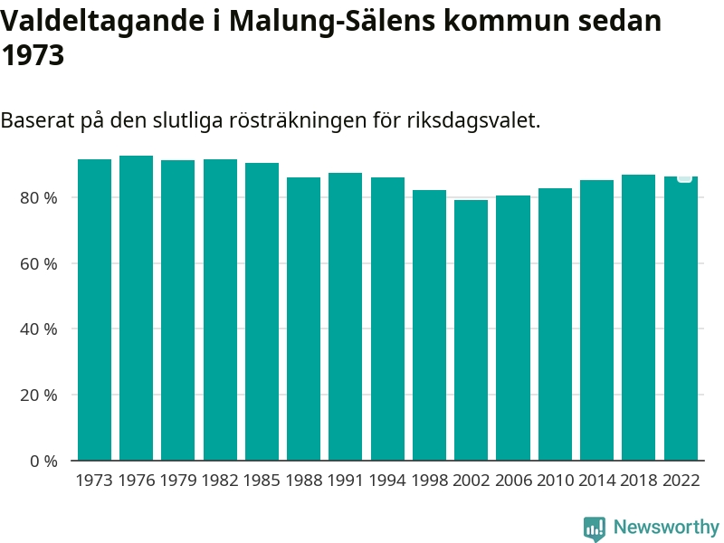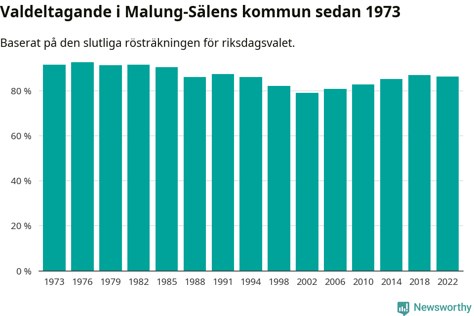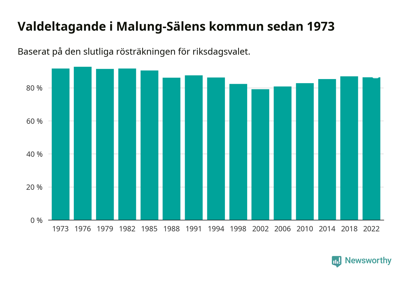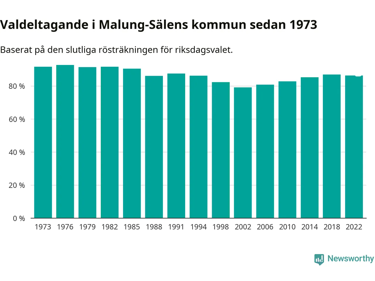 Malung-Sälen tillhör Dalarnas läns valkrets. Där var valdeltagandet förra valet 85,4 procent. I hela riket landade valdeltagandet 2022 på 84,21 procent, att jämföra med 87,18 procent 2018.