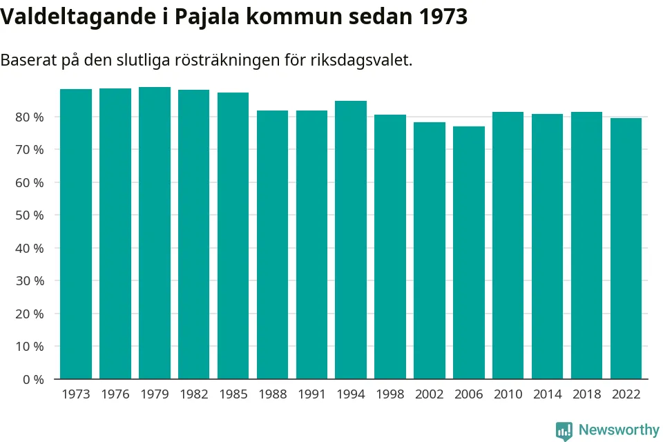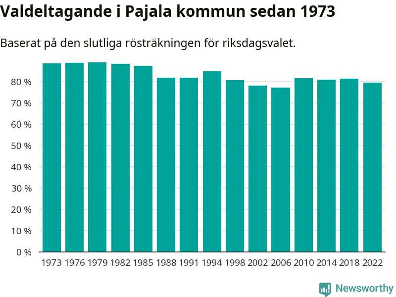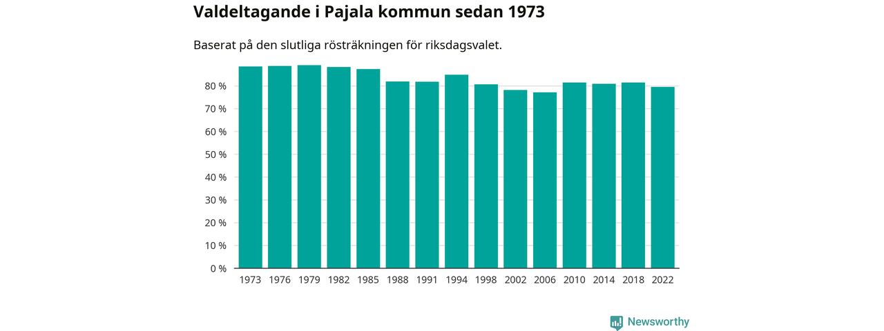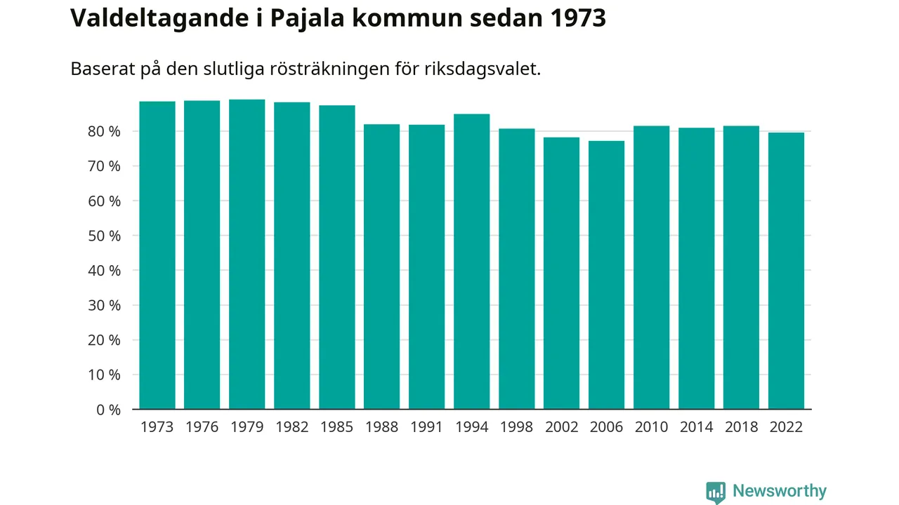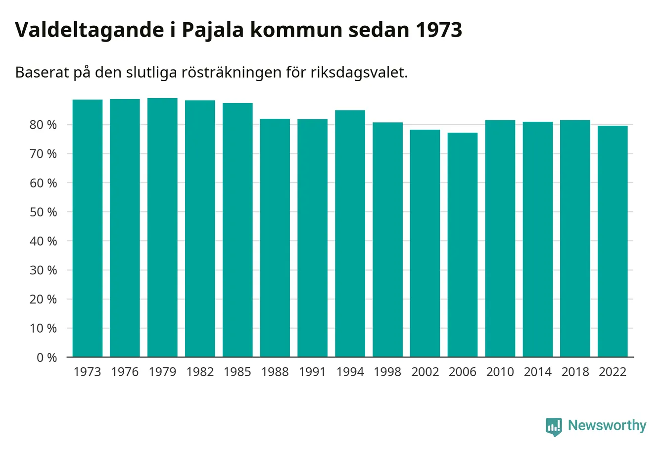 Pajala tillhör Norrbottens läns valkrets. Där var valdeltagandet förra valet 84,6 procent. I hela riket landade valdeltagandet 2022 på 84,21 procent, att jämföra med 87,18 procent 2018.