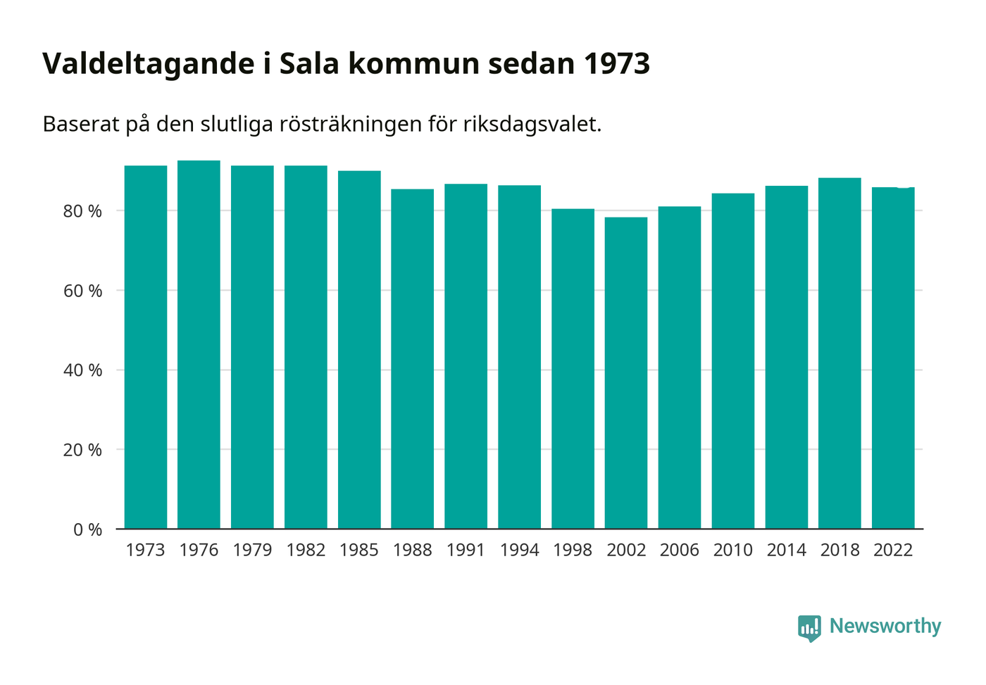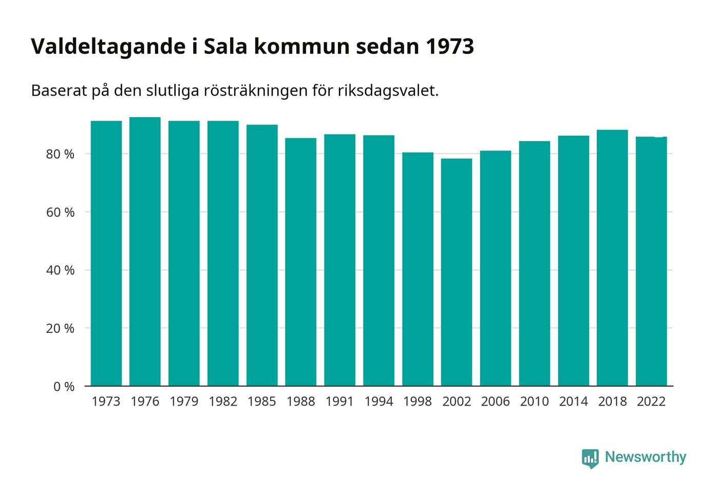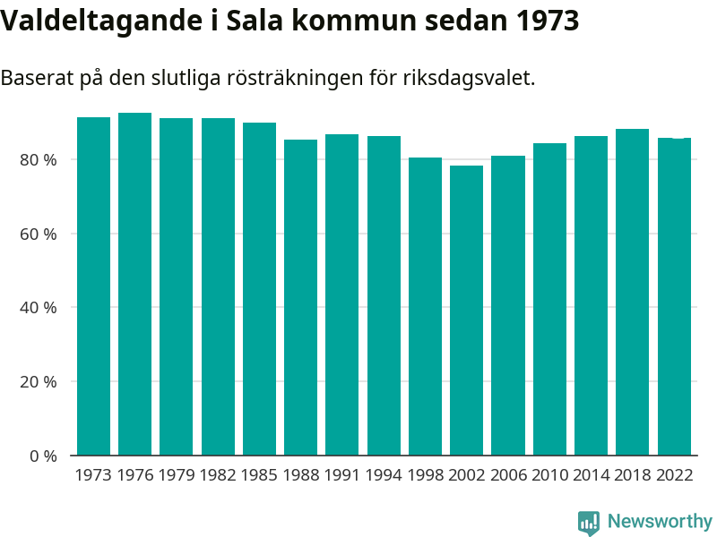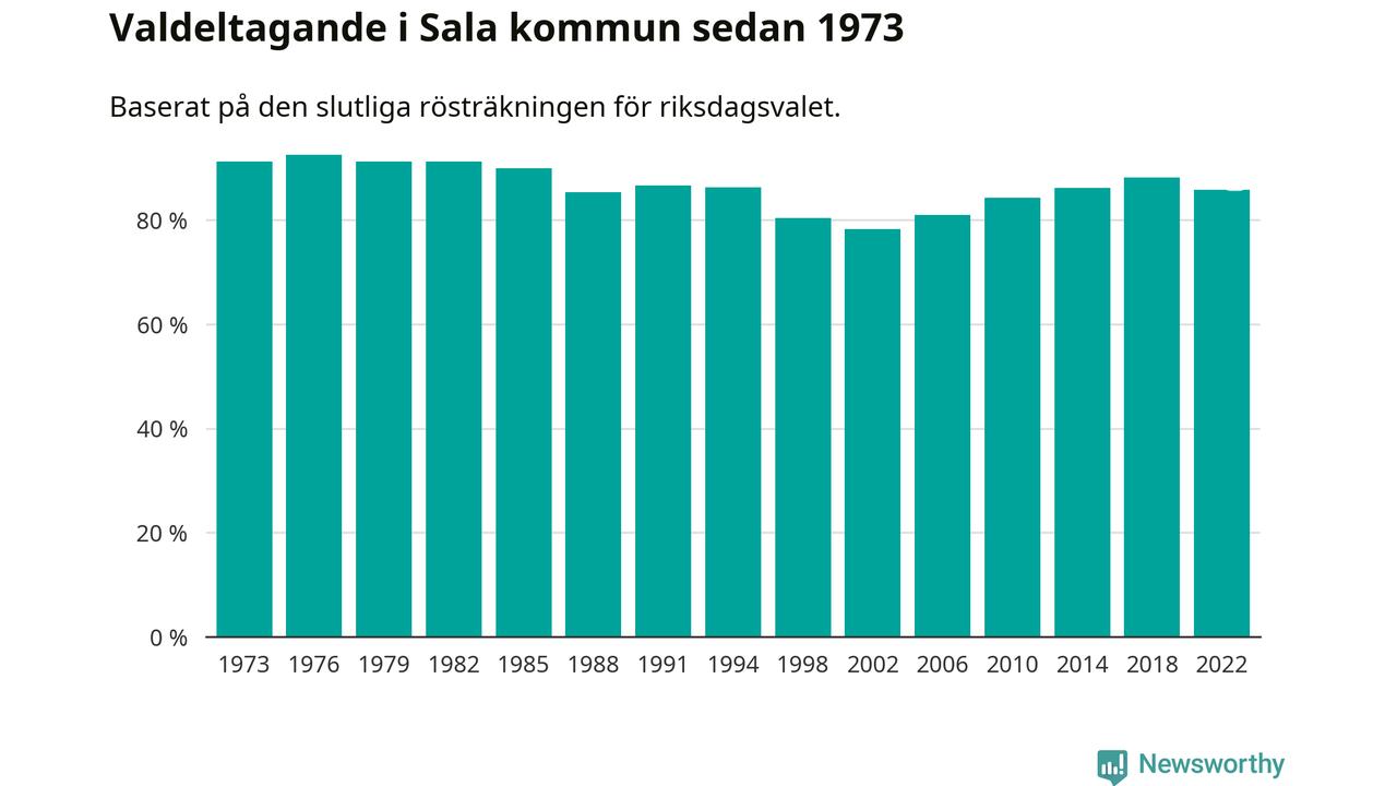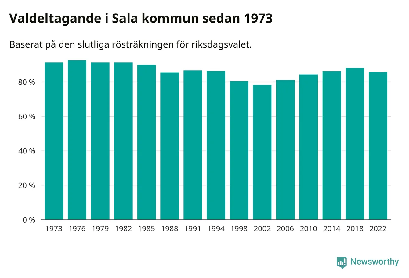 Högst valdeltagande i Västmanlands läns valkrets, som Sala tillhör, noterades i Sala kommun, där 85,8 procent röstade i riksdagsvalet. Lägst var valdeltagande i valkretsen i Fagersta kommun, 80,8 procent.