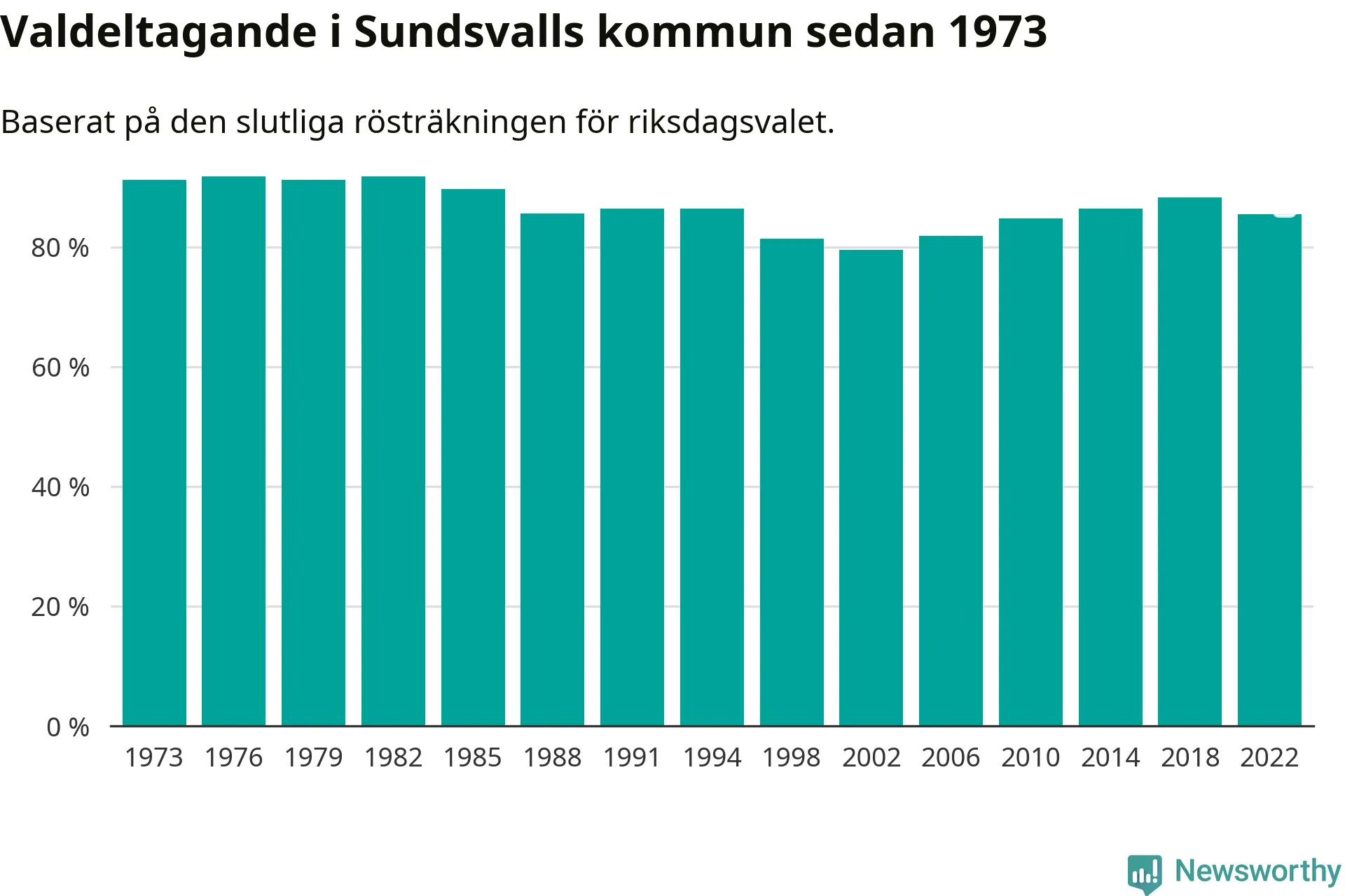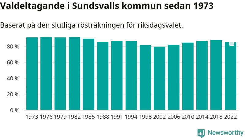 Sundsvall tillhör Västernorrlands läns valkrets. Där var valdeltagandet förra valet 85,2 procent. I hela riket landade valdeltagandet 2022 på 84,21 procent, att jämföra med 87,18 procent 2018.