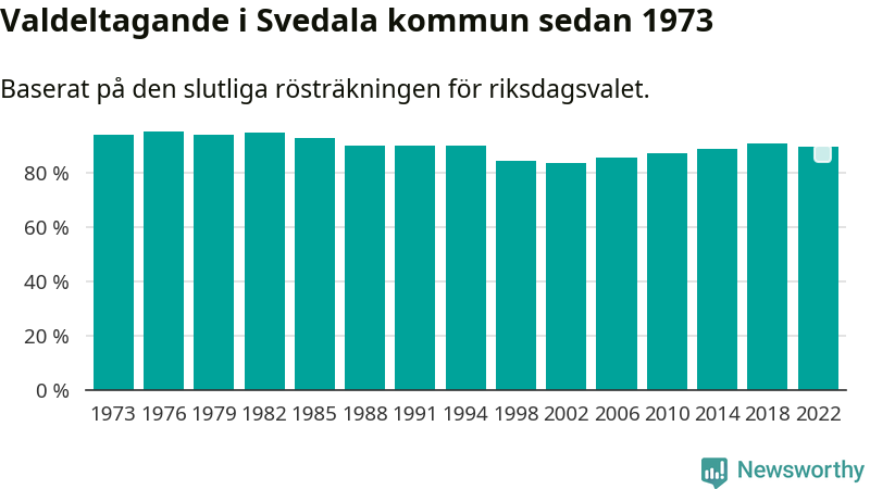 Svedala tillhör Skåne läns södra valkrets. Där var valdeltagandet förra valet 87,3 procent. I hela riket landade valdeltagandet 2022 på 84,21 procent, att jämföra med 87,18 procent 2018.