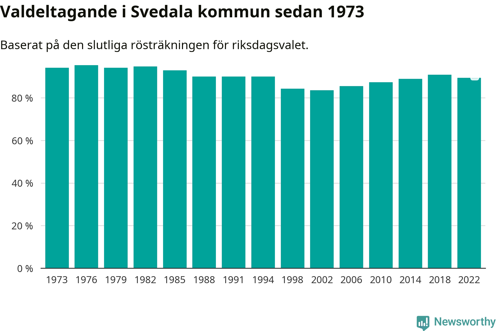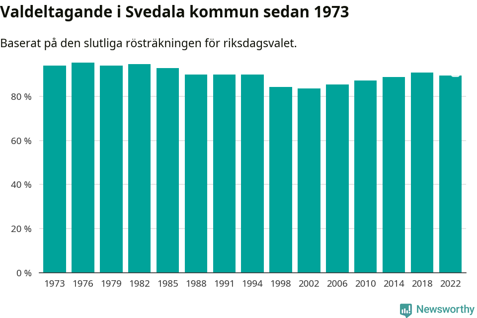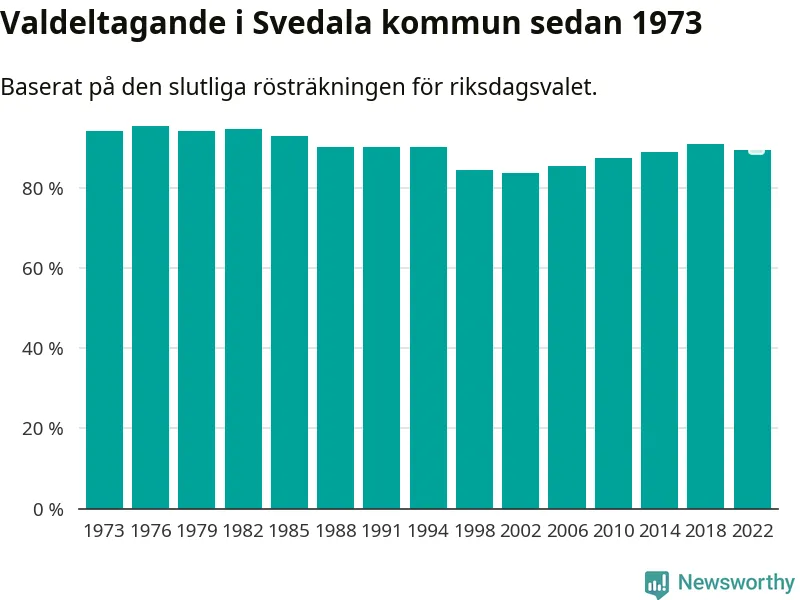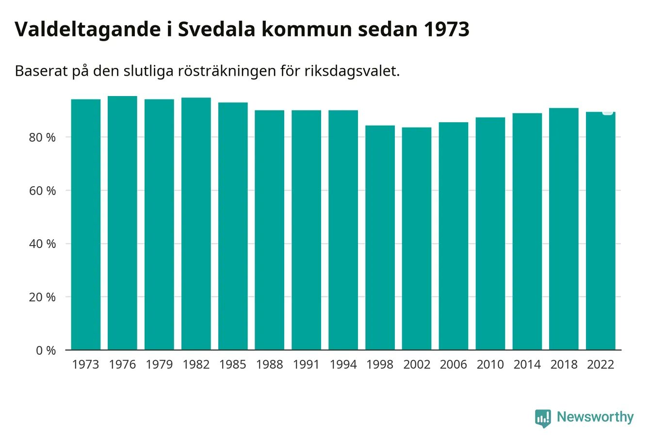 I höst går 16 936 Svedalabor till val. Sist landade valdeltagandet på 89 procent, en minskning för första gången sedan 2002 i kommunen.