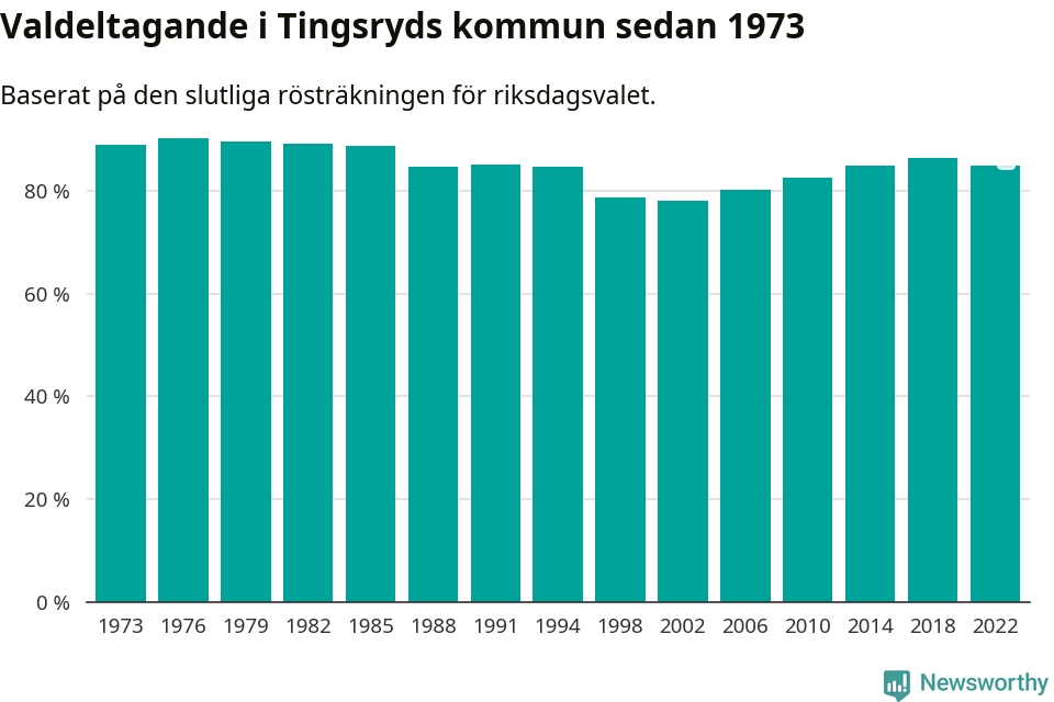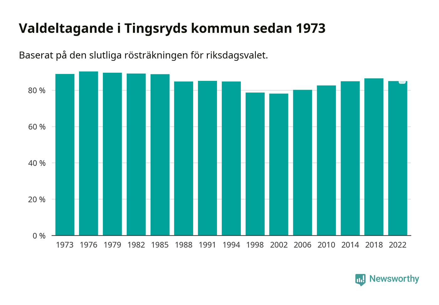 Tingsryd tillhör Kronobergs läns valkrets. Där var valdeltagandet förra valet 85,5 procent. I hela riket landade valdeltagandet 2022 på 84,21 procent, att jämföra med 87,18 procent 2018.