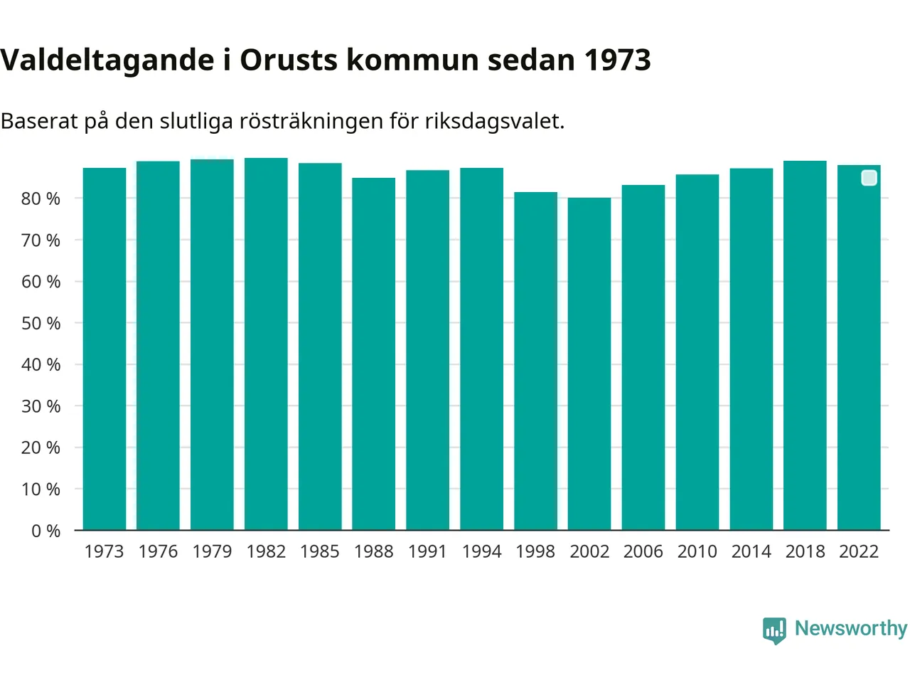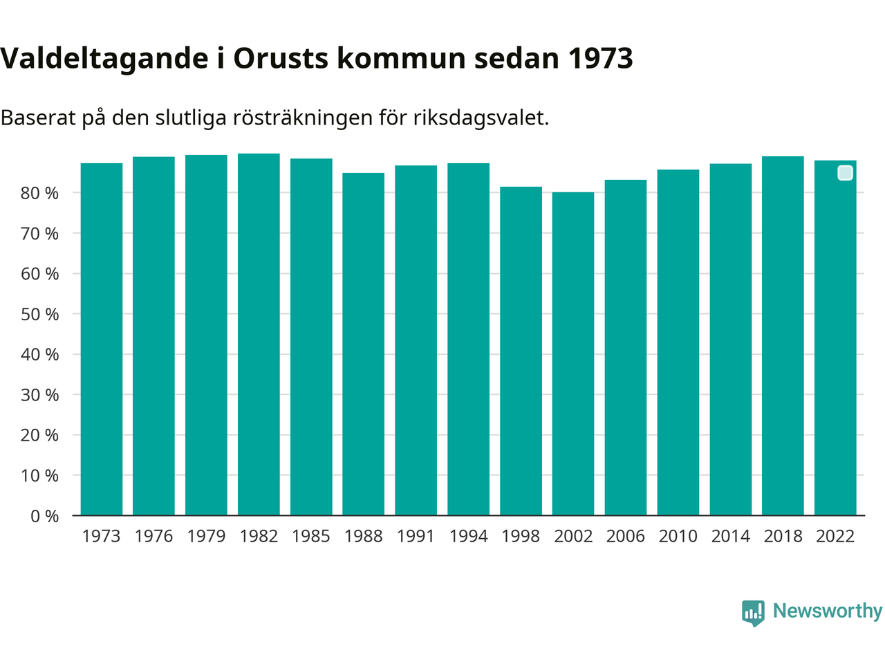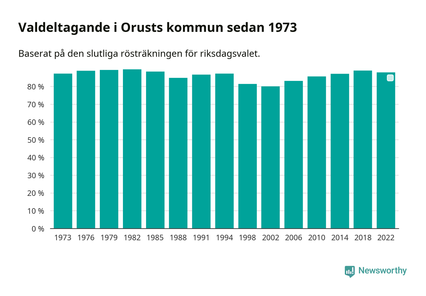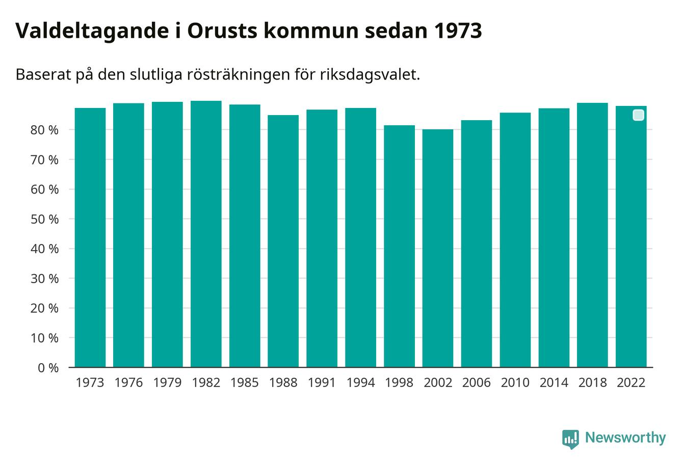 Orust tillhör Västra Götalands läns norra valkrets. Där var valdeltagandet förra valet 84,4 procent. I hela riket landade valdeltagandet 2022 på 84,21 procent, att jämföra med 87,18 procent 2018.