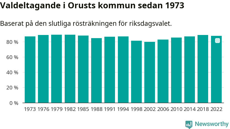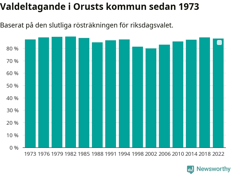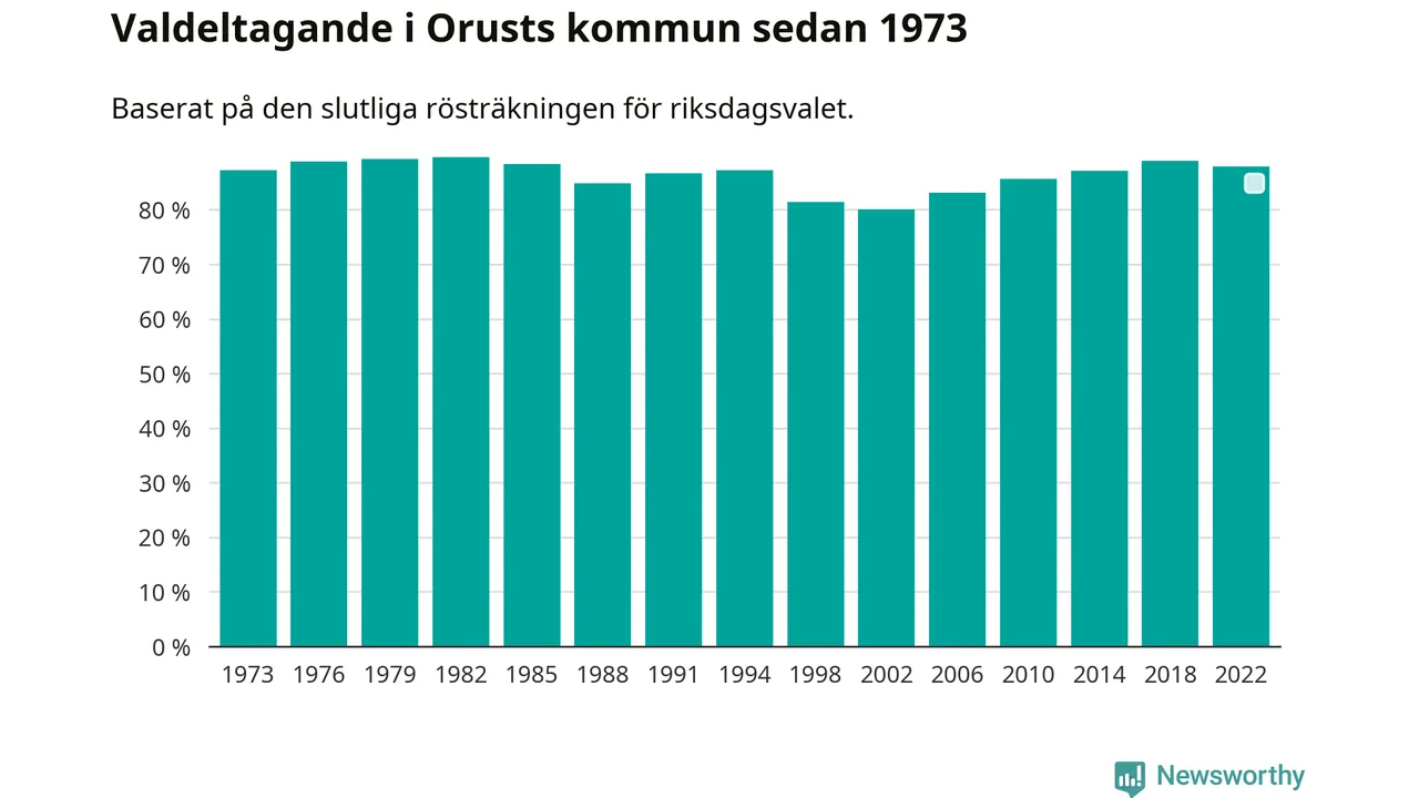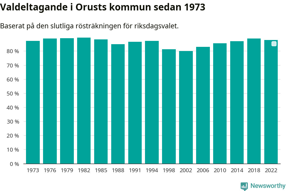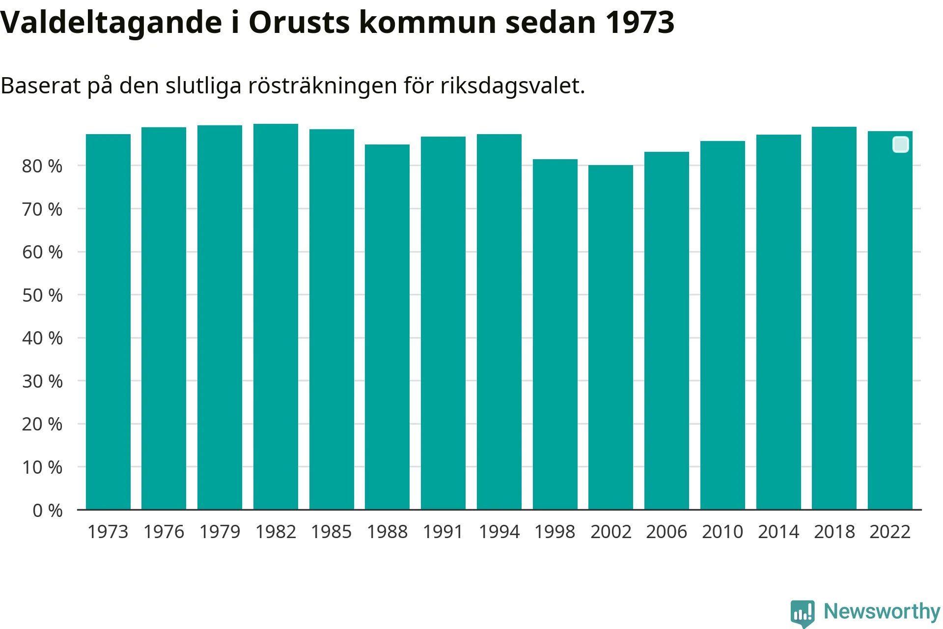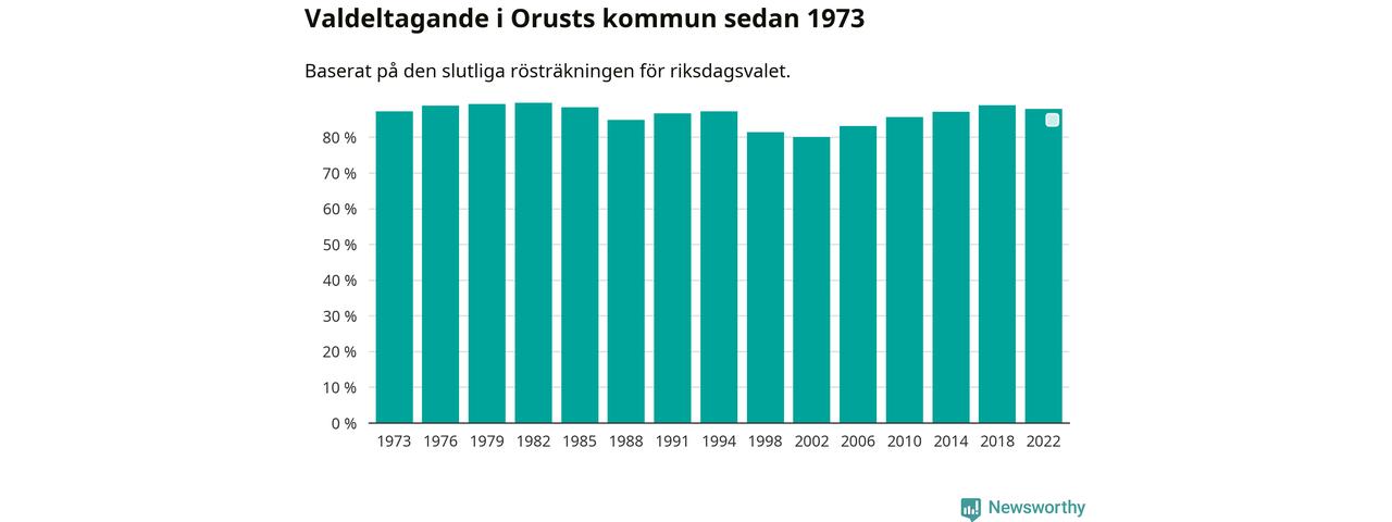 Orust tillhör Västra Götalands läns norra valkrets. Där var valdeltagandet förra valet 84,4 procent. I hela riket landade valdeltagandet 2022 på 84,21 procent, att jämföra med 87,18 procent 2018.