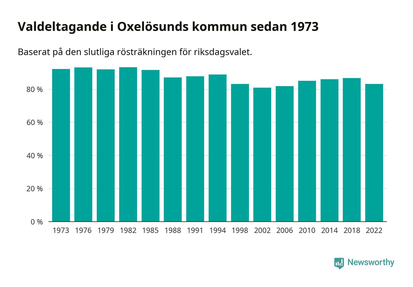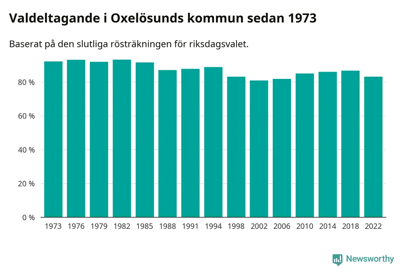 Oxelösund tillhör Södermanlands läns valkrets. Där var valdeltagandet förra valet 83,5 procent. I hela riket landade valdeltagandet 2022 på 84,21 procent, att jämföra med 87,18 procent 2018.