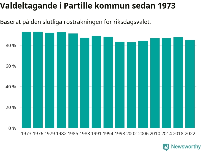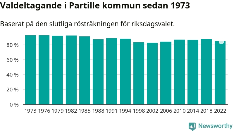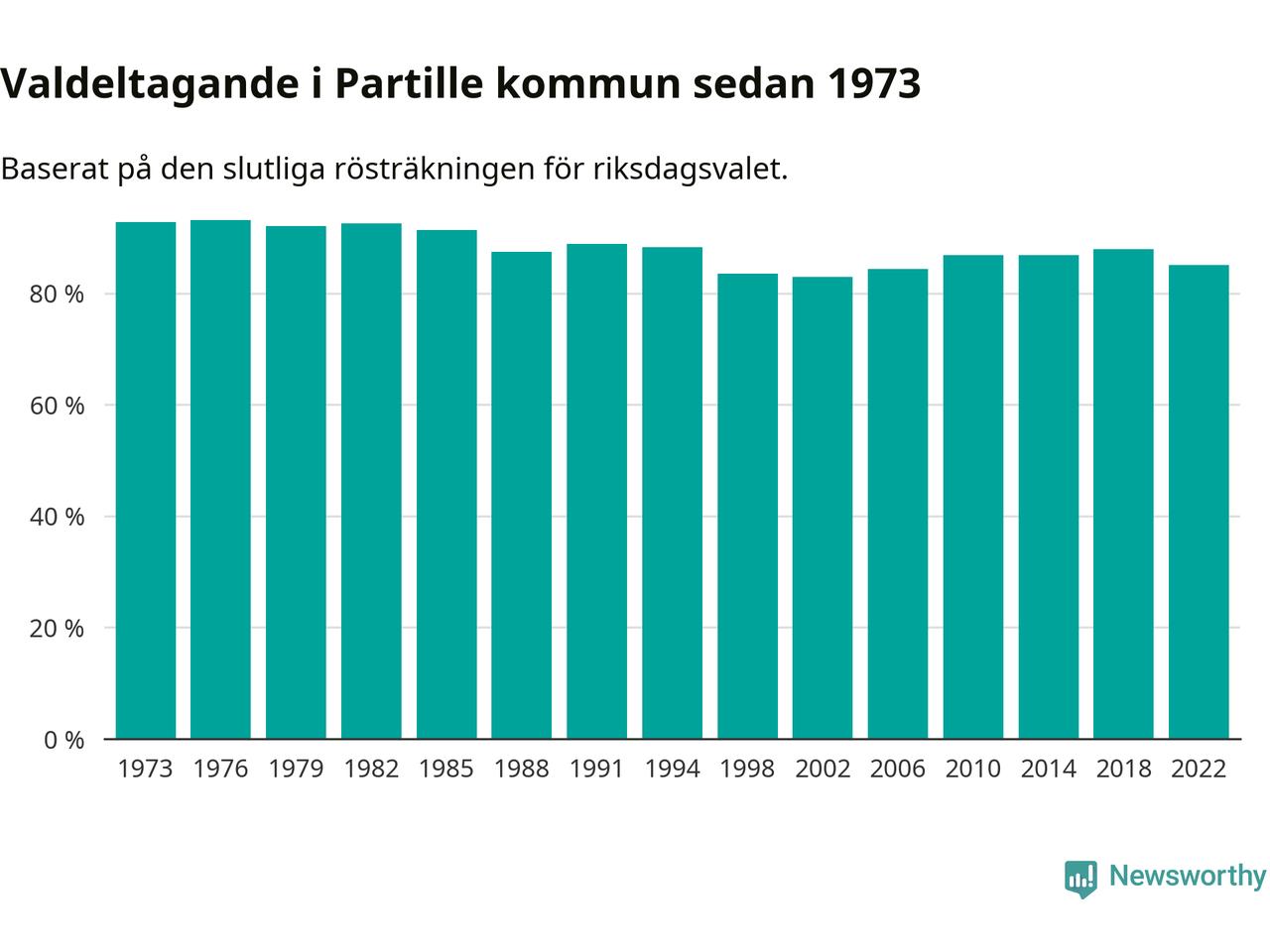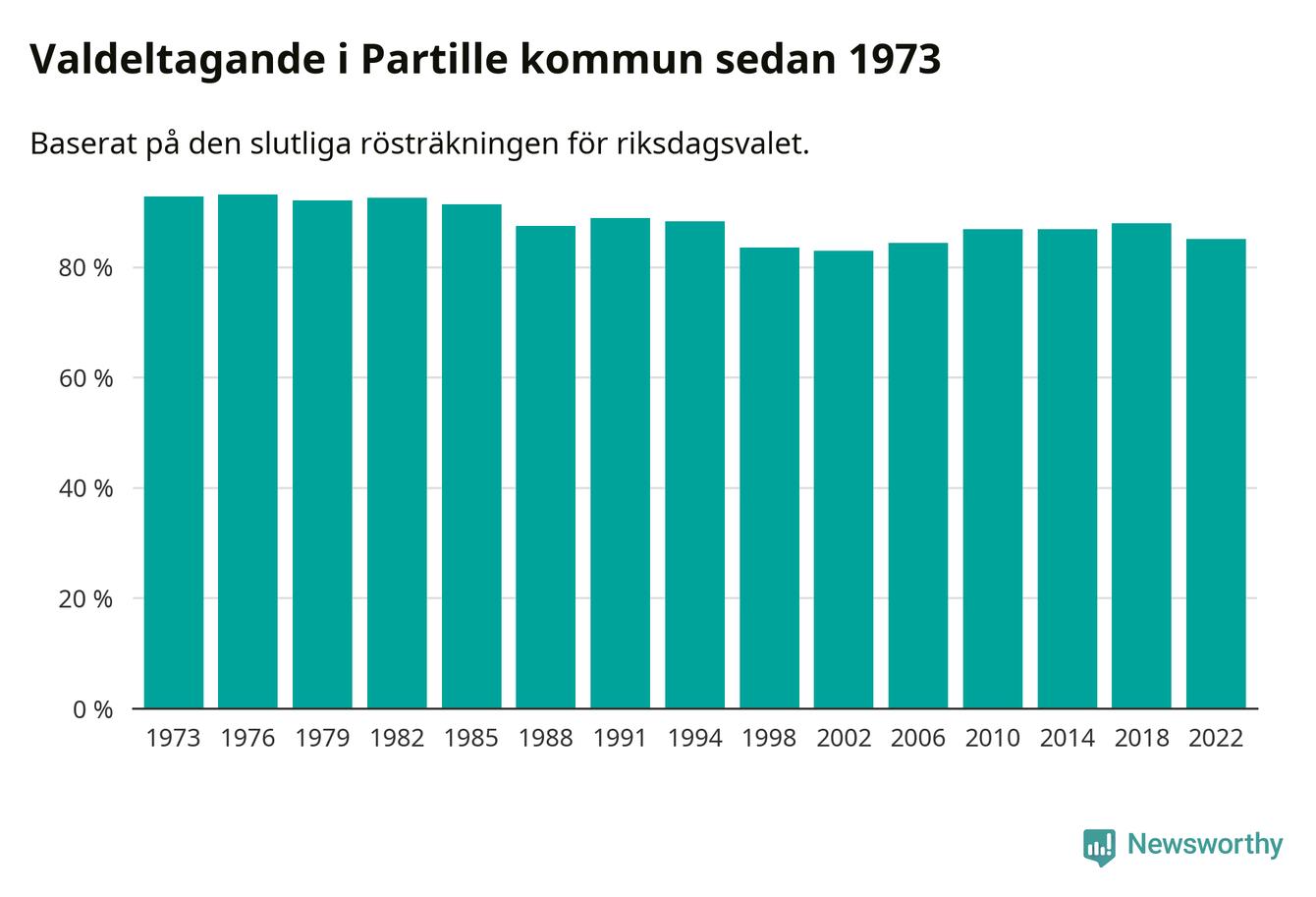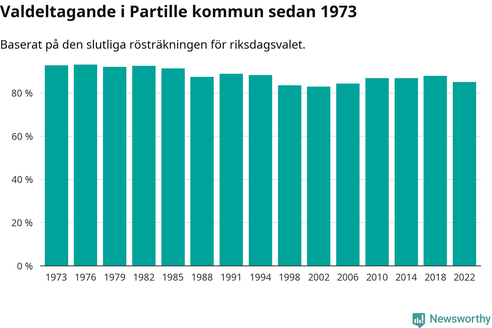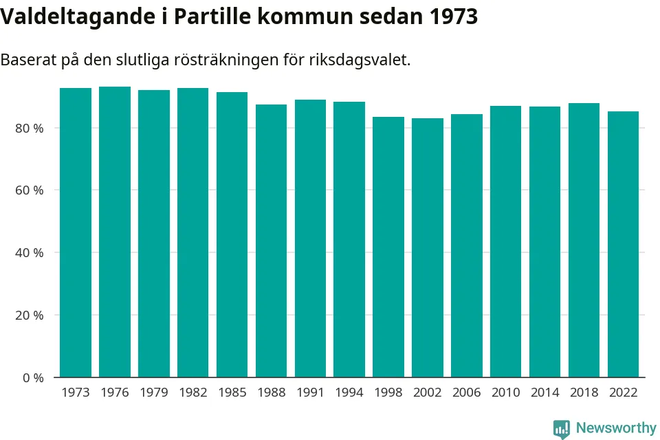 Partille tillhör Västra Götalands läns västra valkrets. Där var valdeltagandet förra valet 87,6 procent. I hela riket landade valdeltagandet 2022 på 84,21 procent, att jämföra med 87,18 procent 2018.