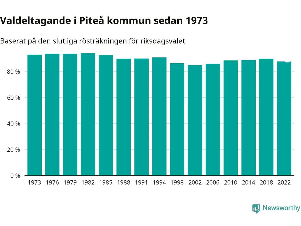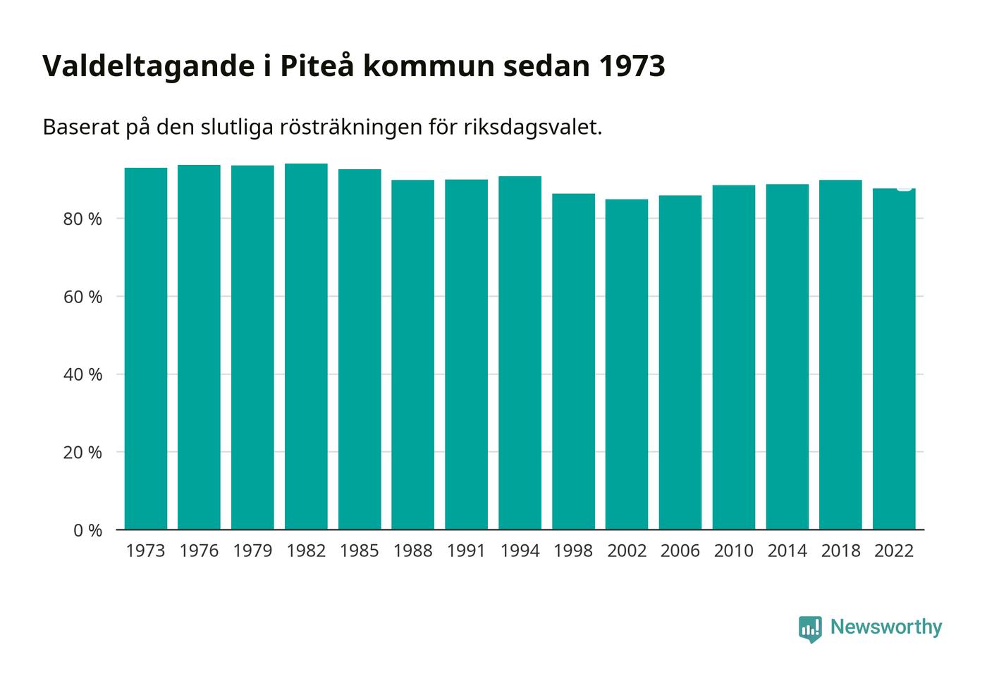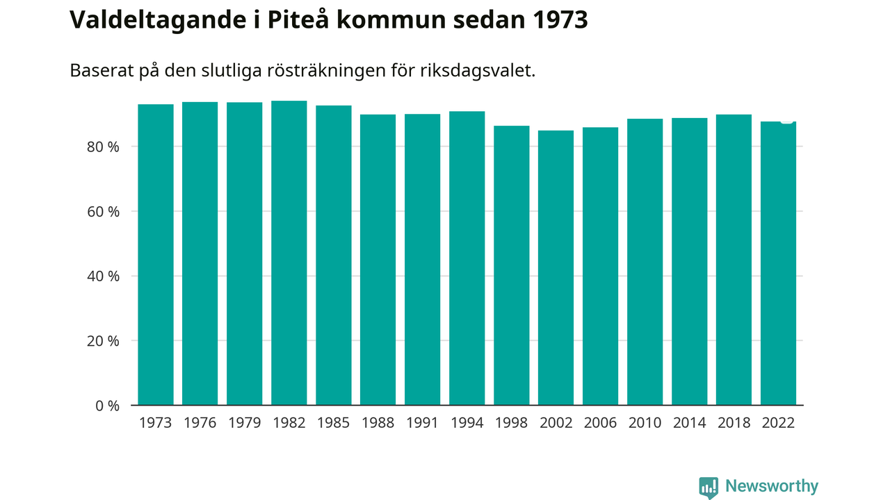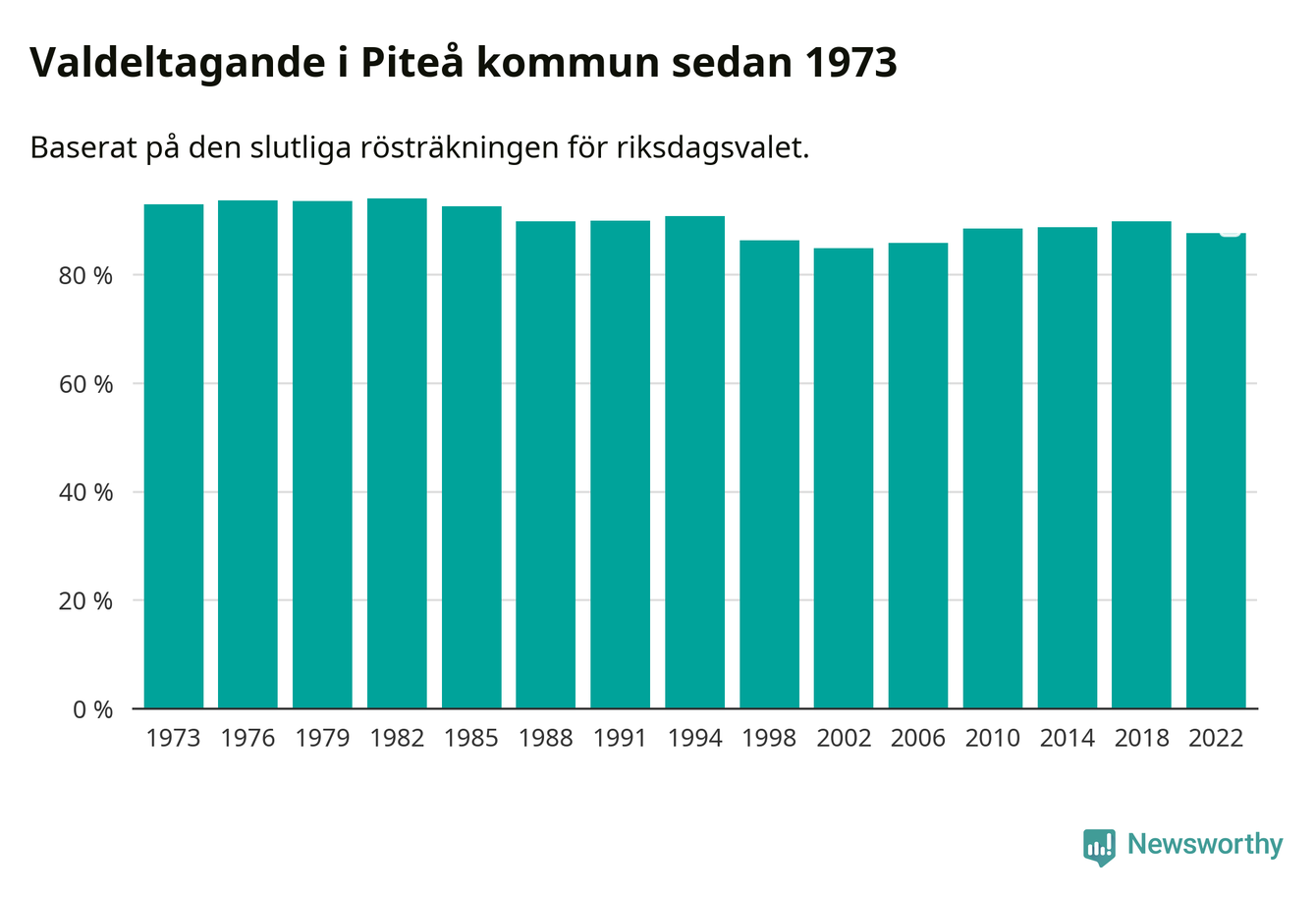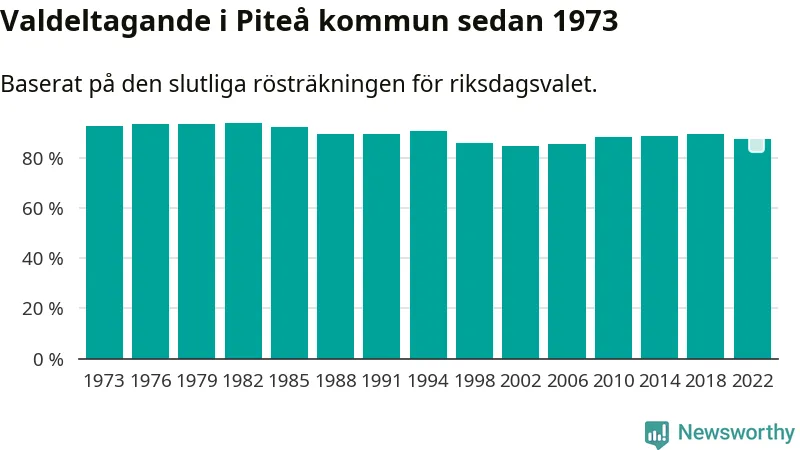 Piteå tillhör Norrbottens läns valkrets. Där var valdeltagandet förra valet 84,6 procent. I hela riket landade valdeltagandet 2022 på 84,21 procent, att jämföra med 87,18 procent 2018.