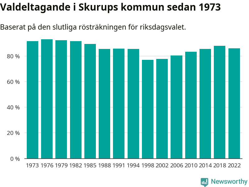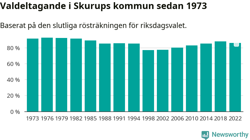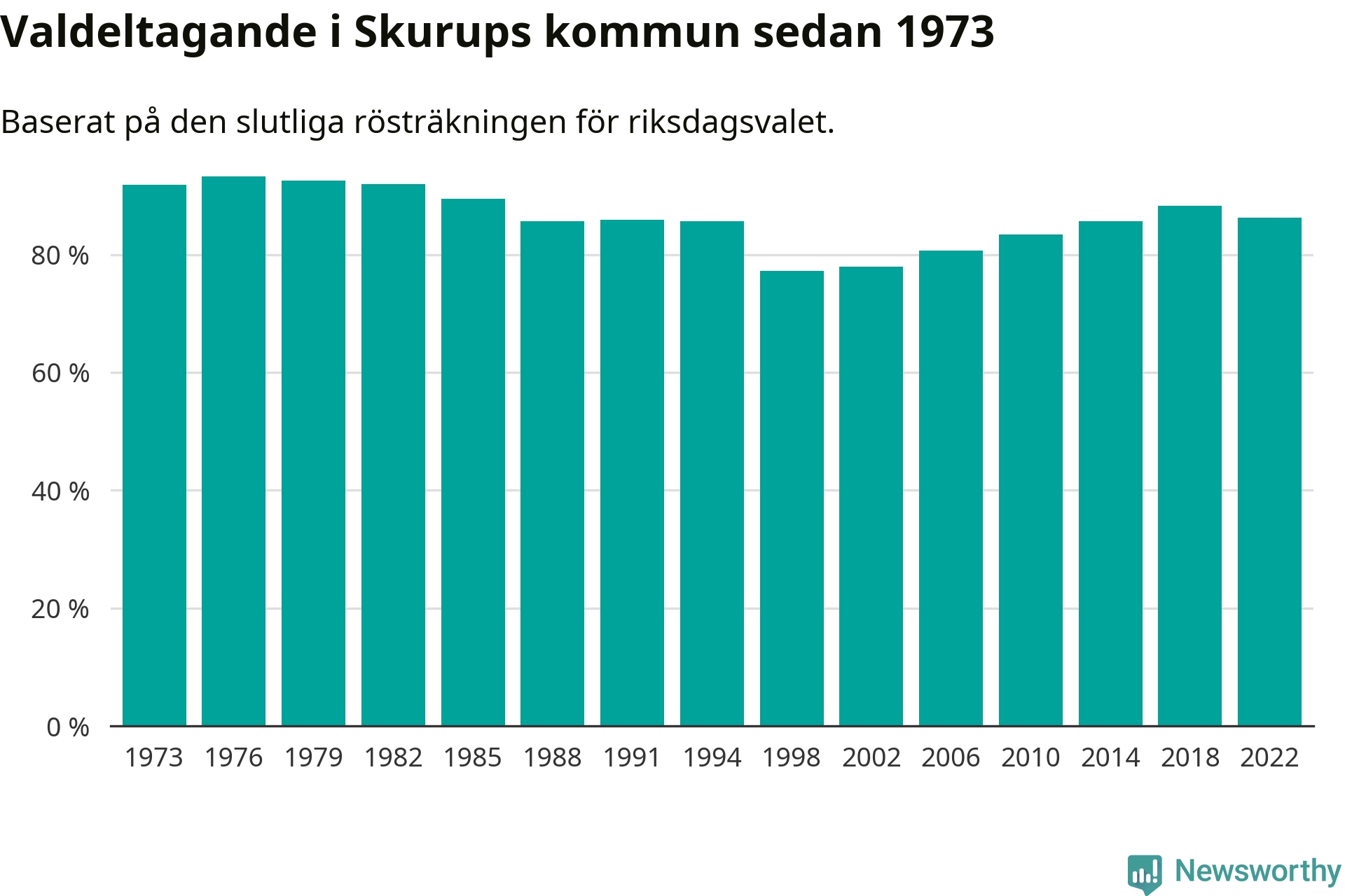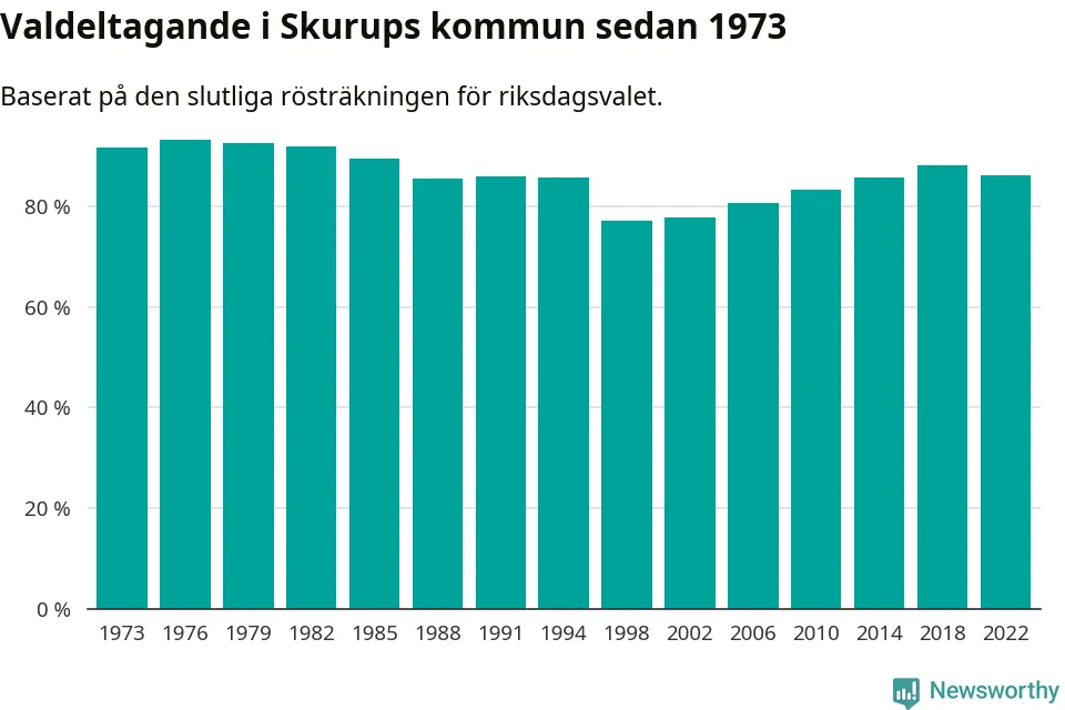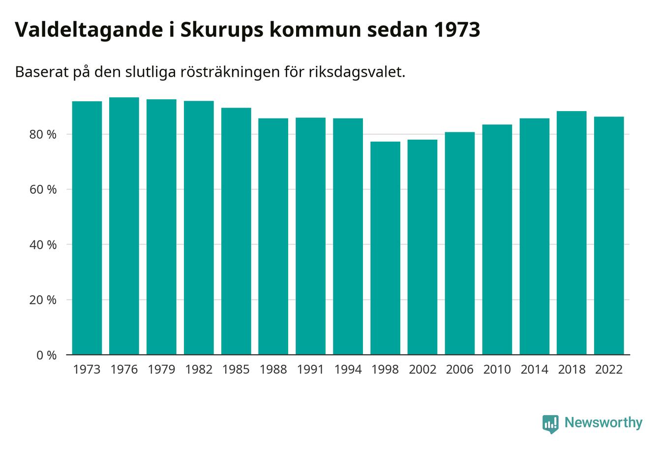 Skurup tillhör Skåne läns södra valkrets. Där var valdeltagandet förra valet 87,3 procent. I hela riket landade valdeltagandet 2022 på 84,21 procent, att jämföra med 87,18 procent 2018.