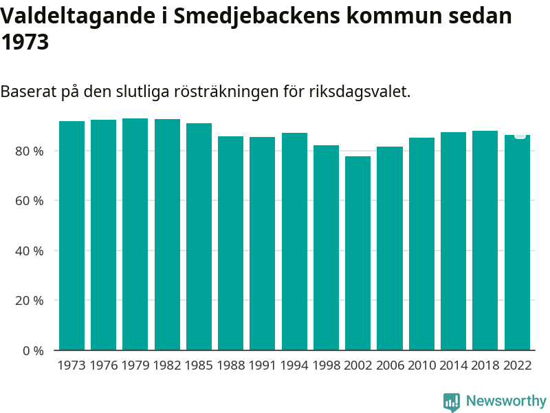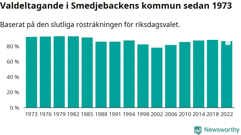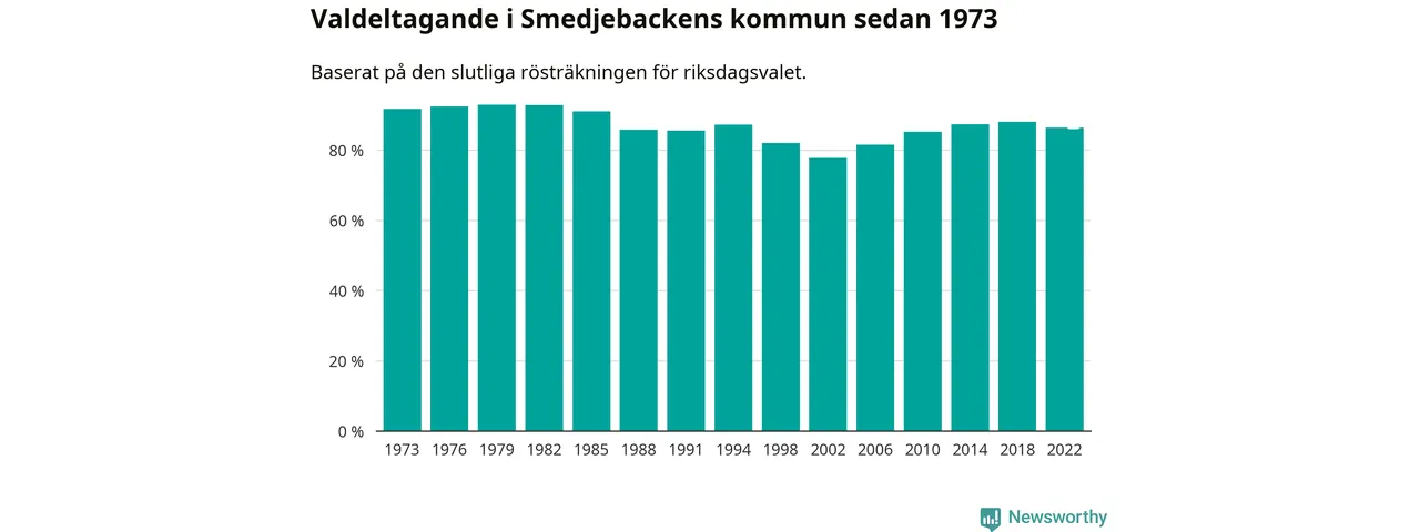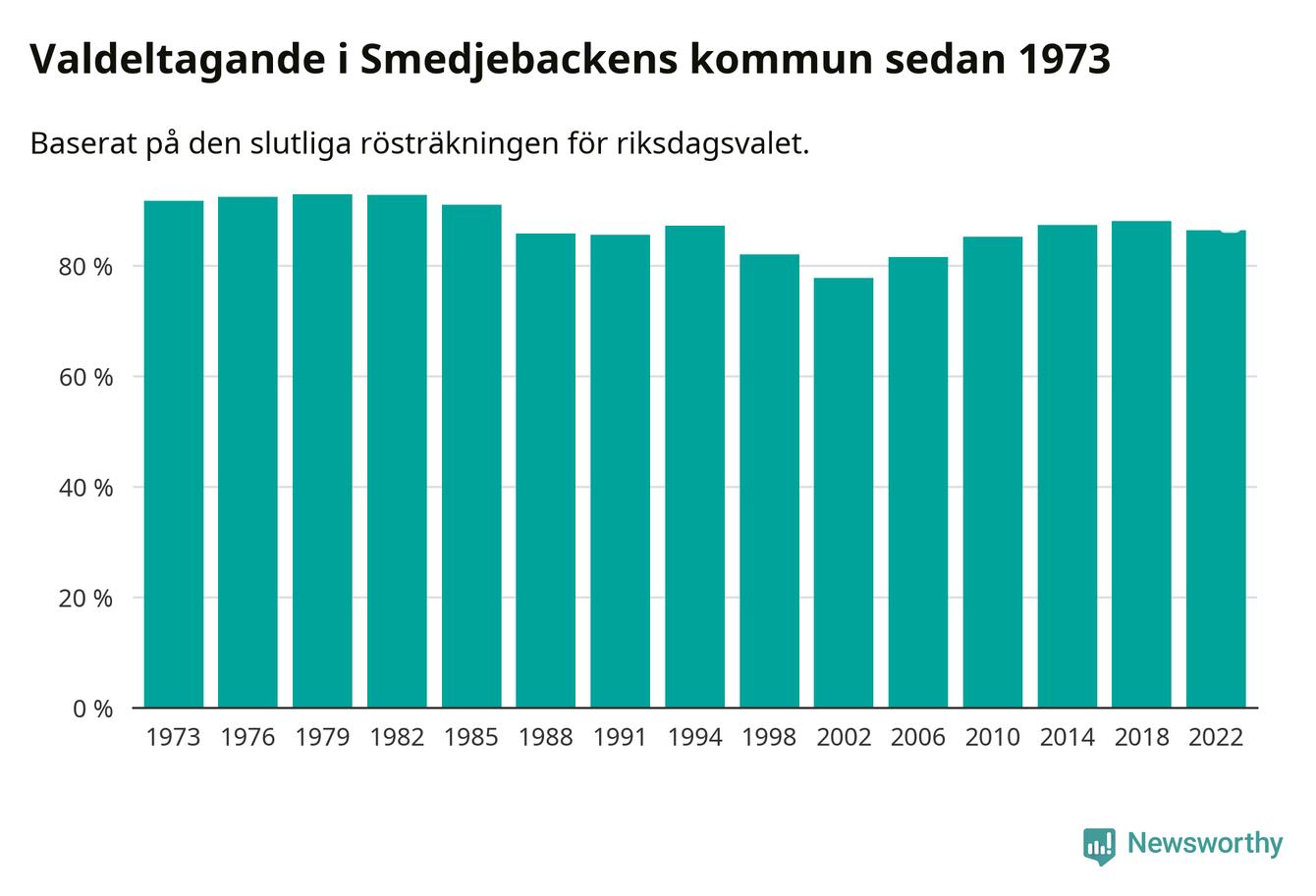 Smedjebacken tillhör Dalarnas läns valkrets. Där var valdeltagandet förra valet 85,4 procent. I hela riket landade valdeltagandet 2022 på 84,21 procent, att jämföra med 87,18 procent 2018.