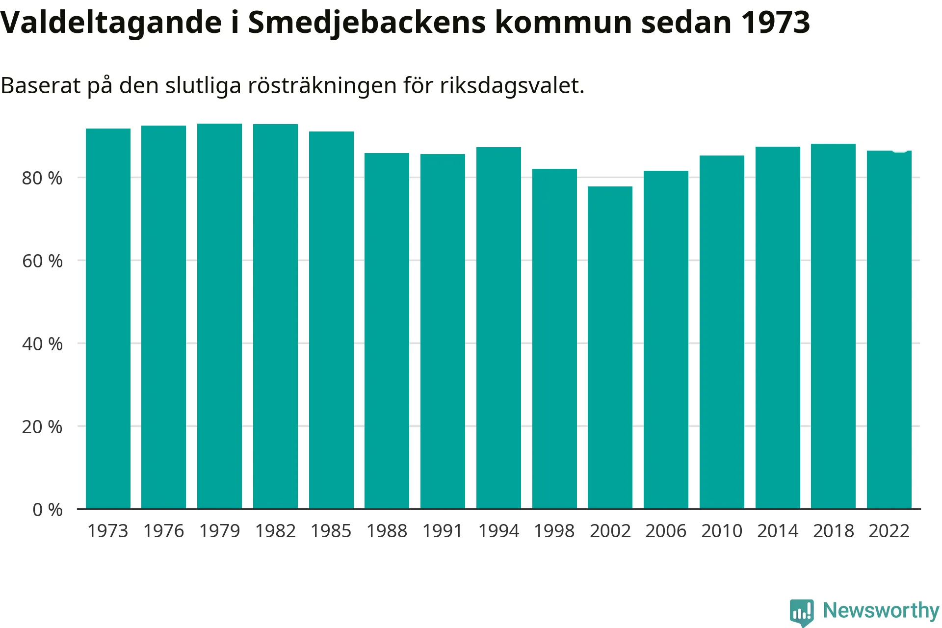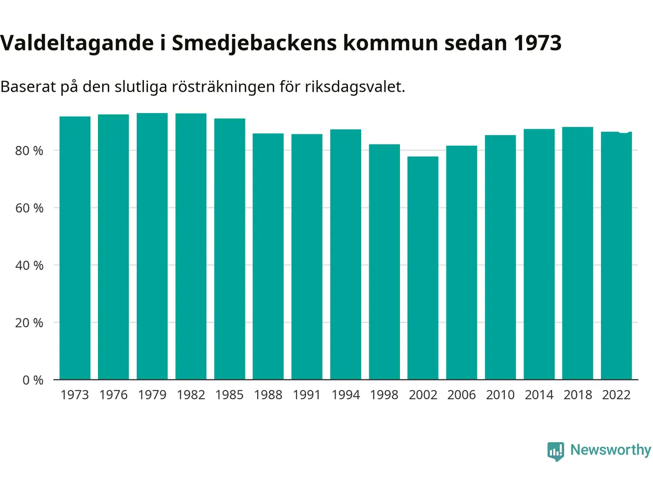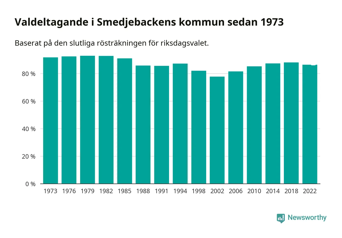 Smedjebacken tillhör Dalarnas läns valkrets. Där var valdeltagandet förra valet 85,4 procent. I hela riket landade valdeltagandet 2022 på 84,21 procent, att jämföra med 87,18 procent 2018.